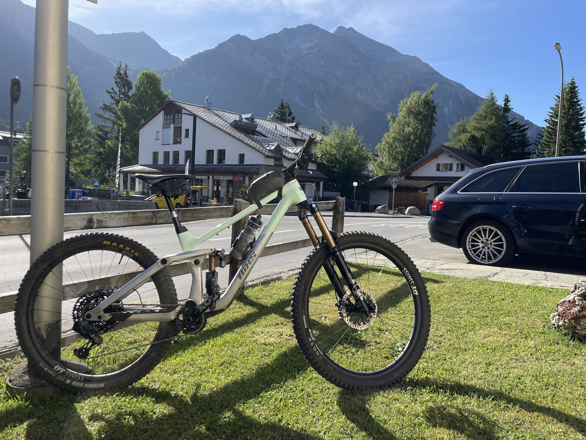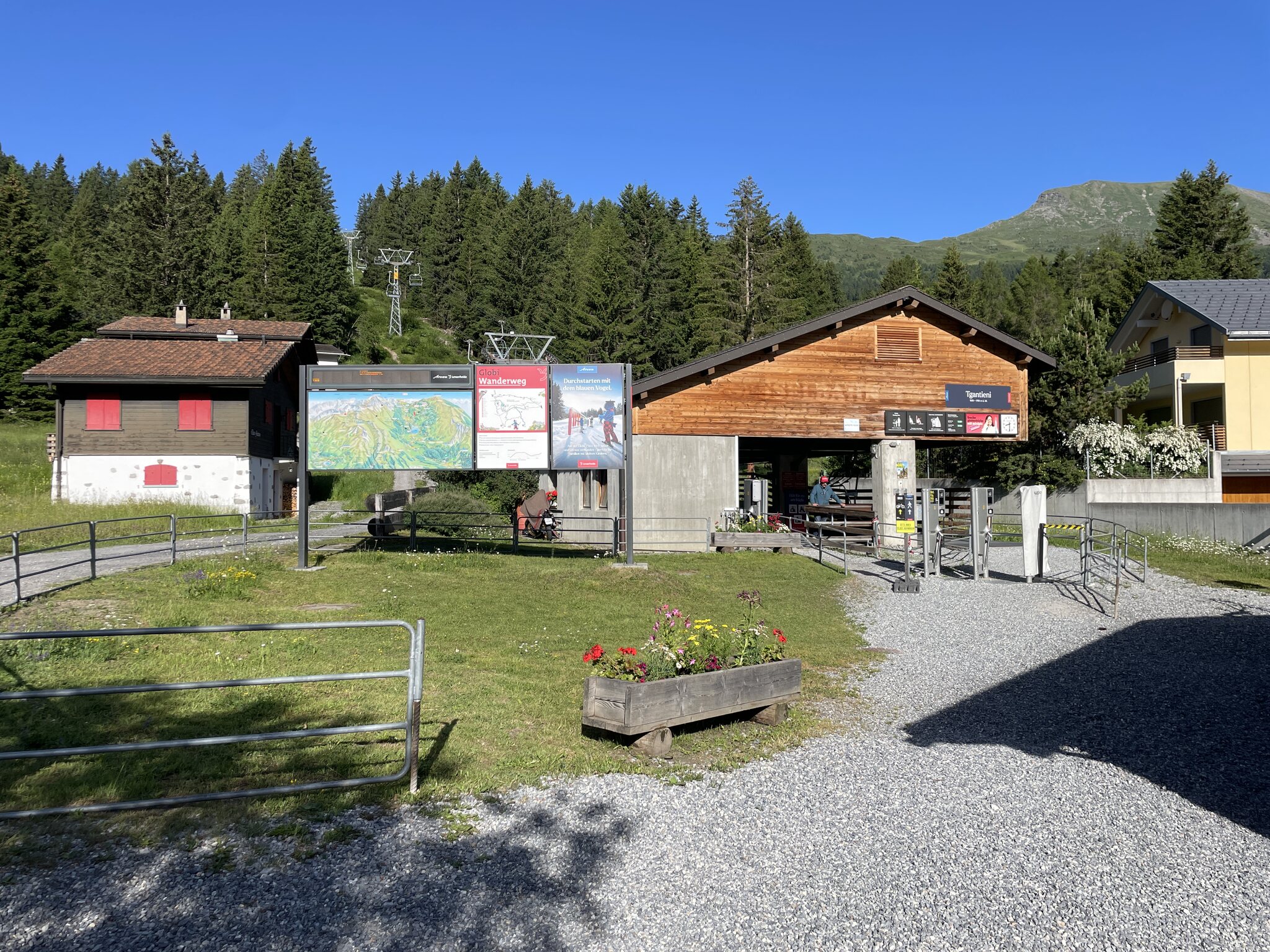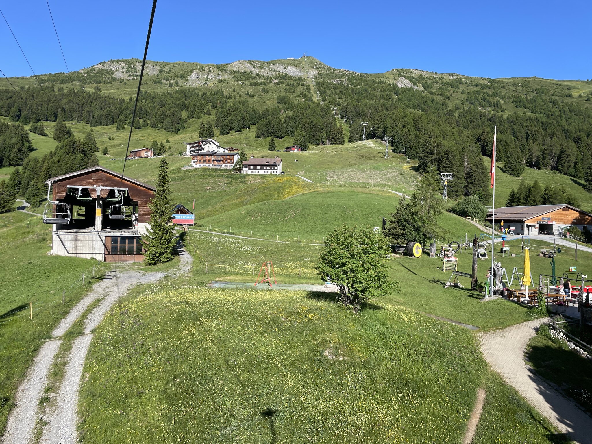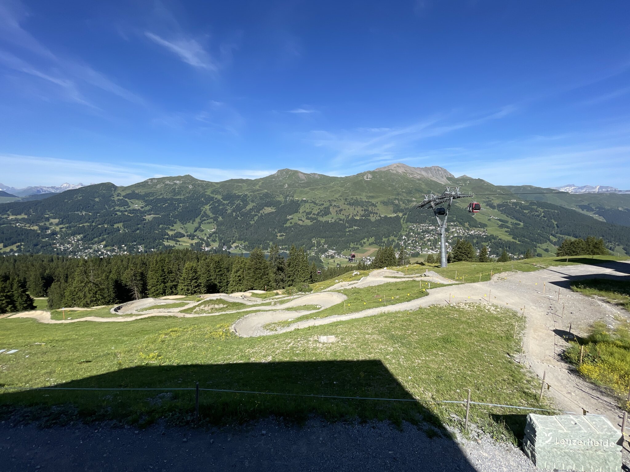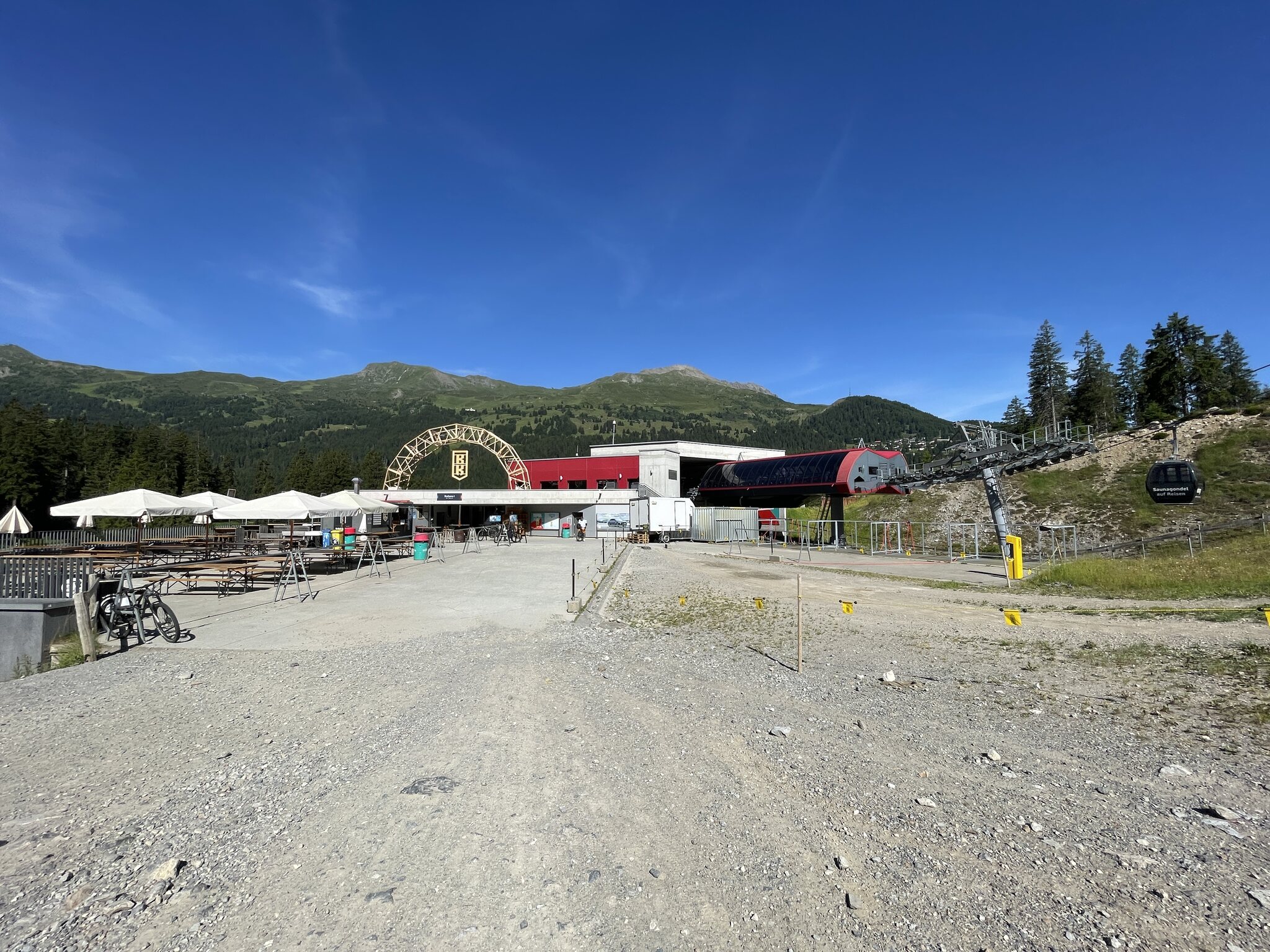 Kurz Reifen, Dämpfer und Gabel pumpen und bereit steht der „Drahtesel“: Direkt um die Ecke beginnt der fünfminütige Anstieg… …zur Talstation der Sesselbahn Tgantieni… …mit welcher ich jetzt gemütlich hochlifte. Gleich geht es auf die zweite Sektion, die KSB Scalottas: Aussicht vom Piz Scalottas (2323 müM): Vom Gipfel führt ein Trail weg, der sich nach kurzer Zeit in einen einfacheren und anspruchsvolleren Teil gabelt. Während der schwierigere Trail zurück nach Tgantieni führt, nehme ich den blauen, relativ flachen Flowtrail mit dem Namen „Scalottas Nord“. Über diesen fahre ich zur Alp Nova…. …und dort über die Kiesstrasse zur Talstation Lavoz: Hier beginnt eine nicht ganz einfache, steile aber sehr coole Abfahrt über Spoina zum Heidsee.