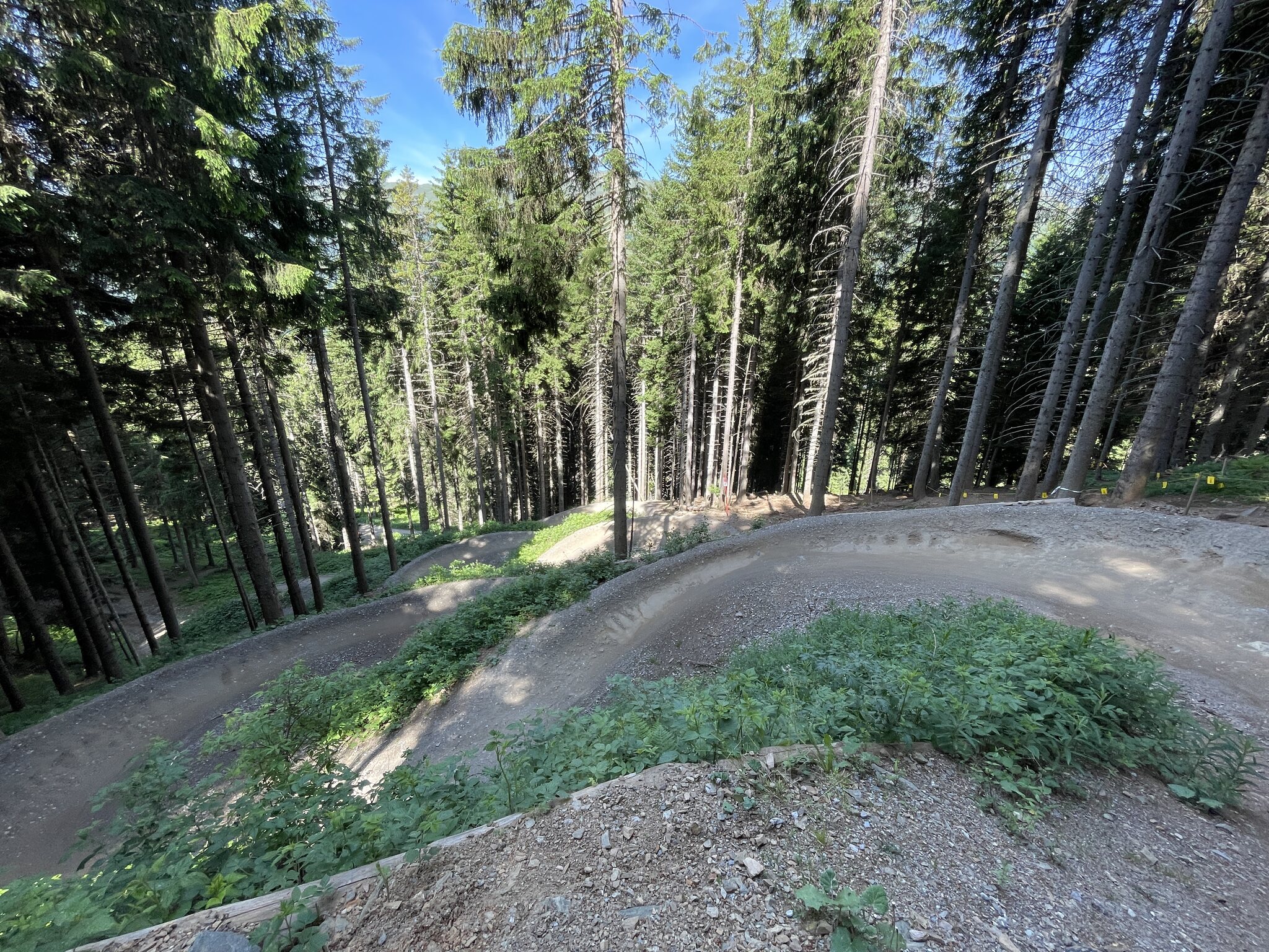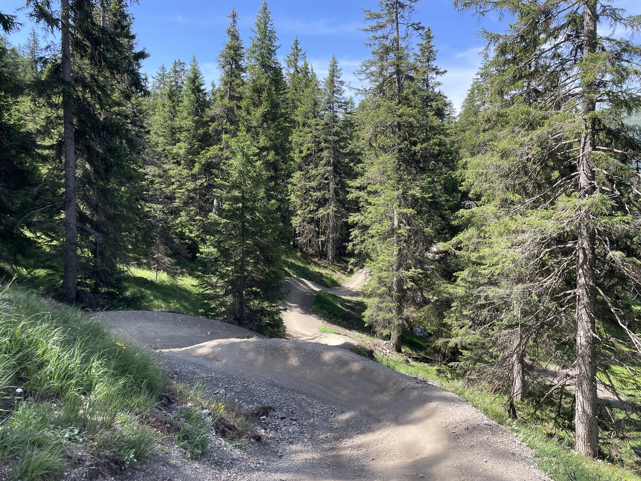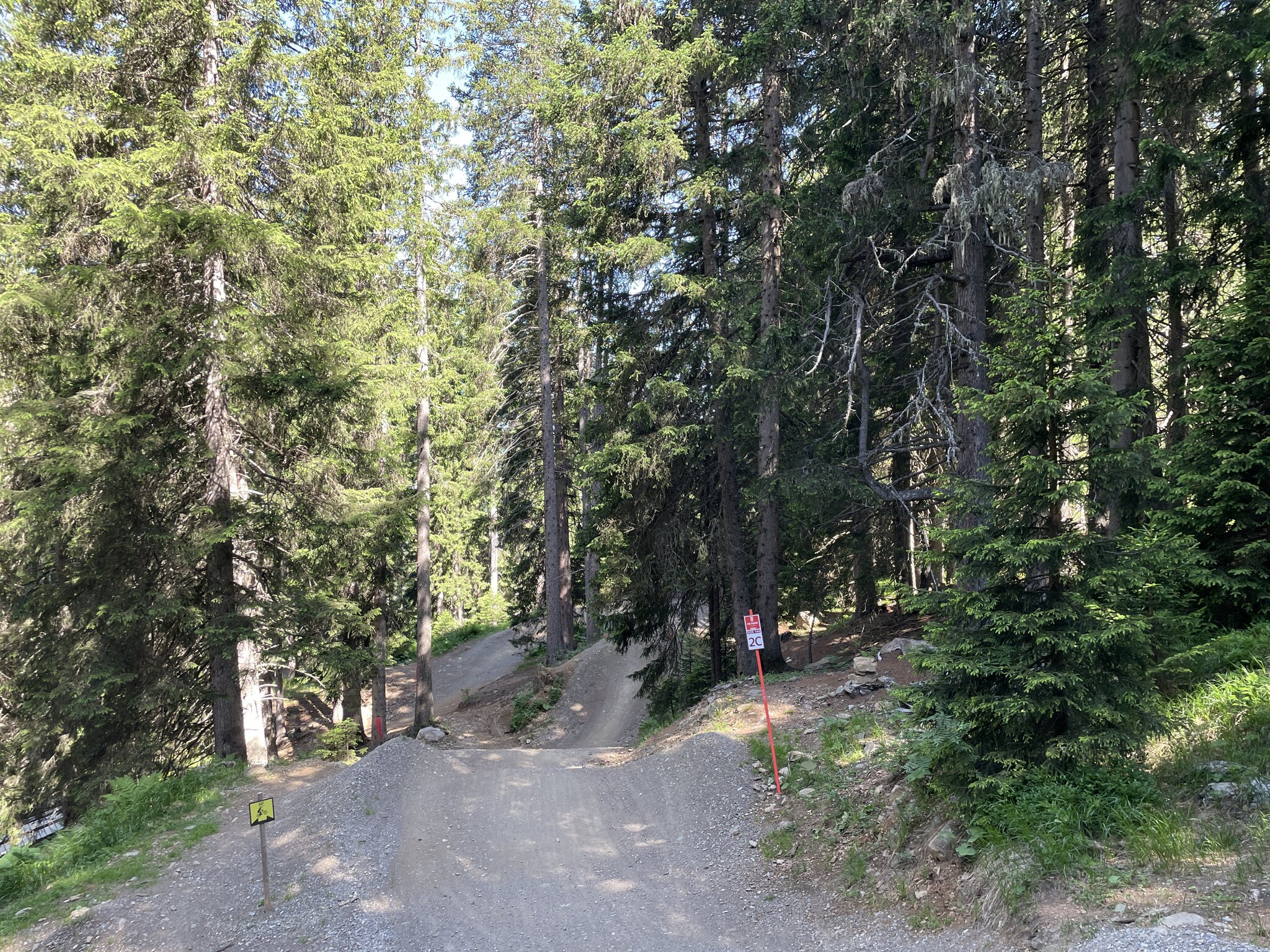 Wegen der Licht- und Schattenberhältnisse konnte ich keine schlauen Fotos schiessen im Wald. Einigermassen brauchbar sind folgende Aufnahmen: Der See war hingegen fotogen: Mittlerweile sitze ich in der Gondelbahn Scharmoin. Wenn man weiss, wie viele Leute an den Wochenenden im Bikepark sind (bei Interesse: Die Webcam Talstation Rothorn anschauen), ist es heute gespenstisch leer Auch an der Bergstation herrscht absolut tote Hose: Im Park machte ich vier Abfahrten. Gegen halb 11 Uhr gab es doch einige Leute. Aber es war noch immer leer. So leer, dass ich seit längerer Zeit wieder einmal die rote Strecke gefahren bin. Im Park habe ich nicht viele Bilder gemacht, eine kleine Auswahl: Mittlerweile bin ich wieder zuhause. Erstens ist es mir auch hier zu heiss und zweitens ruft die Arbeit.
