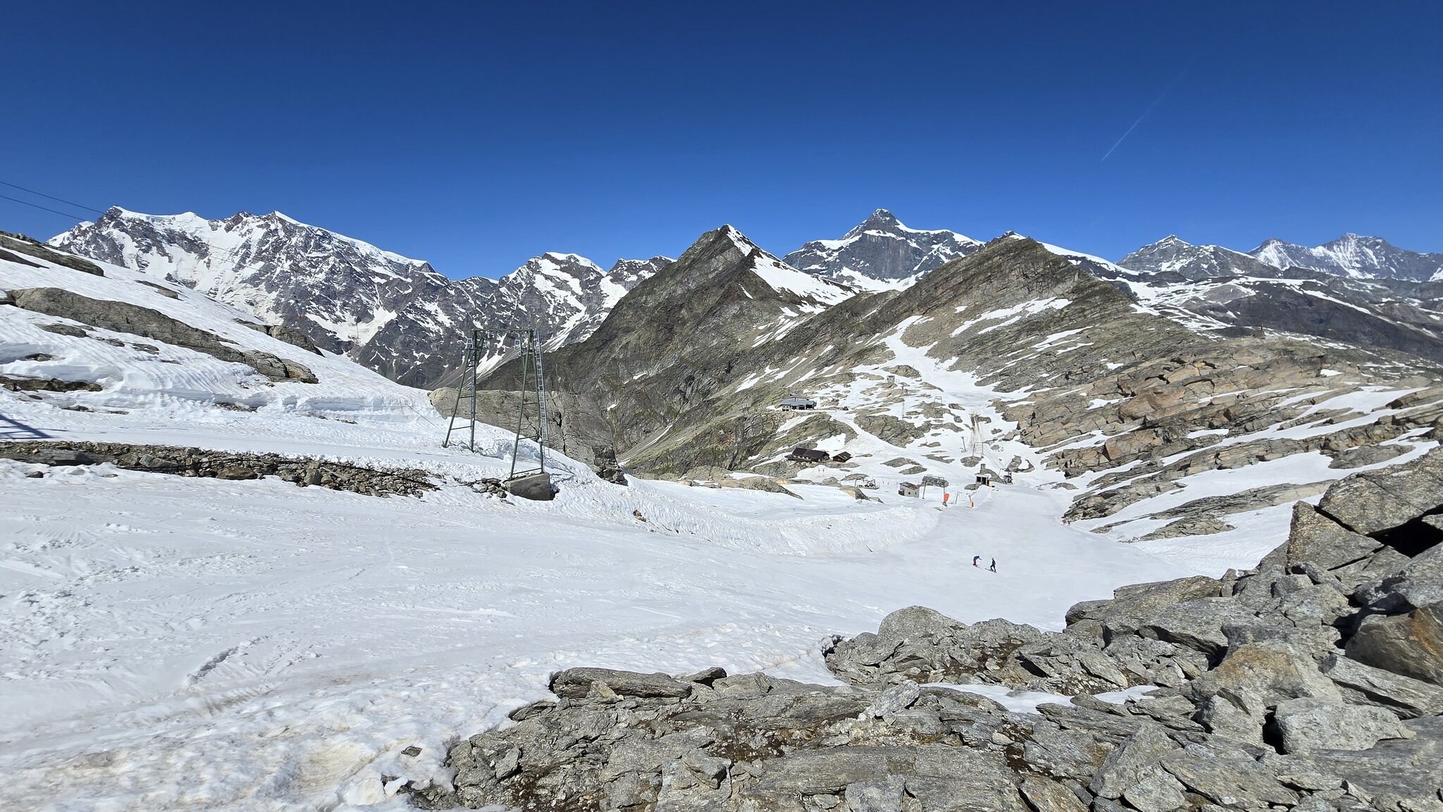 Mit den beiden betagten Seilbahnen ging es in zwei Etappen nach oben. Auf knapp 2900 Metern hüpfte ich in die Skihose und stand kurze Zeit später am Einstieg des Skilift San Pietro. Ein altgedienter Italiener aus der Kategorie patinierter Charme. Knapp 350 Meter zieht er seine Linie durch Geröllfelder, Firnreste und eine Szenerie, die den Atem raubt. Die Aussicht war schlicht bombastisch. Und man fragt sich, wie das wohl im tief verschneiten Winter aussieht. Die Piste präsentierte sich in erstaunlich gutem Zustand – breit angelegt, gleichmässig präpariert und mit zunehmender Wärme langsam aufweichend. Offenbar gibt es noch eine zweite Variante, die sich weiter oben zur Schweizer Grenze hin ausweitet. Sie wird im Sommer nicht präpariert, ist aber durchaus befahrbar. Der Andrang hielt sich äusserst in Grenzen, nur eine Handvoll Skifahrer war unterwegs, selten mehr als zwei oder drei gleichzeitig auf der Abfahrt. Zwischen zehn und zwölf zog ich meine Spuren in den perfekten Firnteppich, ein fast schon meditatives Erlebnis.