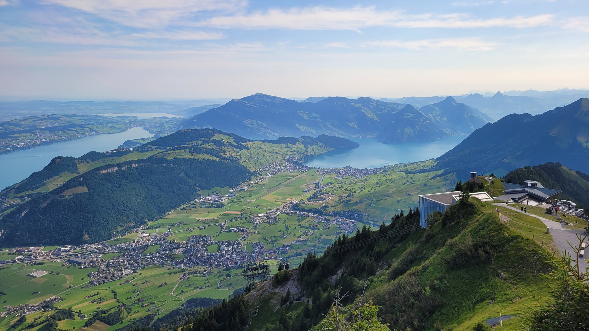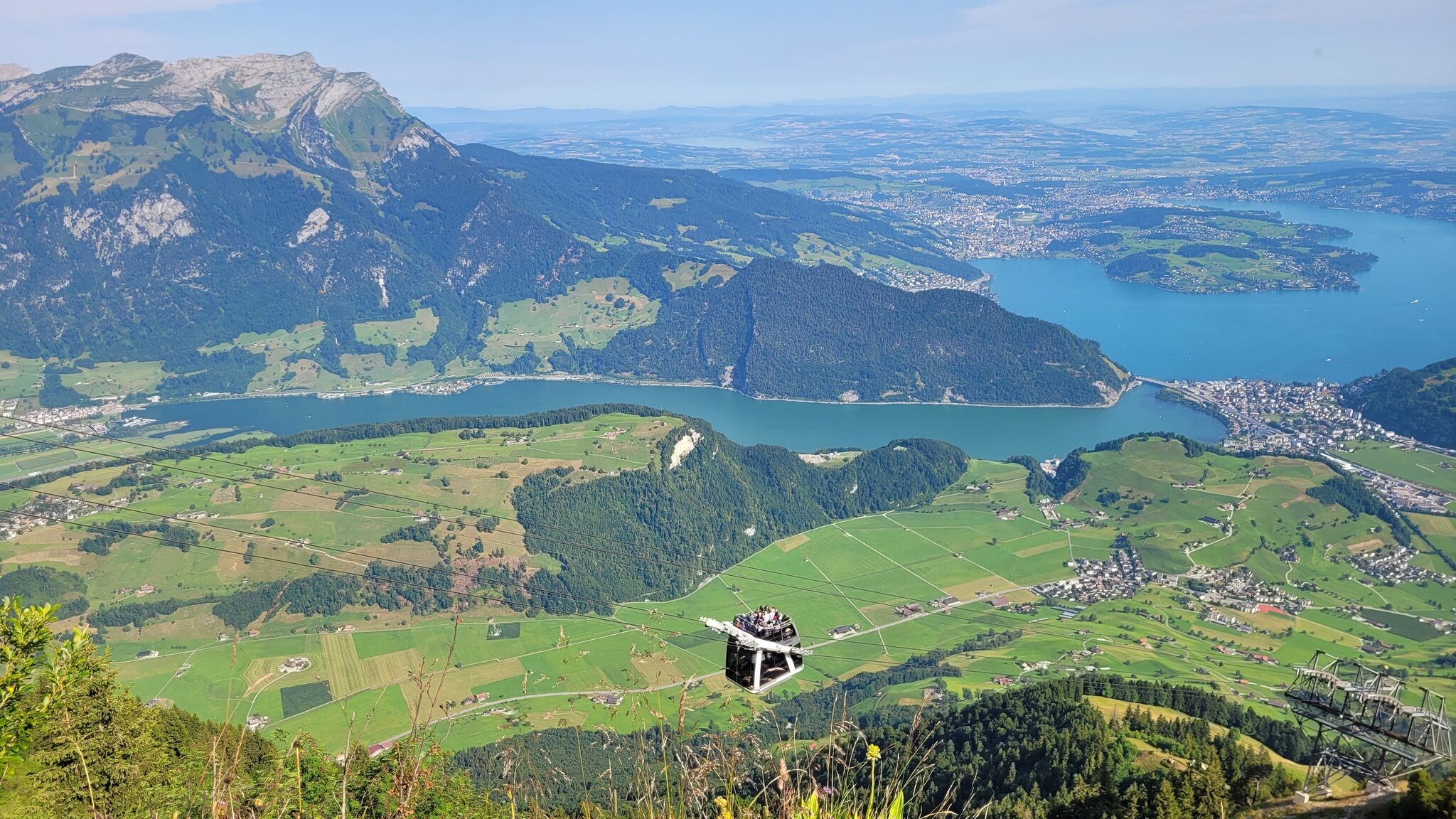 Oben bietet sich ein sensationelles Panorama in alle Richtungen. Der Blick hinab zum Flughafen Buochs und dem Bürgenstock: