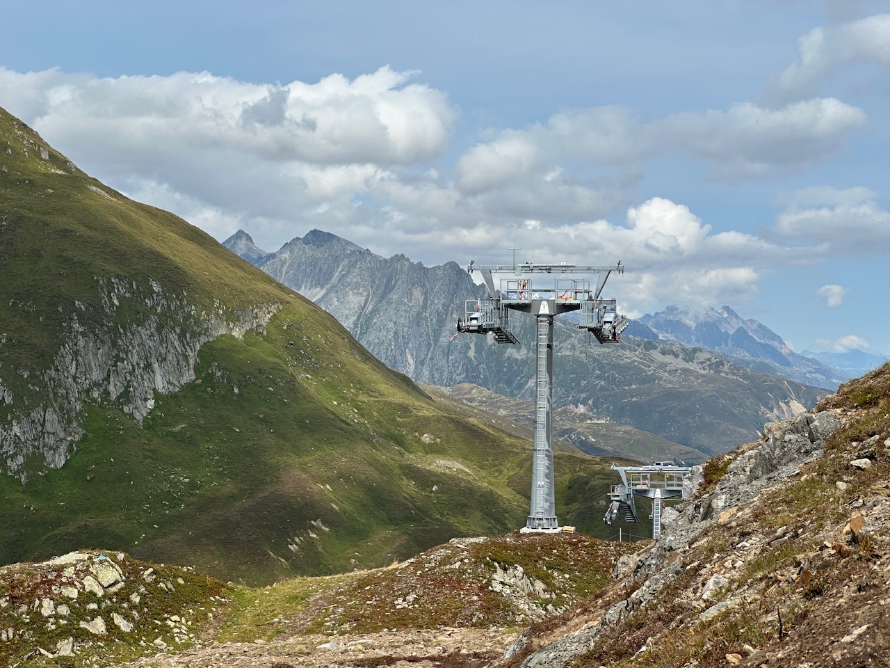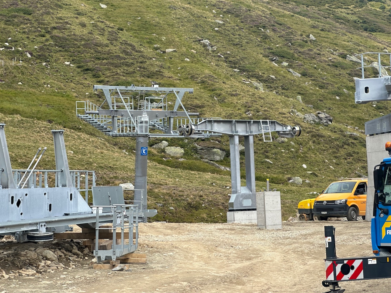 Vielleicht täuscht die Perspektive, aber es wirkt, als würden die Stützen der neuen Sesselbahn in einer aussergewöhnlich starken Neigung stehen, wirklich beeindruckend.