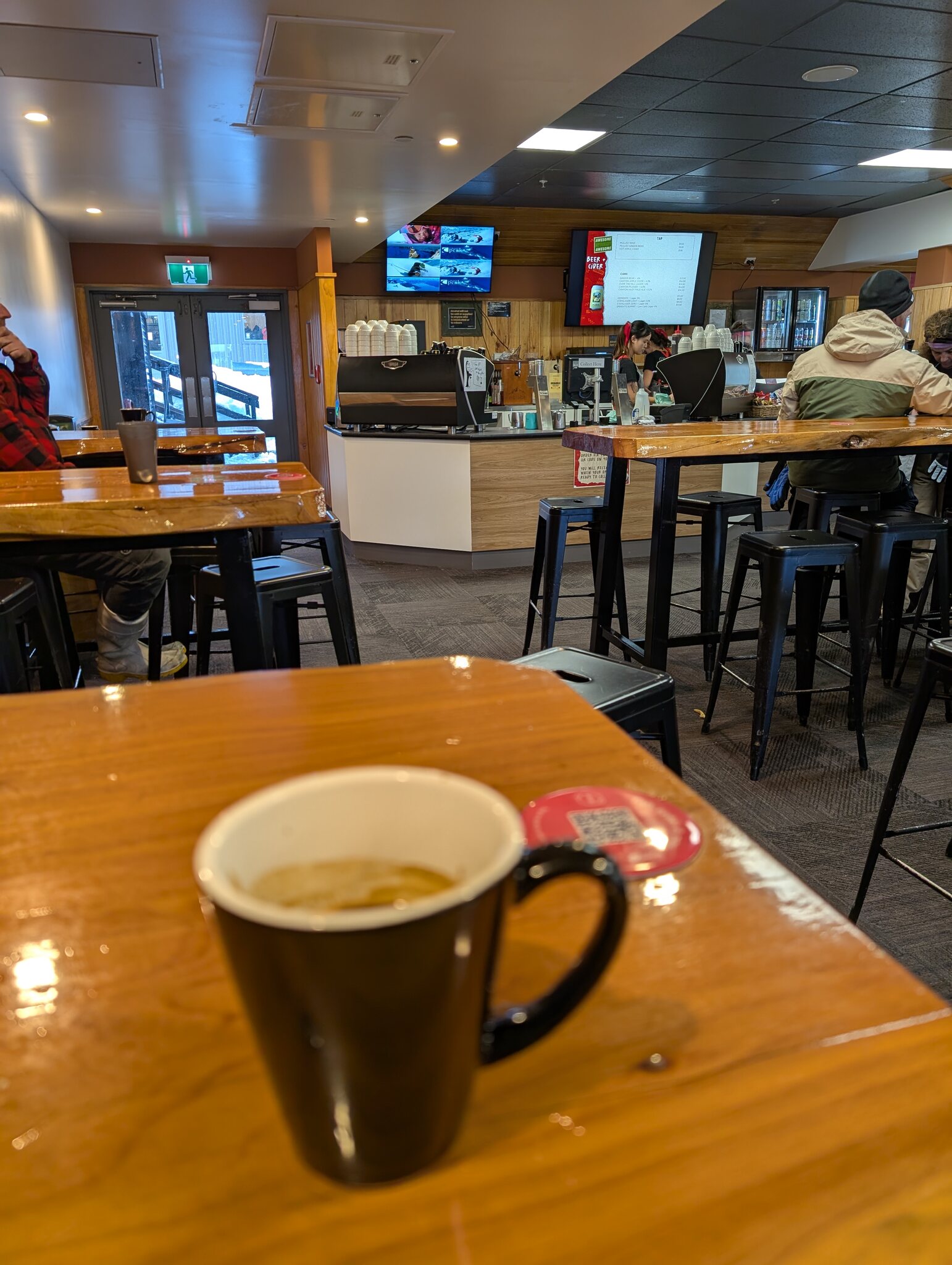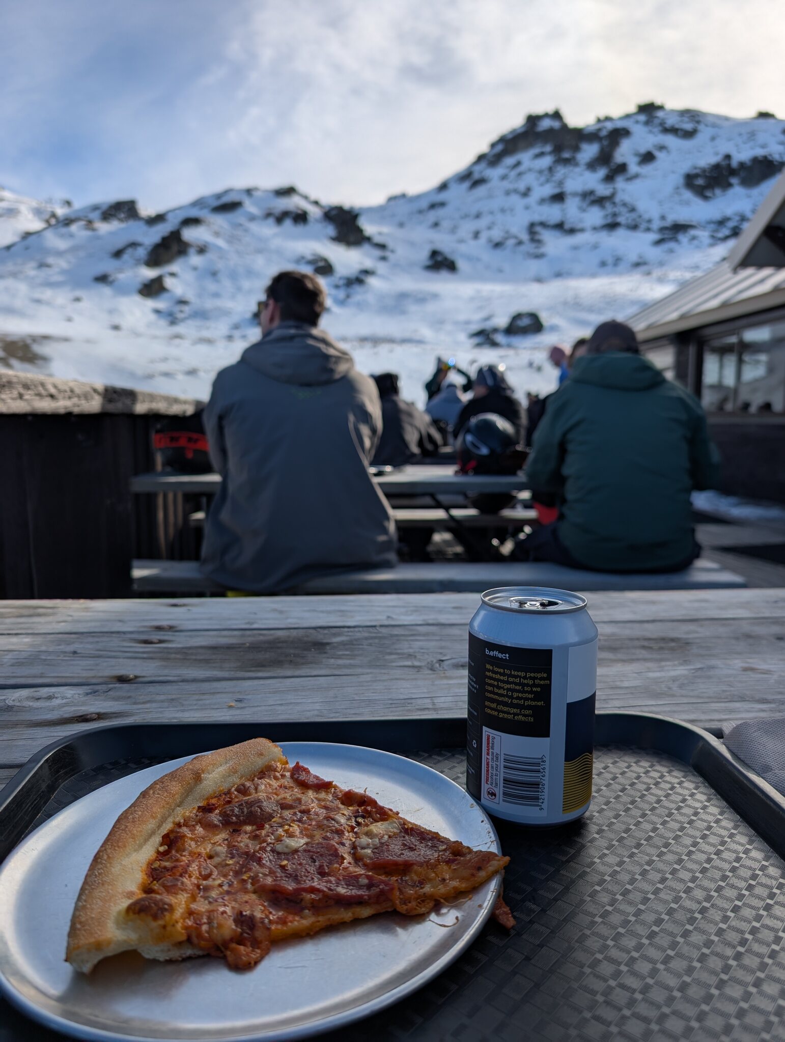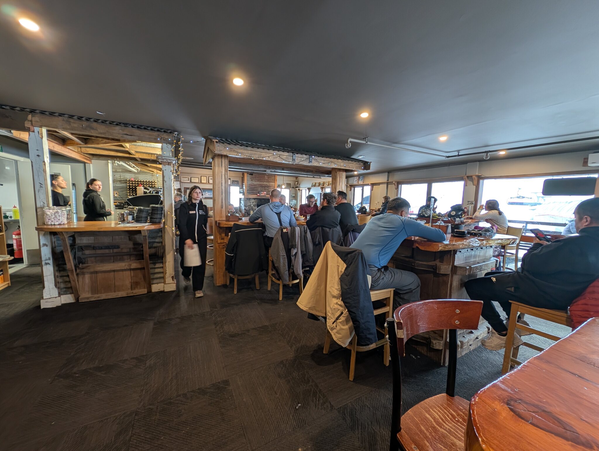 Ebenfalls wieder sichtbar, aber weiter entfernt ist der Taranaki. Die Gondel war nur für Sightseeing geöffnet und während der Fahrt kann man sich am Handy noch eine Erklärung dazu anhören. Die Piste unter der Gondel sieht schon einigermassen gut aus, aber halt noch nur für Mitarbeiter geöffnet Dafür ist das schöne Bergrestaurant mit der grossen Fensterfront zu den Pinnacles für alle geöffnet. Kulinarisch hält das Restaurant nicht mit dem Freddies in Turoa mit, aber optisch natürlich super. Anscheinend öffnen morgen oder spätestens am Samstag sowohl in Turoa als auch in Whakapapa einige obere Lifte. Aber übers Wochenende sind die Skigebiete hier jeweils sehr gut besucht, und ich befürchte etwas, dass es auf den Pisten hier in Whakapapa sehr eng werden wird, da doch nur schmale Bänder gepistet sind. Ich überlasse deshalb das Gebiet bis am Montag wieder den arbeitenden Kiwis.