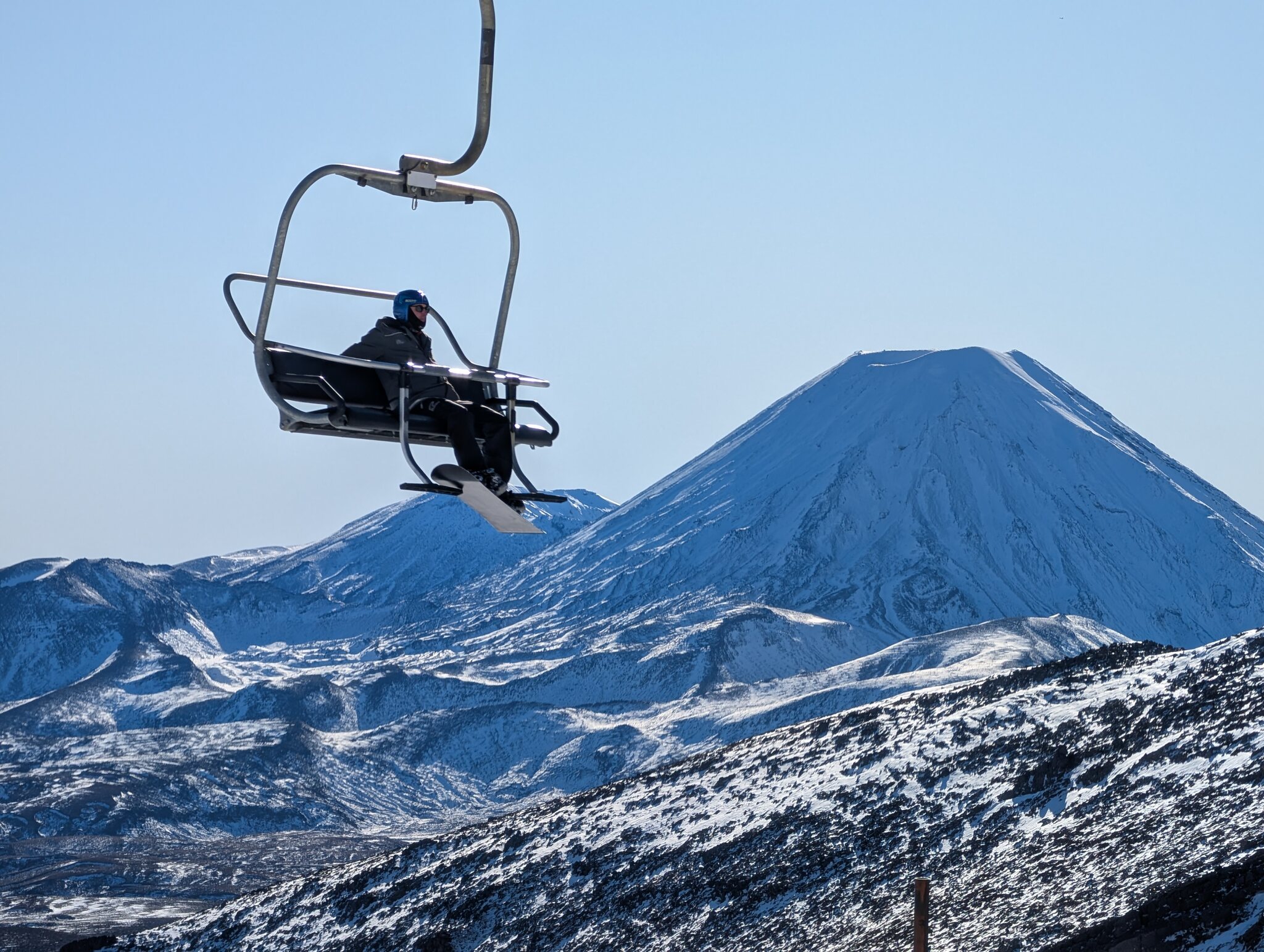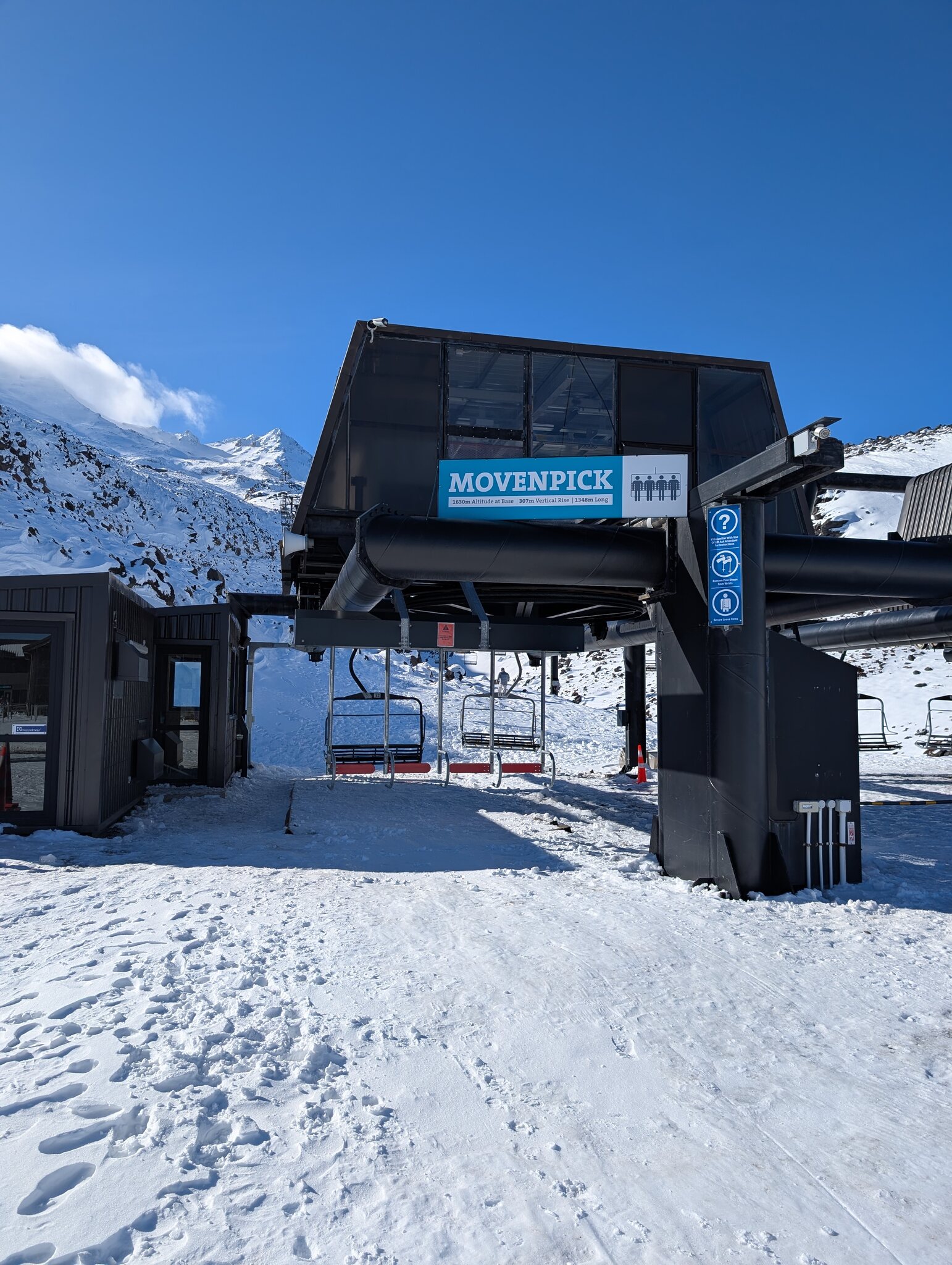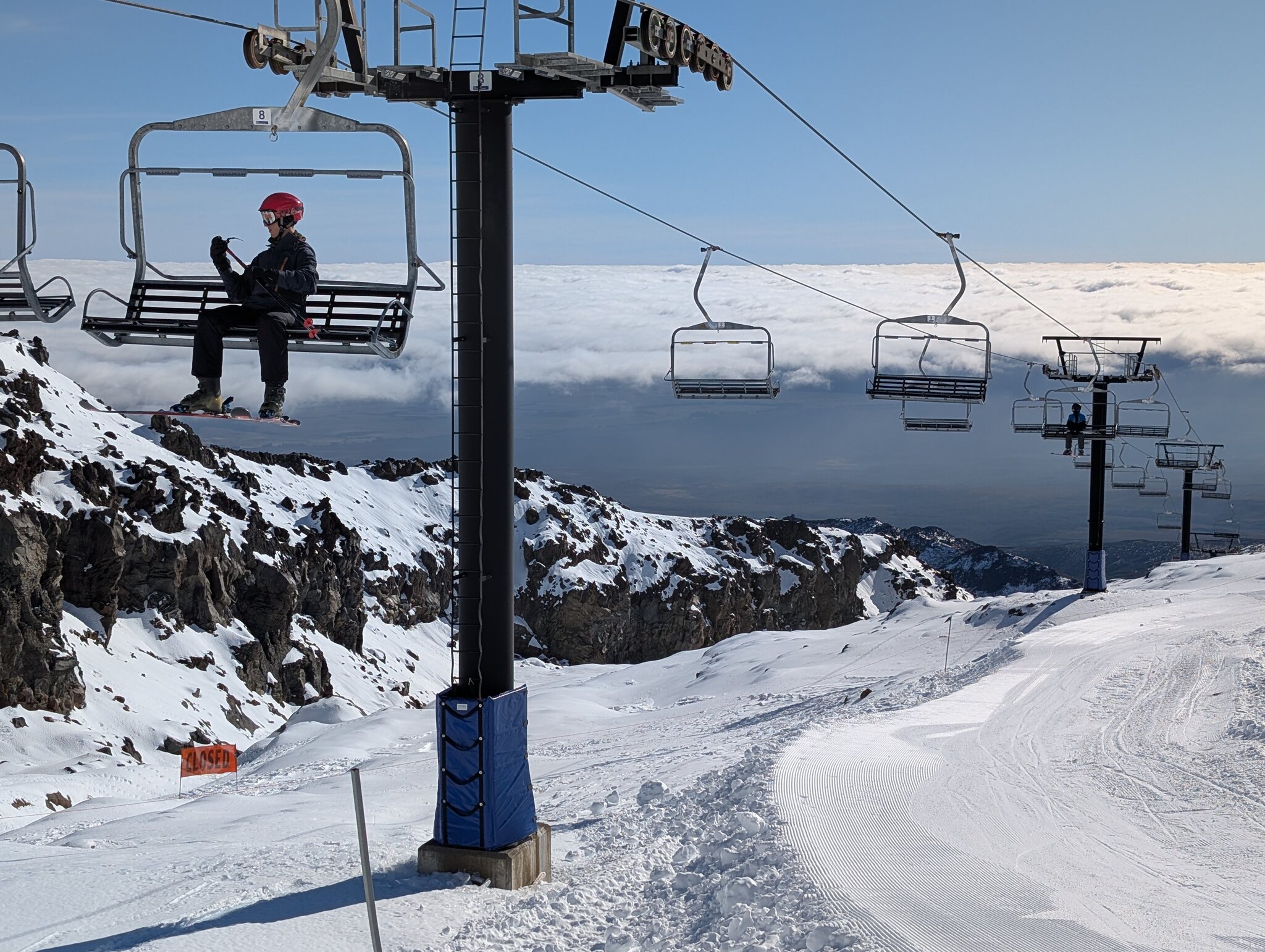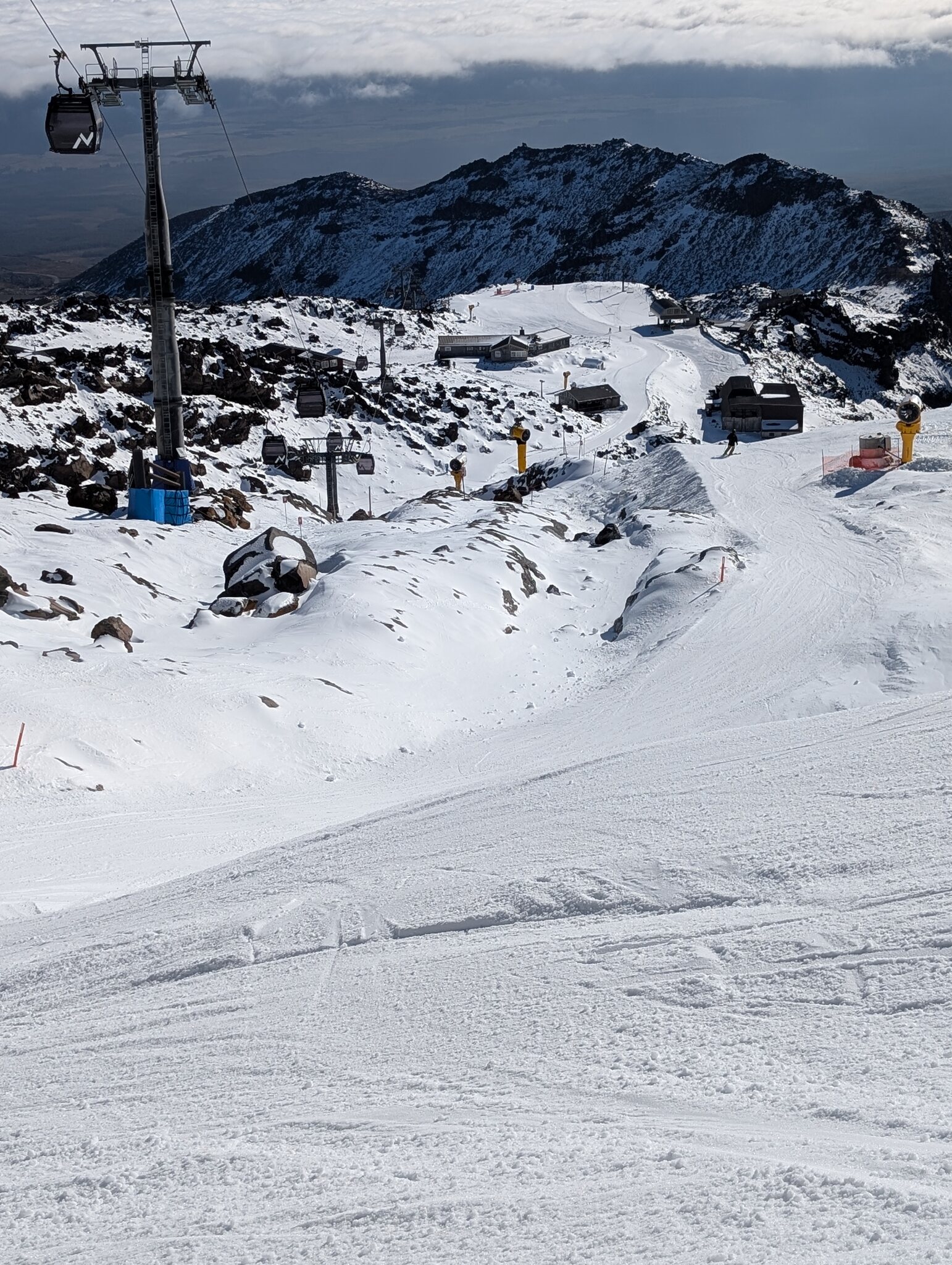 Bekannt ist das Skigebiet auch wegen der für neuseeländischen Verhältnissen luxuriösen Gondola. Daneben hat es 3 Skilifte und 4 ältere Sessellifte. Das Anfängergebiet erreicht man mit einer Liftfahrt (hinunter) von der Basis und es besteht aus einem kurzen Sessellift und Zauberteppichen. Vom "richtigen" Skigebiet war nur der unterste Rangatira Quad Chair und eine Piste offen. Aber das war für mich immerhin ein Fortschritt verglichen mit den 2 Tagen auf Turoa und reichte für das berühmte Zoombild Ngauruhoe und Sessellift.