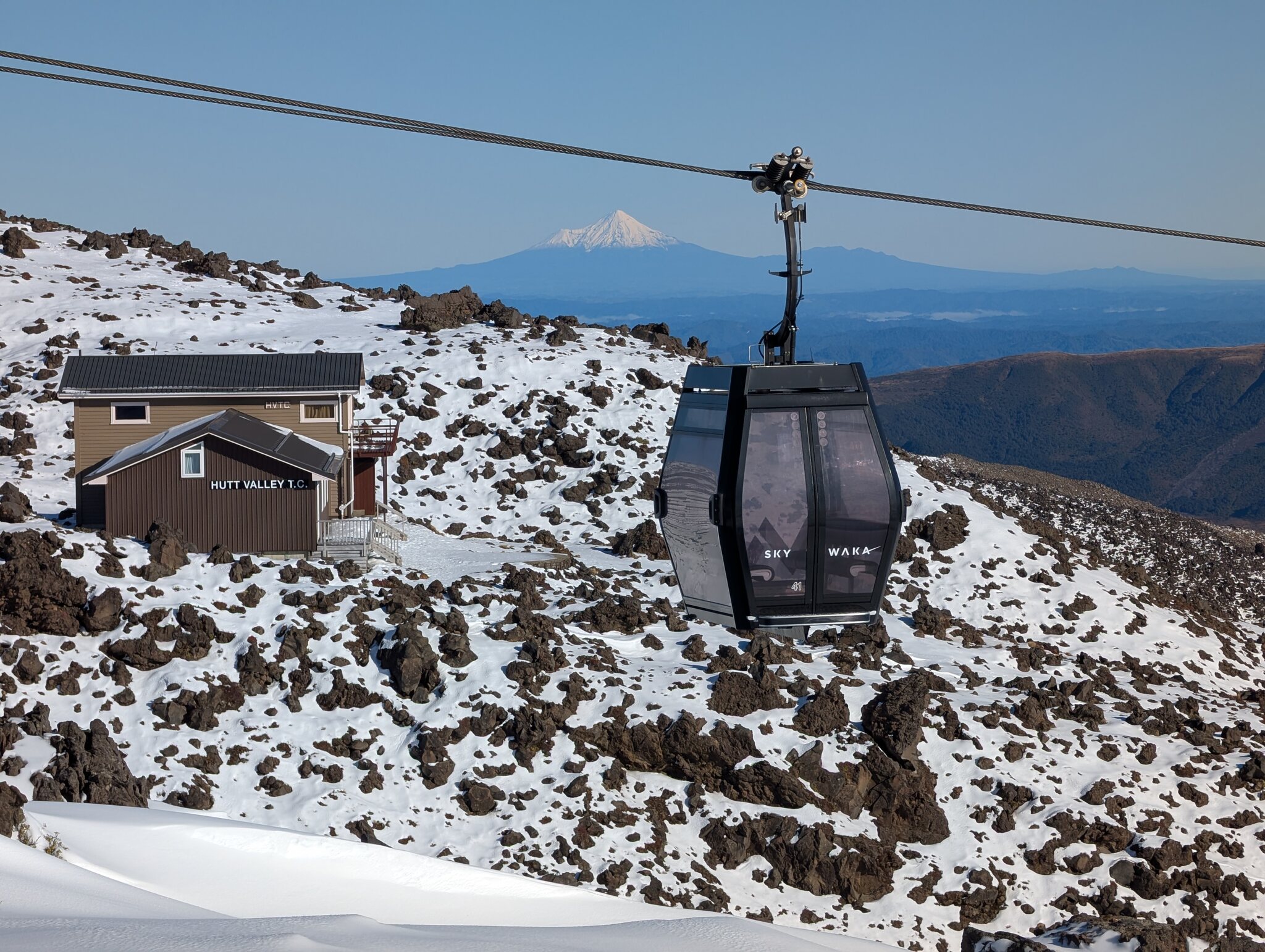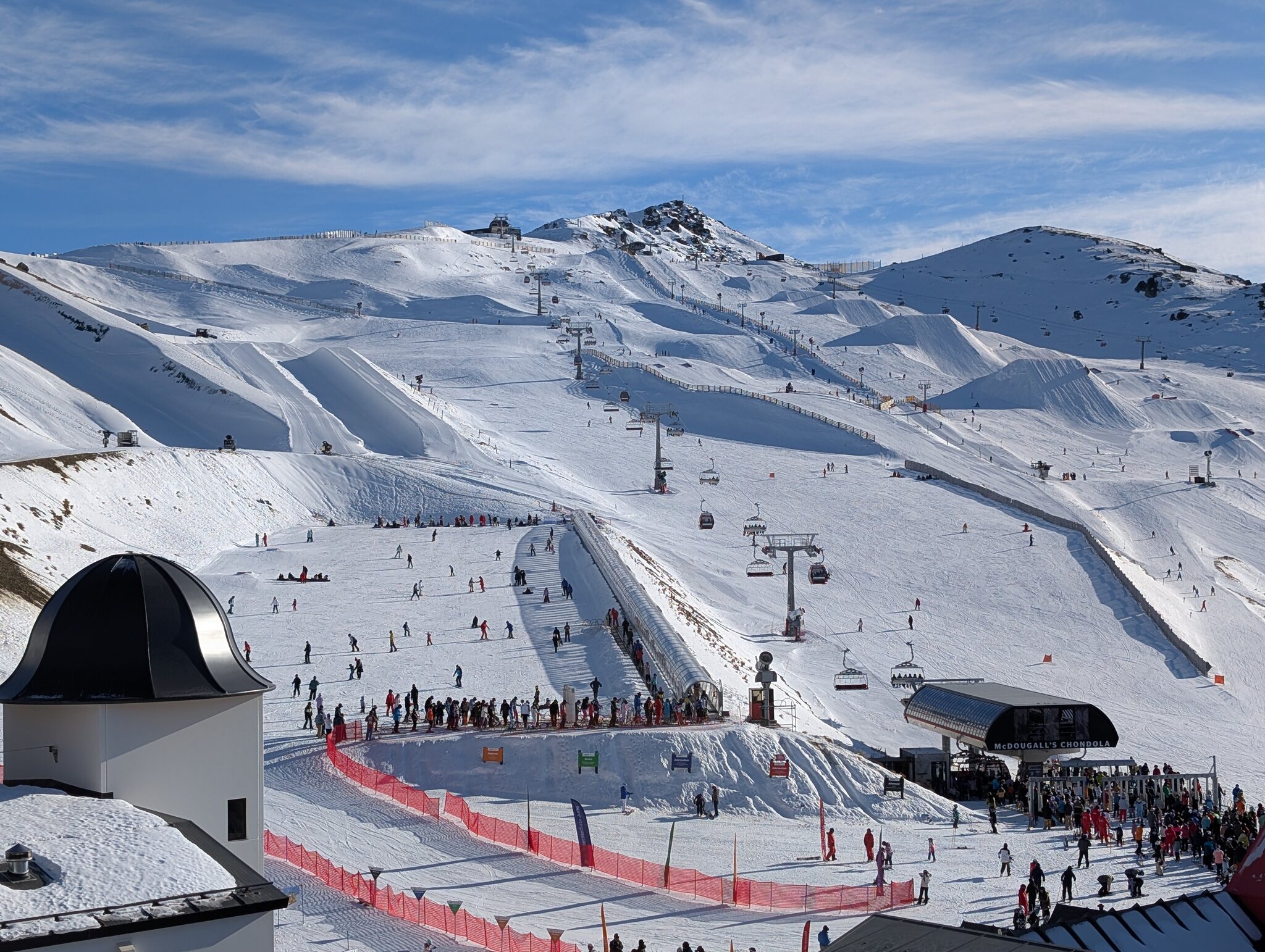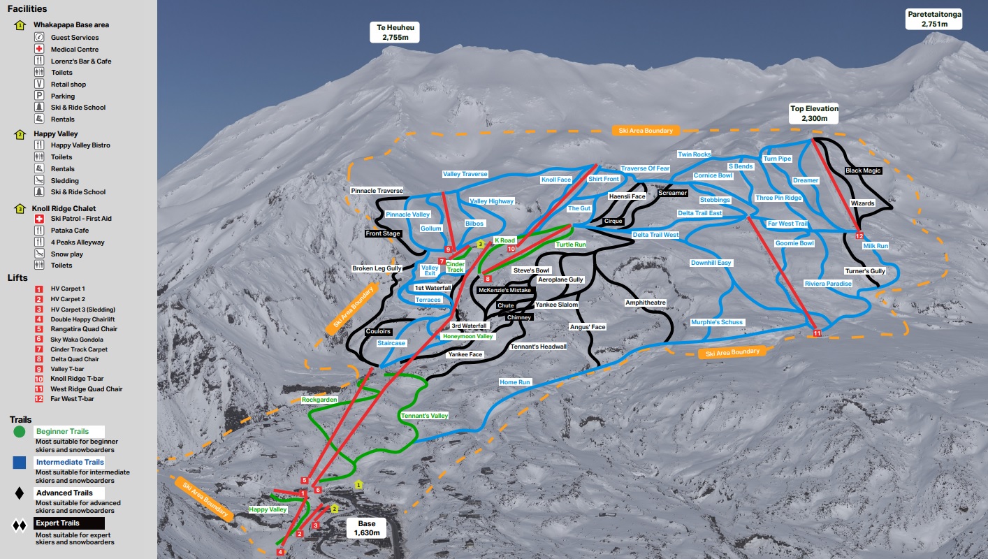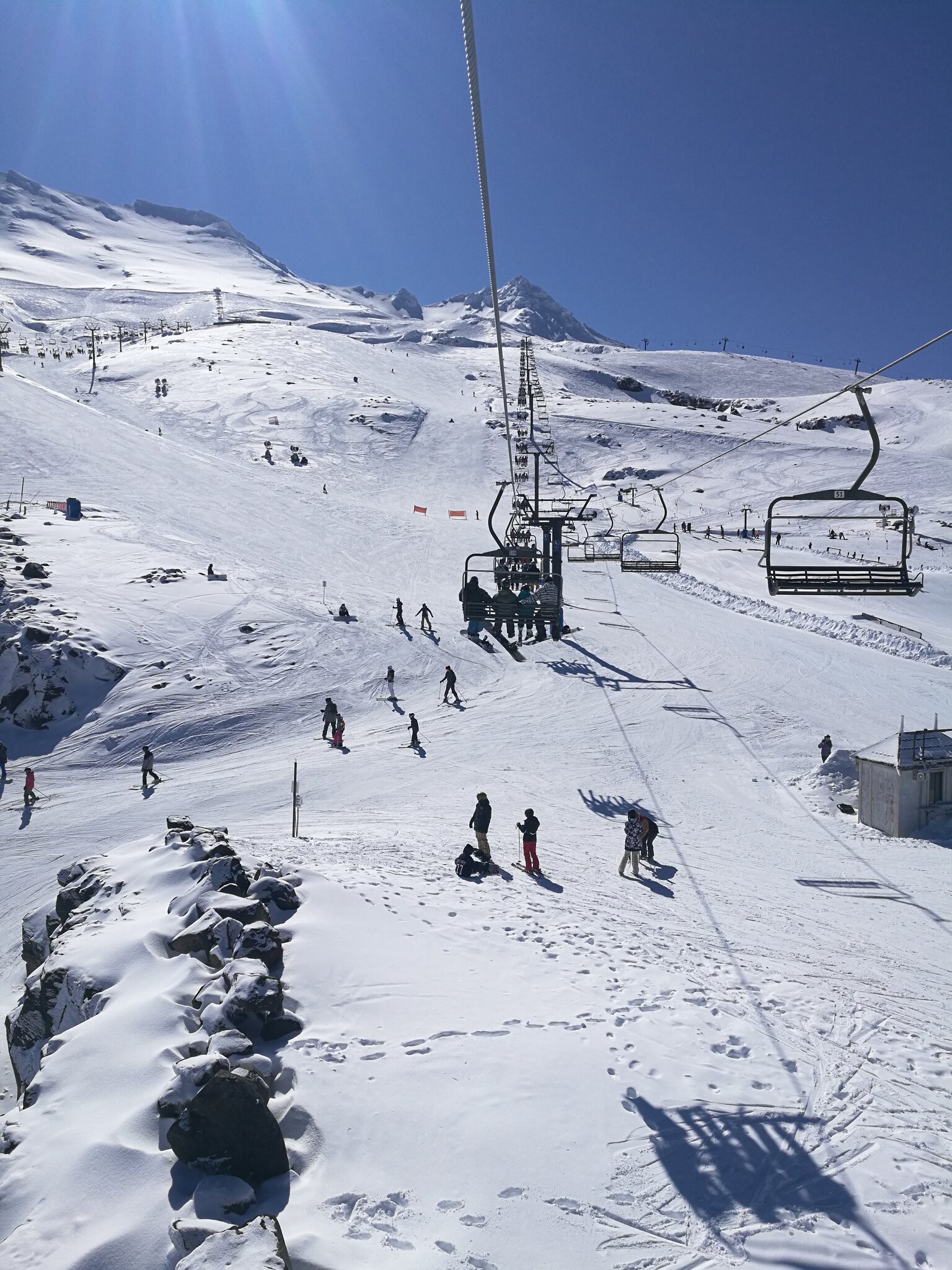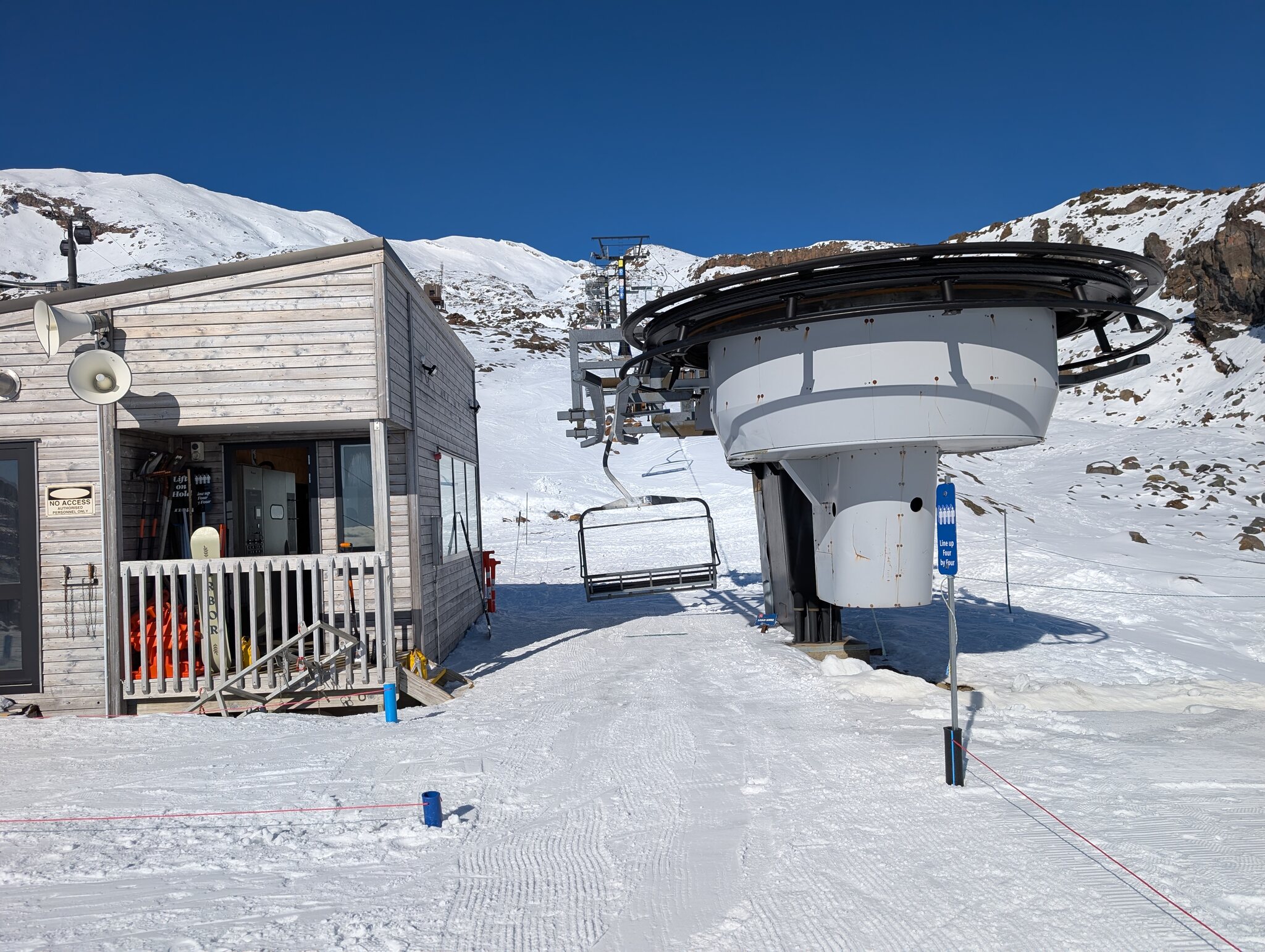 Bekannt ist das Skigebiet auch wegen der für neuseeländischen Verhältnissen luxuriösen Gondola. Daneben hat es 3 Skilifte und 4 ältere Sessellifte. Das Anfängergebiet erreicht man mit einer Liftfahrt (hinunter) von der Basis und es besteht aus einem kurzen Sessellift und Zauberteppichen. Vom "richtigen" Skigebiet war nur der unterste Rangatira Quad Chair und eine Piste offen. Aber das war für mich immerhin ein Fortschritt verglichen mit den 2 Tagen auf Turoa und reichte für das berühmte Zoombild Ngauruhoe und Sessellift.