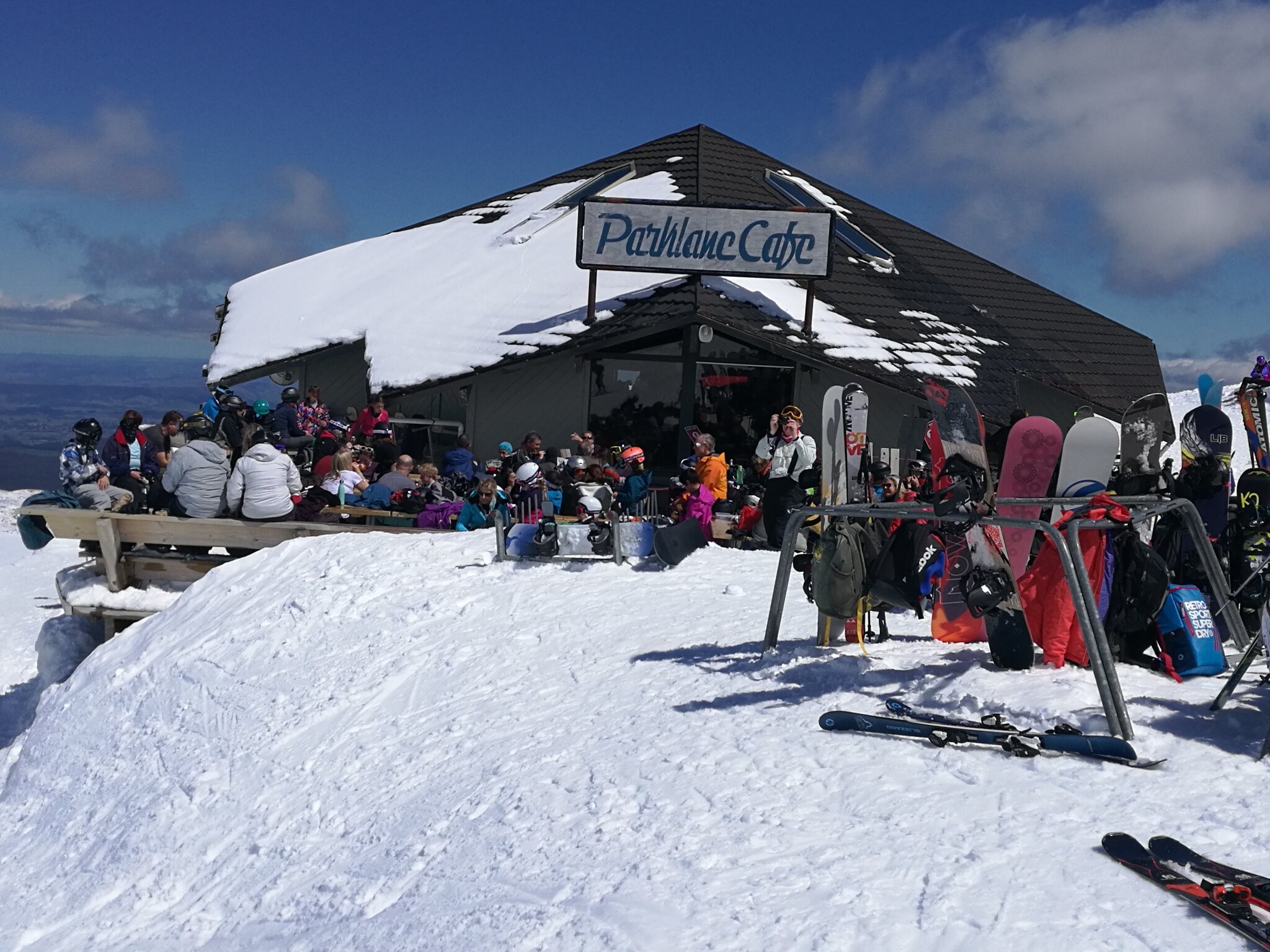 Auf Whakapapa haben viele Skiclubs eine Hütte, prominent beim Parkplatz ein bekannter Name und auf dem Sessellift machen sie noch Werbung für Skifahren in Kashmir Den Bericht von dort muss dann jemand anders schreiben.
