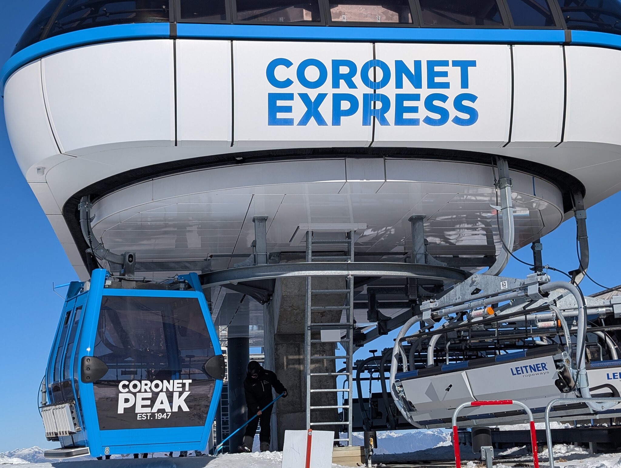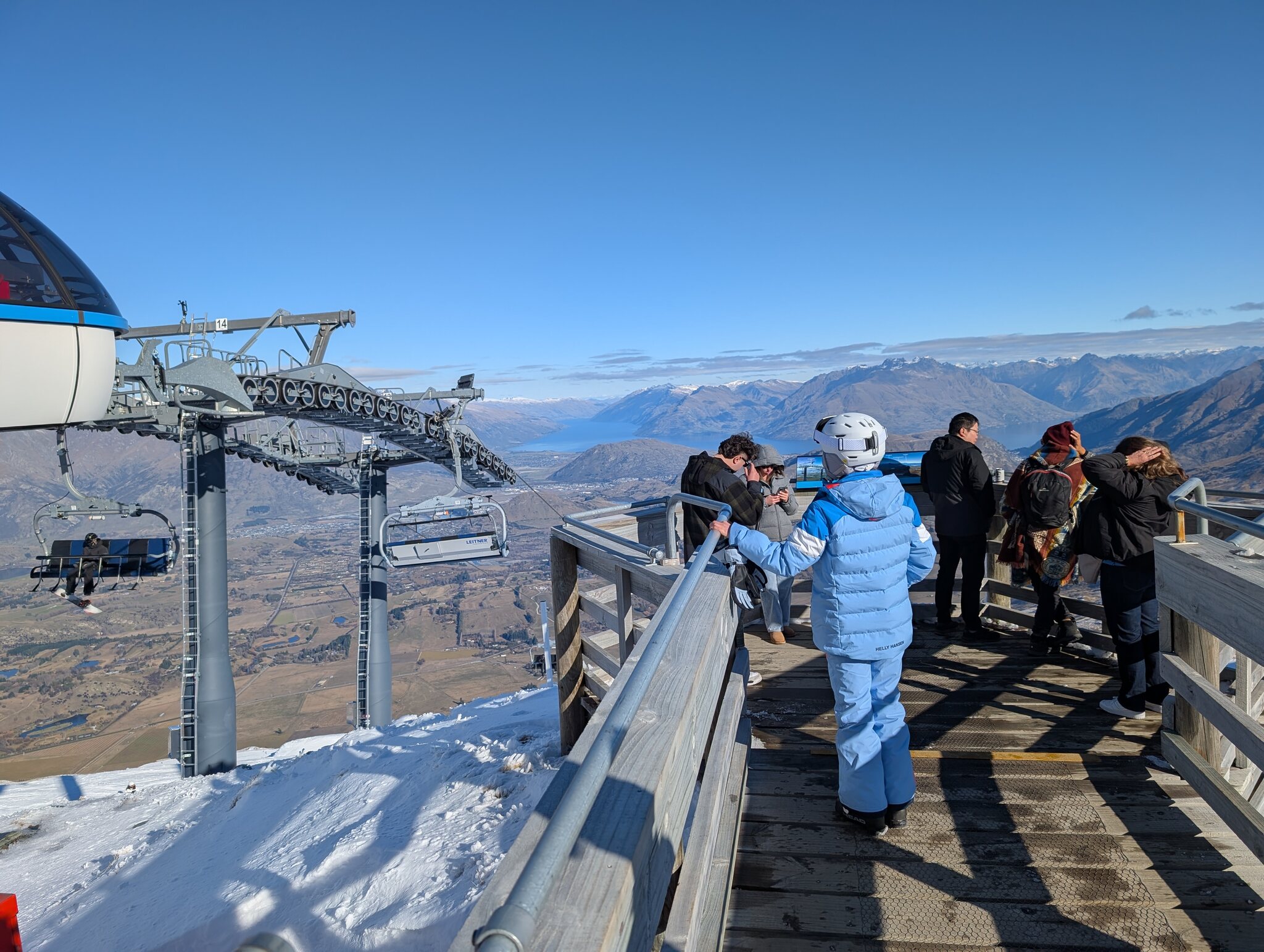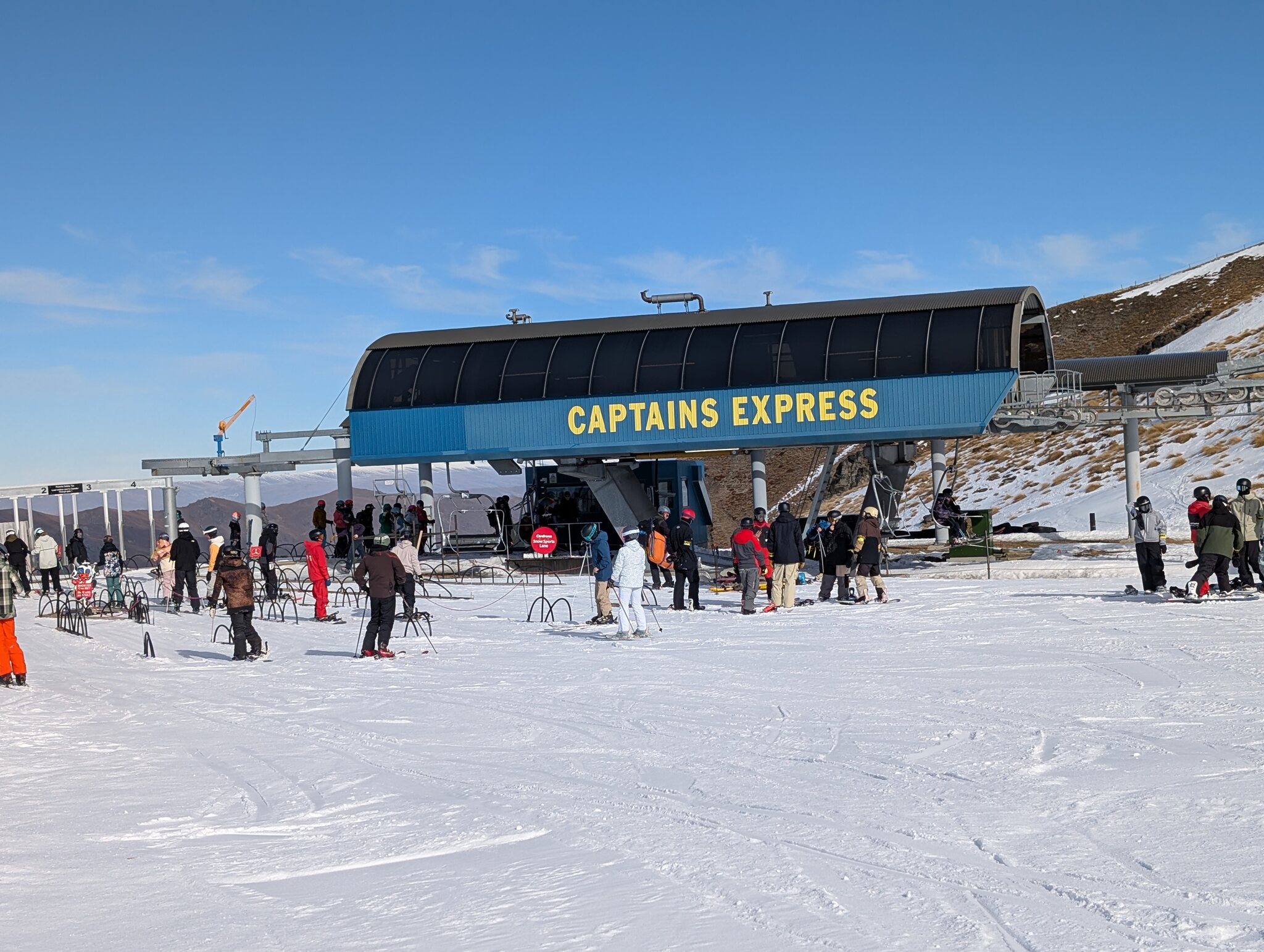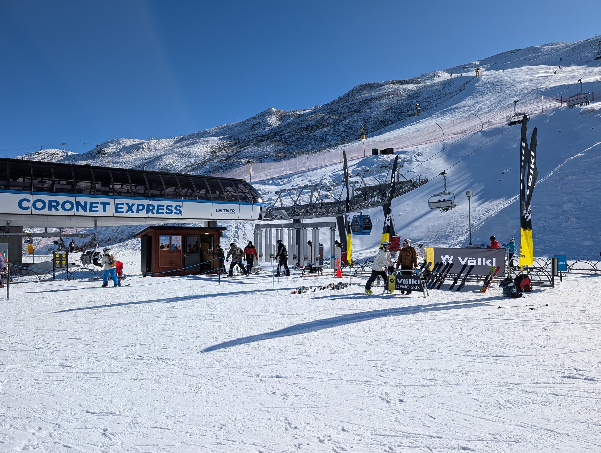 Heute hatte es am Morgen noch etwas Wolken, danach nur noch blauer Himmel. Coronet Peak reicht nur bis auf gut 1600 m ü. M. und hat dieses Jahr wenig Naturschnee. Dank 232 Schneekanonen und, wie ich letzte Woche in Cardrona erfahren hatte, mit Know-how und Manpower aus Arosa, sind die vielen und breiten Pisten aber in überraschend gutem Zustand. Das Skigebiet besteht aus 3 Sesselliften, alle kuppelbar (also "Express" in NZ-Speech) und einem Bügellift. Am meisten Leute hatte es auch hier am kürzesten Lift, dem Meadows, der ein für Anfänger geeignetes Terrain bedient. Zum höchsten Punkt führt der Coronet, der wie in Cardrona eigentlich ein Chondola ist.
