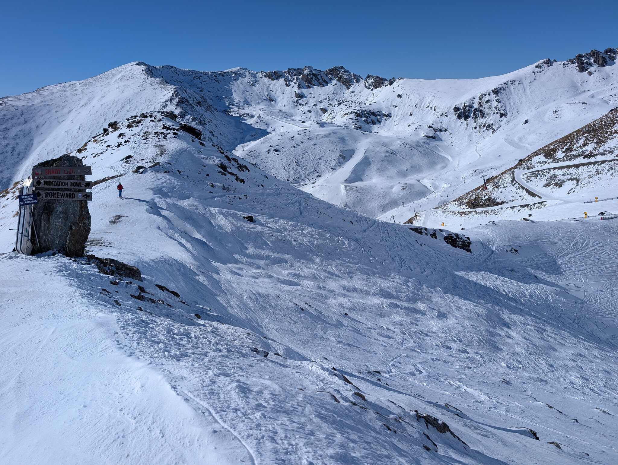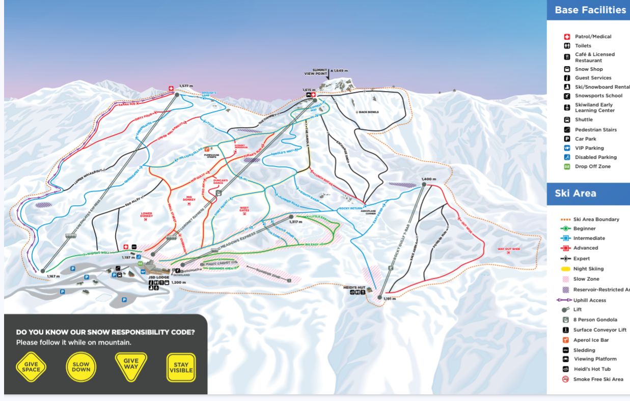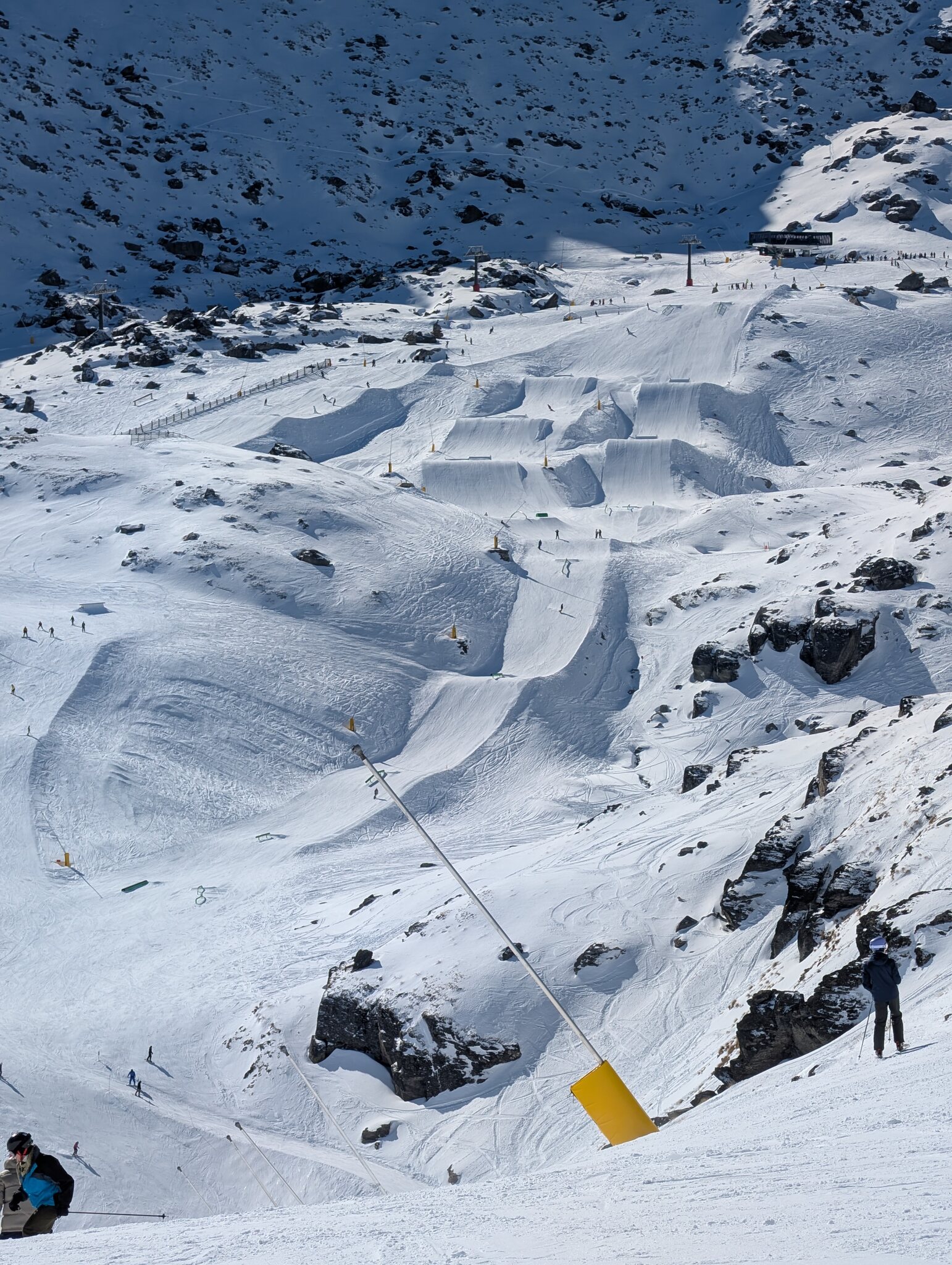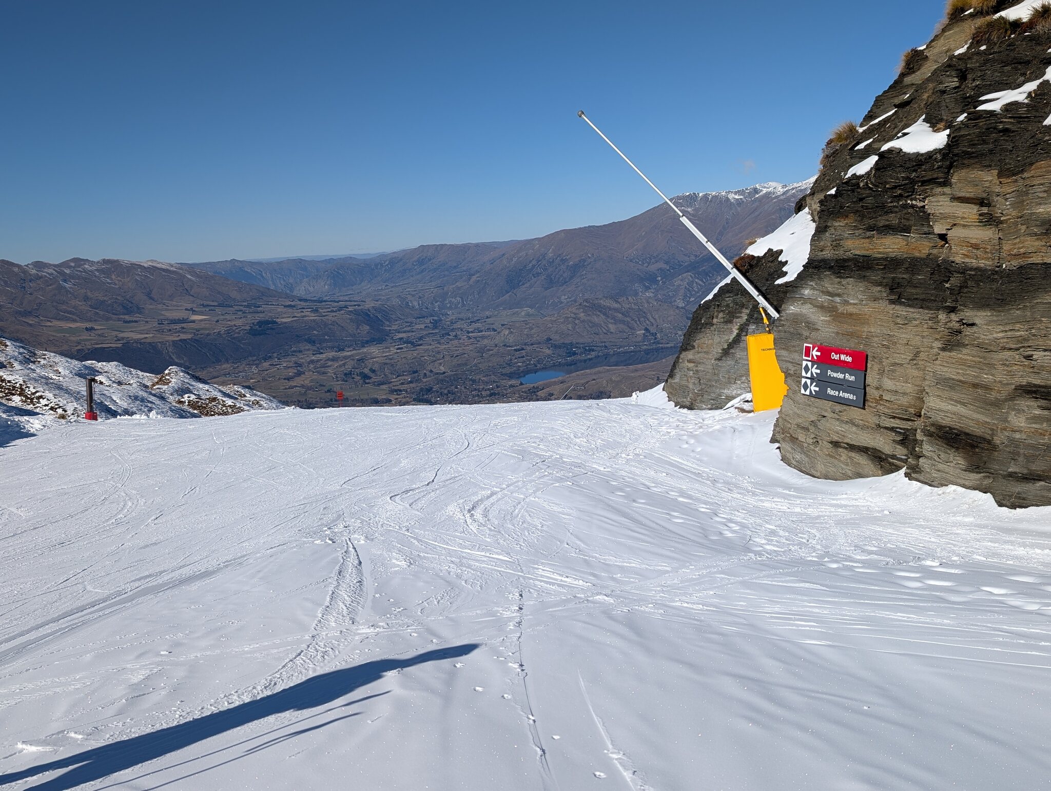 Leider sind da viele schöne Varianten momentan nicht fahrbar. Der Greengates ist etwas abseits und hatte am wenigsten Andrang, bedient aber sehr schöne Abfahrten. Auf der anderen Seite ist noch der Rocky Gully Skilift. Auch hier hat es interessante Pisten, ein Teil davon ist aber für Renntraining gesperrt. Vom 1. - 3. September finden da die offenen NZ-Meisterschaften statt.