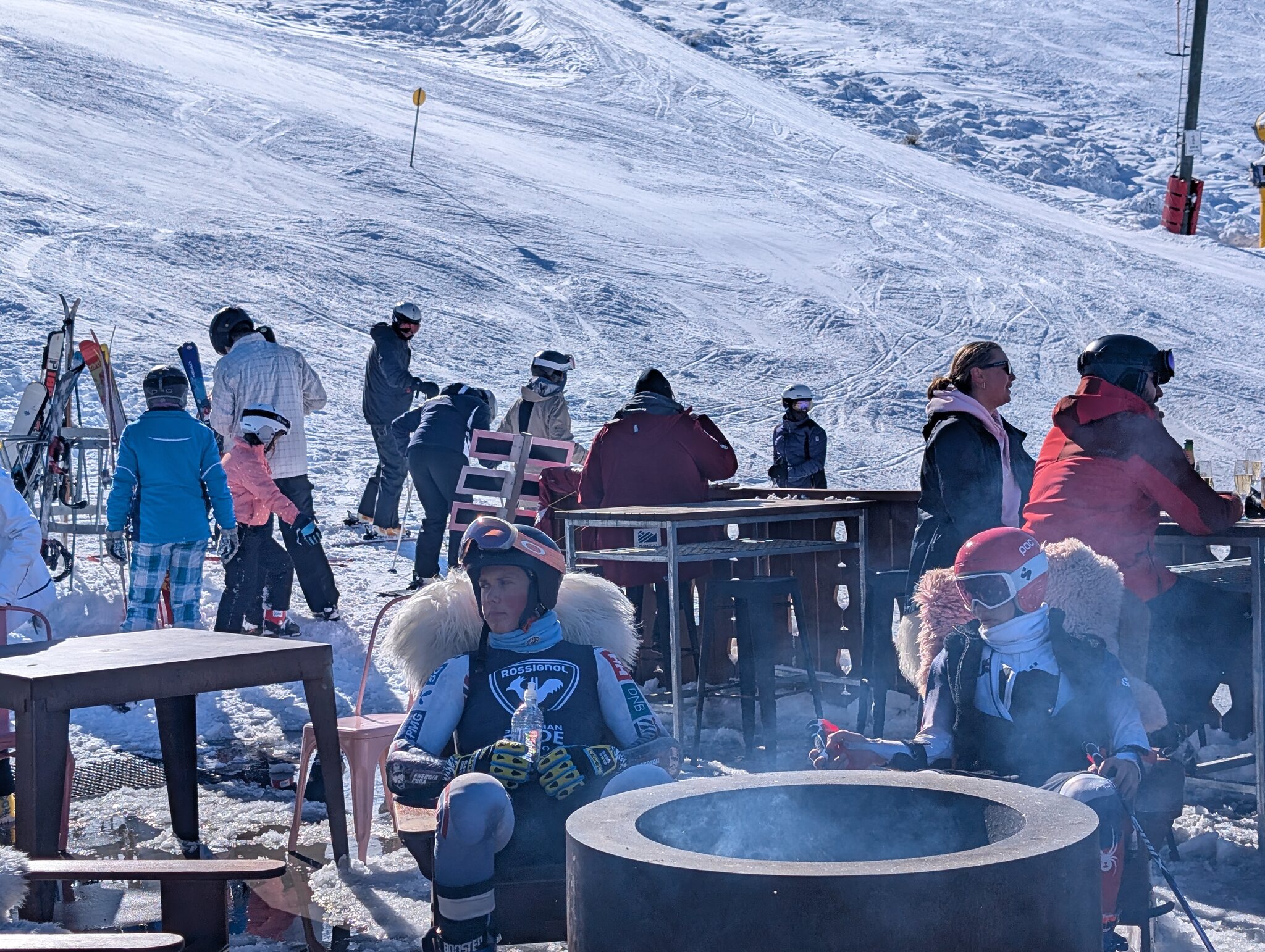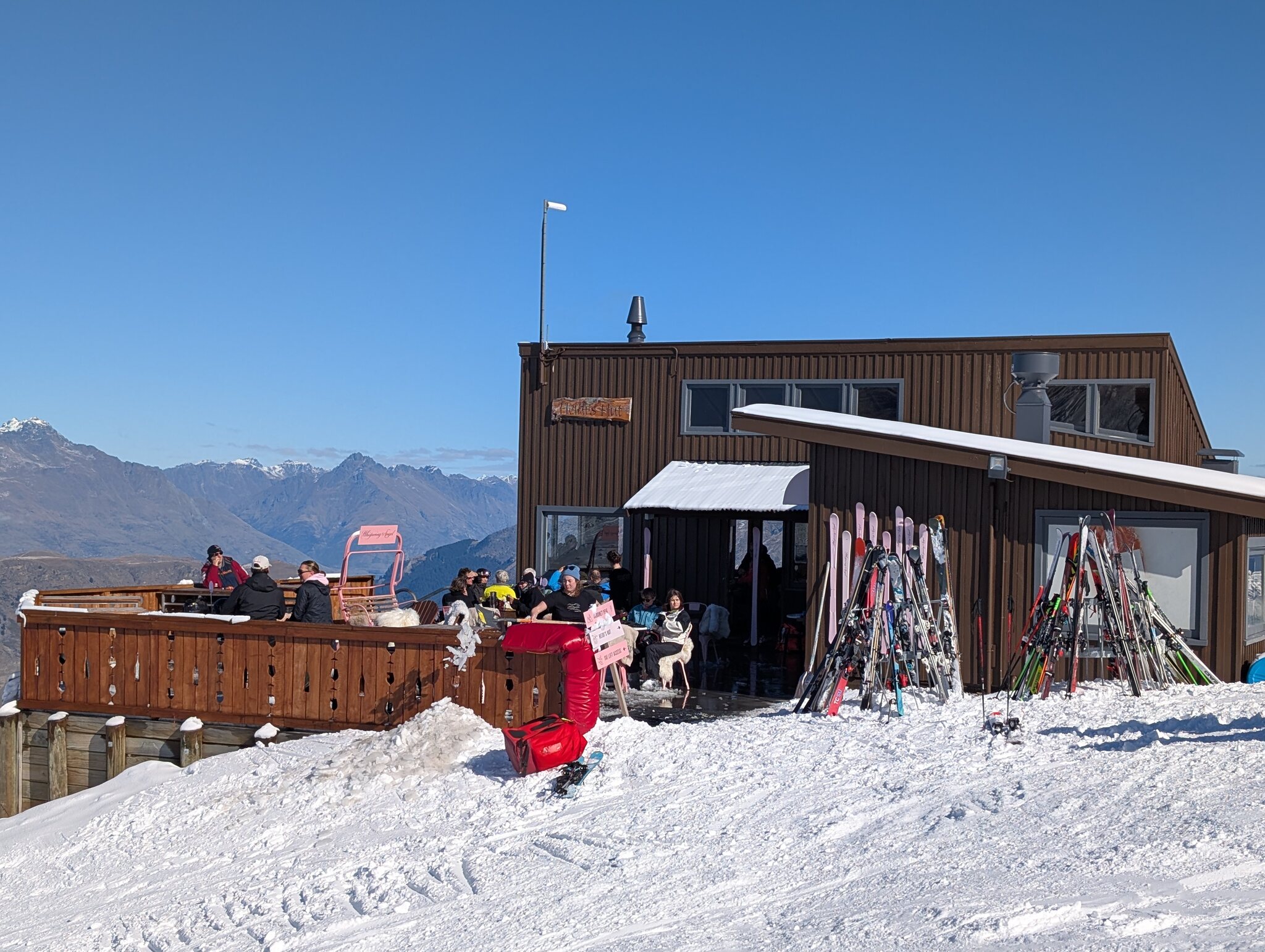 Direkt neben der Talstation des Skilifts befindet sich das Restaurant Heidi's Hut. Hier gibt es eine schöne Terasse mit offenem Feuer und das viel bessere Essen als im grossen Restaurant an der Basis. Jeden Mittwoch und Freitag startet um 16:00 das Nachtskifahren. Dann laufen nur noch Coronet und der kurze Meadows. Zu Beginn waren dann die Schlangen an den 2 Liften länger als am Tag. Das Nachtskifahren ist hier sehr beliebt, wohl wegen des tieferen Preises (NZ$ 95) und weil Einheimische nach der Arbeit noch hochkommen.