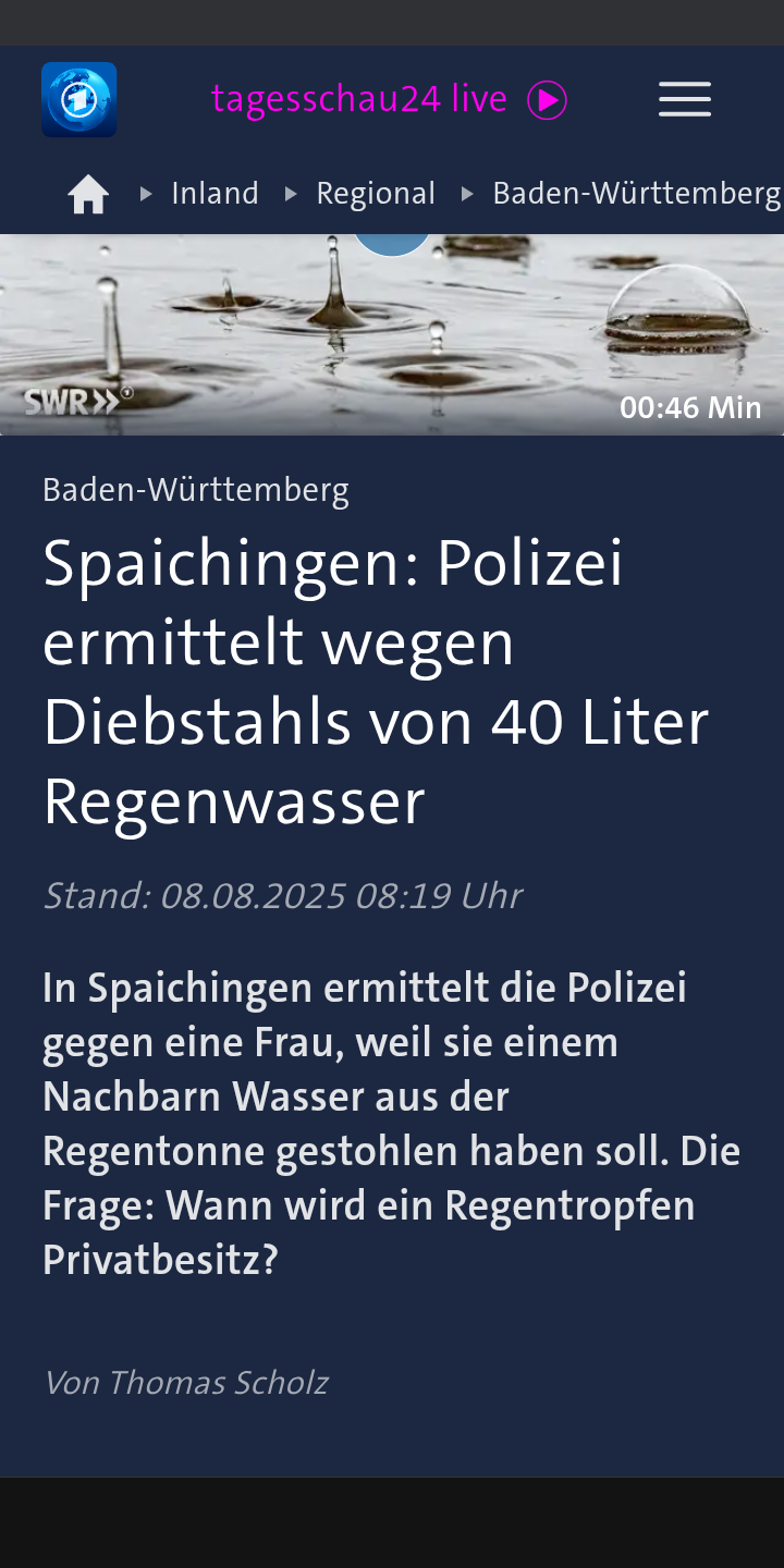 Baden-Württemberg: Spaichingen: Polizei ermittelt wegen Diebstahls von 40 Liter Regenwasser | tagesschau.de https://share.google/sNMmxg9EZASstkuiL