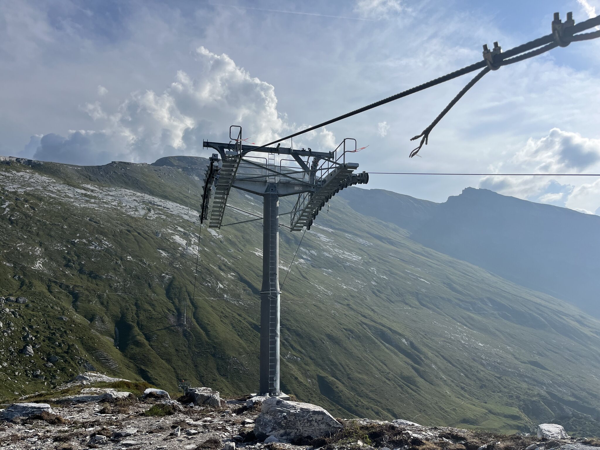 Aber eigentlich war meine Mission, in den 1 1/2 Stunden vor dem Frühstück kurz eine Baustellenbesichtigung zu machen. Toll, dass es trotz gegenteiliger Ankündigung keinerlei Wartezeiten hat kurz nach 8.30 Uhr. Der temporäre Einstieg für Wanderer ist sehr provisorisch: Die Leute vor mir wollen nach Nagens, ich habe eine eigene Gondel nach Segnes. Gleich wie im Winter Beim Restaurant Foppa geht noch gar nichts. Die Bretterwand auf Startgels ist neu: Wozu sind die gröberen Erdarbeiten auf Segnes? Bilder vom vorbereiteten Seilzug von nächster Woche: Aktuell liegt ein Seil mit ca. 2cm Durchmesser auf den Rollen (beim Niederhalter Segnesboden hängt es durch). Danach fahre ich weiter nach Nagens. Die Gondeln nach Cassons sind schon abfahrbereit