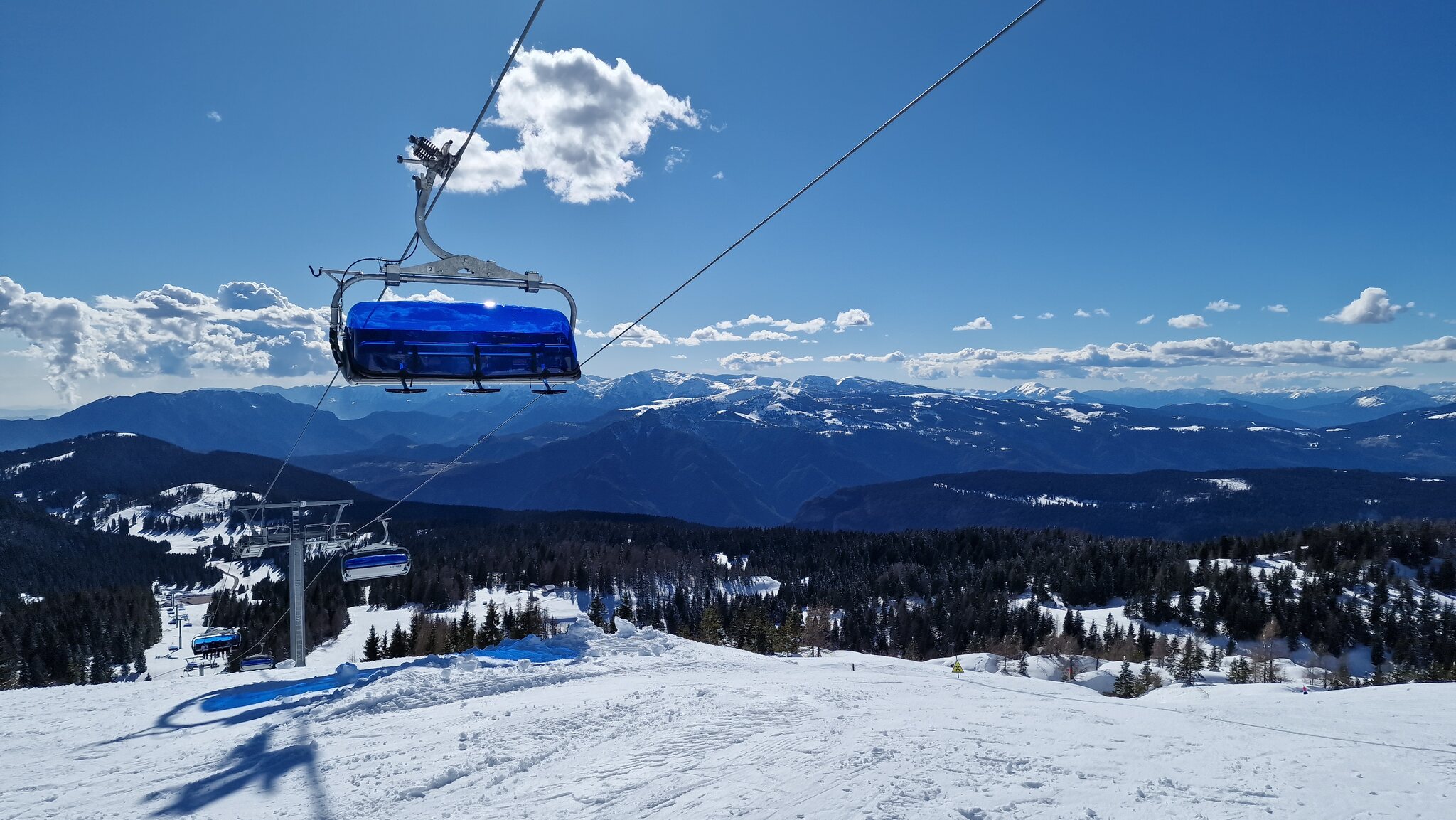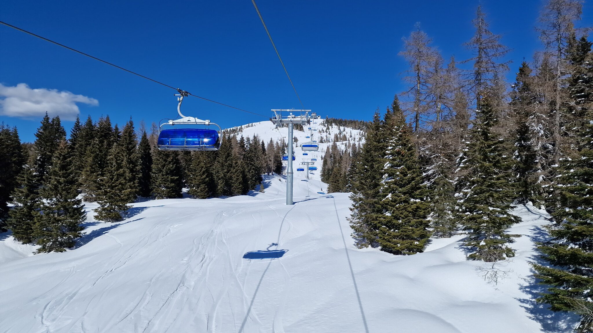 Die lange kuppelbare Sesselbahn ist die Hauptanlage des Skigebiets und erschliesst nahezu alle Pistenbereiche. Bei unserem Besuch war die parallele fixe Zweiersesselbahn nicht in Betrieb. Eine weitere fixe Zweiersesselbahn bedient die unteren, etwas steileren Pistenabschnitte. Ein kurzer Tellerlift mit angeschlossenem Kinderland ergänzt das Angebot am Monte Verena. Interessant ist, dass die heutige kuppelbare Anlage eine kuriose fixgeklemmte Doppel-Zweiersesselbahn ersetzt hat. Angesichts der Streckenlänge muss das für so manchen Gast eine Geduldsprobe gewesen sein. Davon zeugt heute sichtbar nur noch die ehemalige Bergstation und vielleicht sind die blauen Hauben auch ein leiser Verweis auf die zahlreichen blauen Doppelstützen von damals.