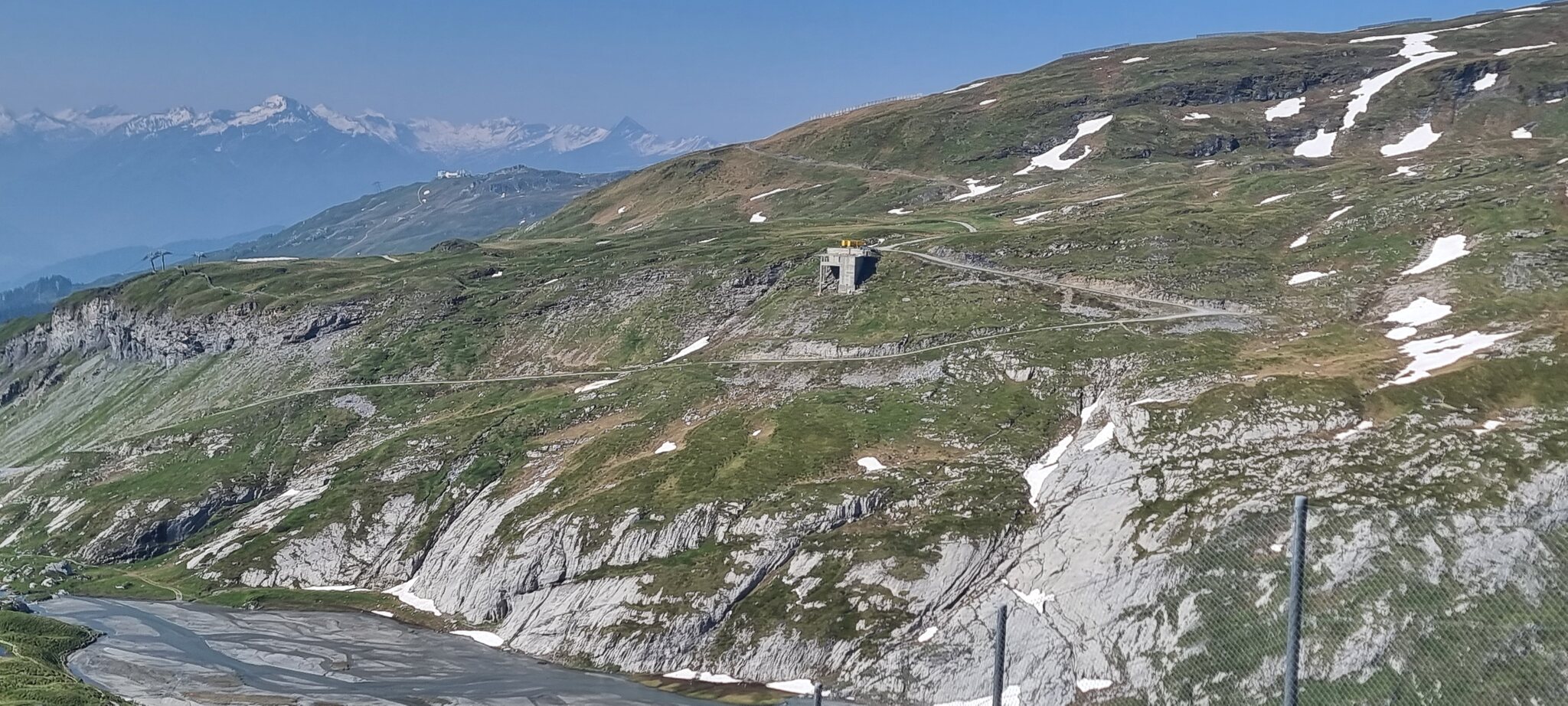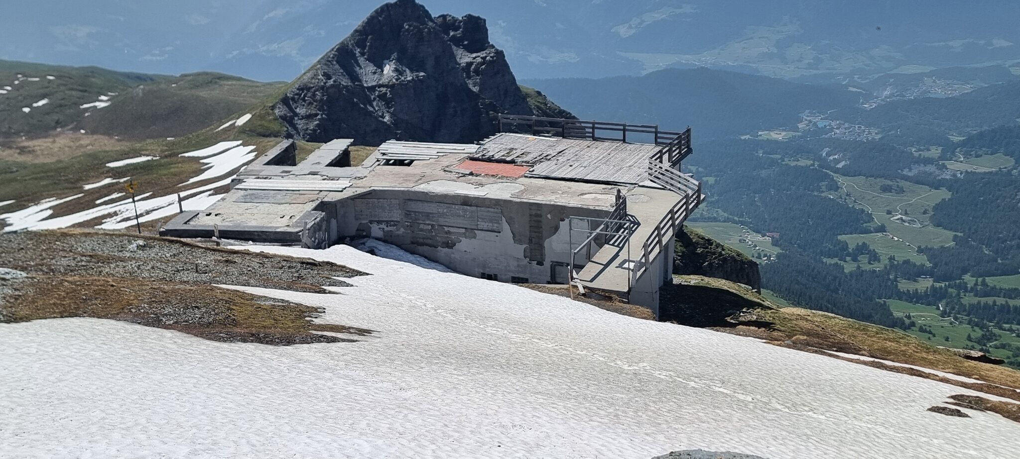 Die zunehmend verfallenen Reste der Bergstation der Pb-Cassons im Juni 2025. Absturzstellen sind - wenn überhaupt - nur notdürftig mit Brettern abgedeckt. Bis hier in einem Jahr Publikum via FlemXpress hochgeschaufelt werden soll, dürfte noch einiges an Verkehrssicherungsarbeiten anfallen, bevor es hier zu Unfällen kommt. Das Gebäude dürfte so inzwischen zur Tropfsteinhöhle mutieren und nicht zum Greenstyle-Aushängeschild werden.
