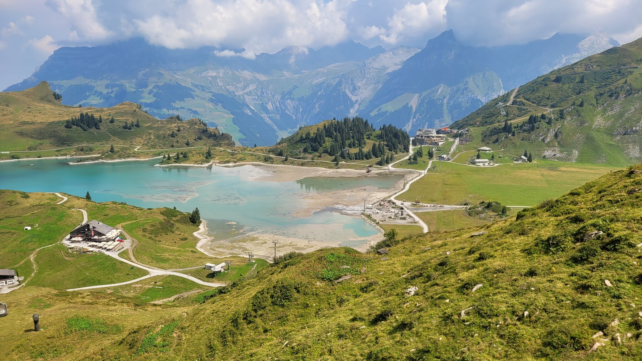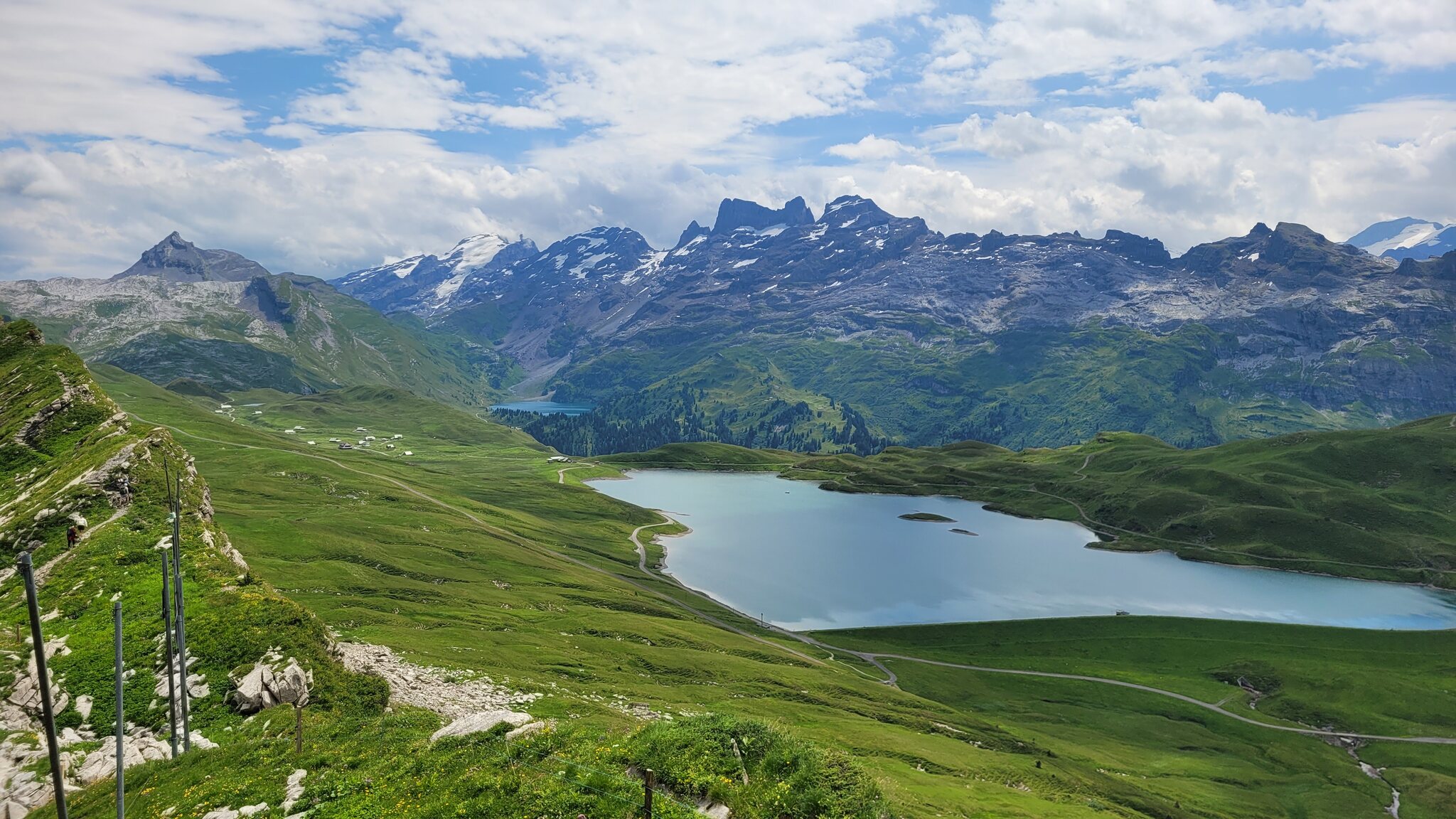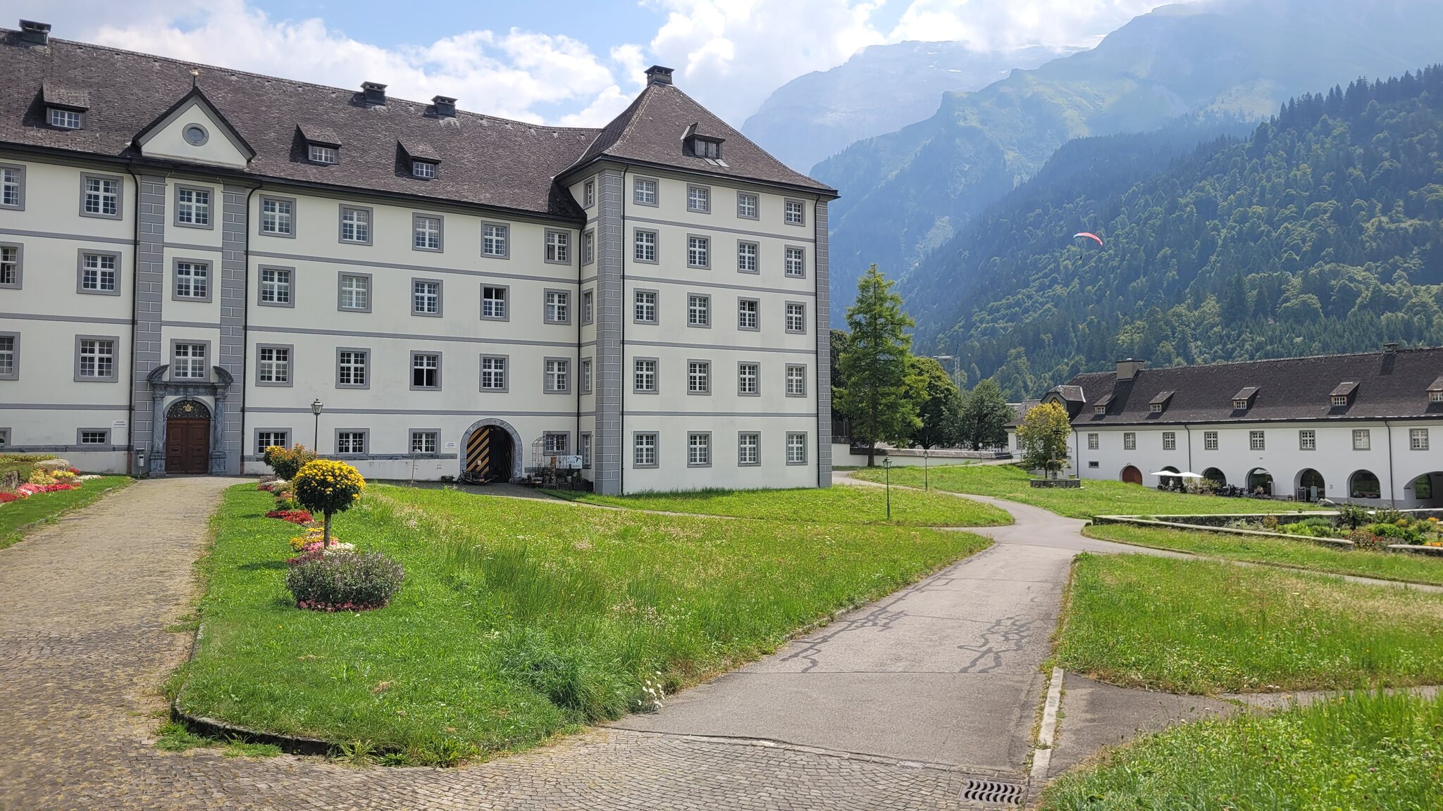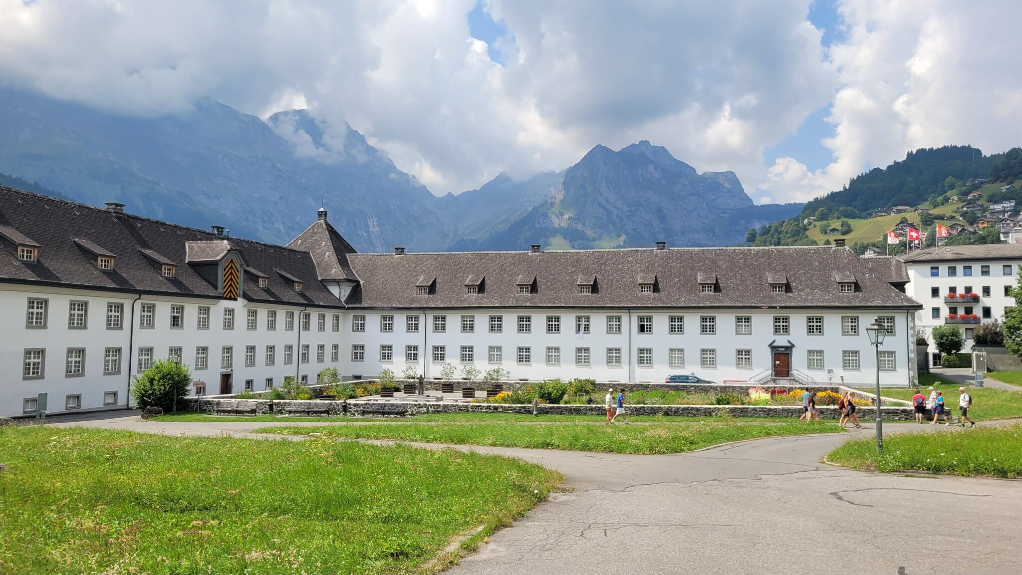 Blick zur Lodge: Der Weg zur Tannalp ist erst noch geteert, biegt aber bald in einen richtigen Wanderweg ab. Tannensee mit dem markanten Grat dahinter: Hinter der Tannalp geht es bergab in ein Seitental, das schon zum Kanton Bern gehört. Blick Richtung Berner Alpen nach Süden: Die Engstlenalp (nicht zu verwechseln mit der Engstligenalp), dahinter kam der Titlis mal kurz aus den Wolken: Zum Hotel Engstlenalp kann man auch mit dem Auto von der Berner Seite aus hochfahren: Der Engstlensee: Etwas oberhalb vom See nehme ich dann die Seilbahn, eine schicke D-Line aus 2019. Im Sommer wird die in einer Art GUB-Modus betrieben mit 2 Sesseln und einem Bike Rack pro Richtung. War mir auch neu, dass man eine KSB so betreiben kann. Das Ticket kann man oben am Jochpass lösen, 22 CHF mit Halbtax nach Engelberg sind ok. Ohne HT muss man für den Gipfel schon 105 CHF löhnen, der Skipass ist da ein besserer Deal. Einen Blick zur Baustelle kann ich erhaschen: .. bevor es zum Trübsee wieder runter geht. Die Bahn hier läuft normal. Auf der Vorderseite sieht man viel Blankeis: Danach habe ich noch eine kleine Tour durch Engelberg gemacht, ein paar schöne historische Gebäude hat es schon: Und eine beflaggte Fussgängerzone: Am Ende kommt man zum Kloster, das 1120 gegründet wurde. Der jetzige Bau ist Barock aus dem 18. Jahrhundert. Bis dahin war alles um Engelberg Klosterbesitz. 1803 wurde es zunächst Teil vom Kanton Nidwalden, mit dem Wiener Kongress 1815 ist man dann zum Kanton Obwalden gewechselt als Exklave. Warum es sich die Nidwaldner mit den Engelbergern verscherzt haben, müsste Chrigel mal näher erklären