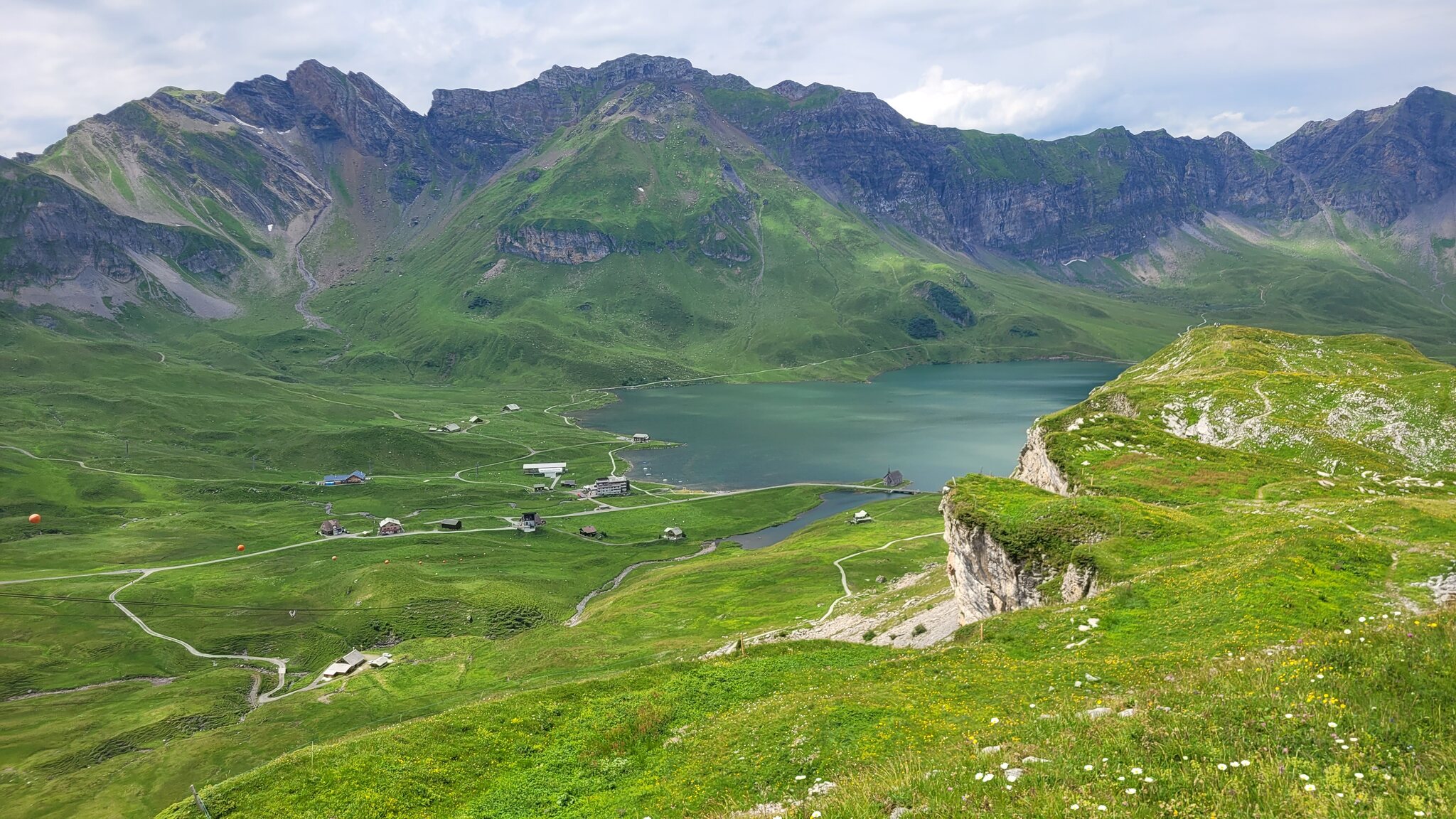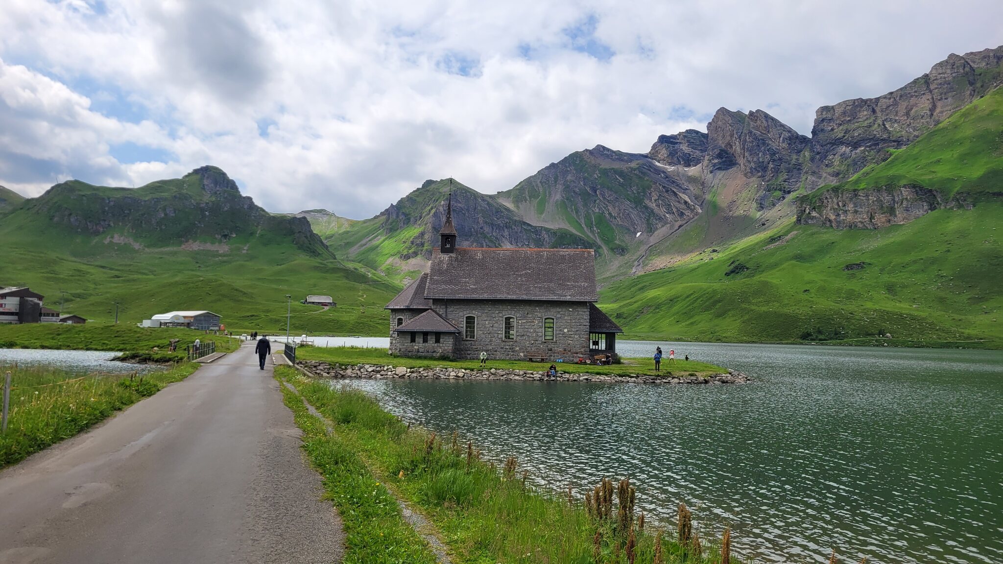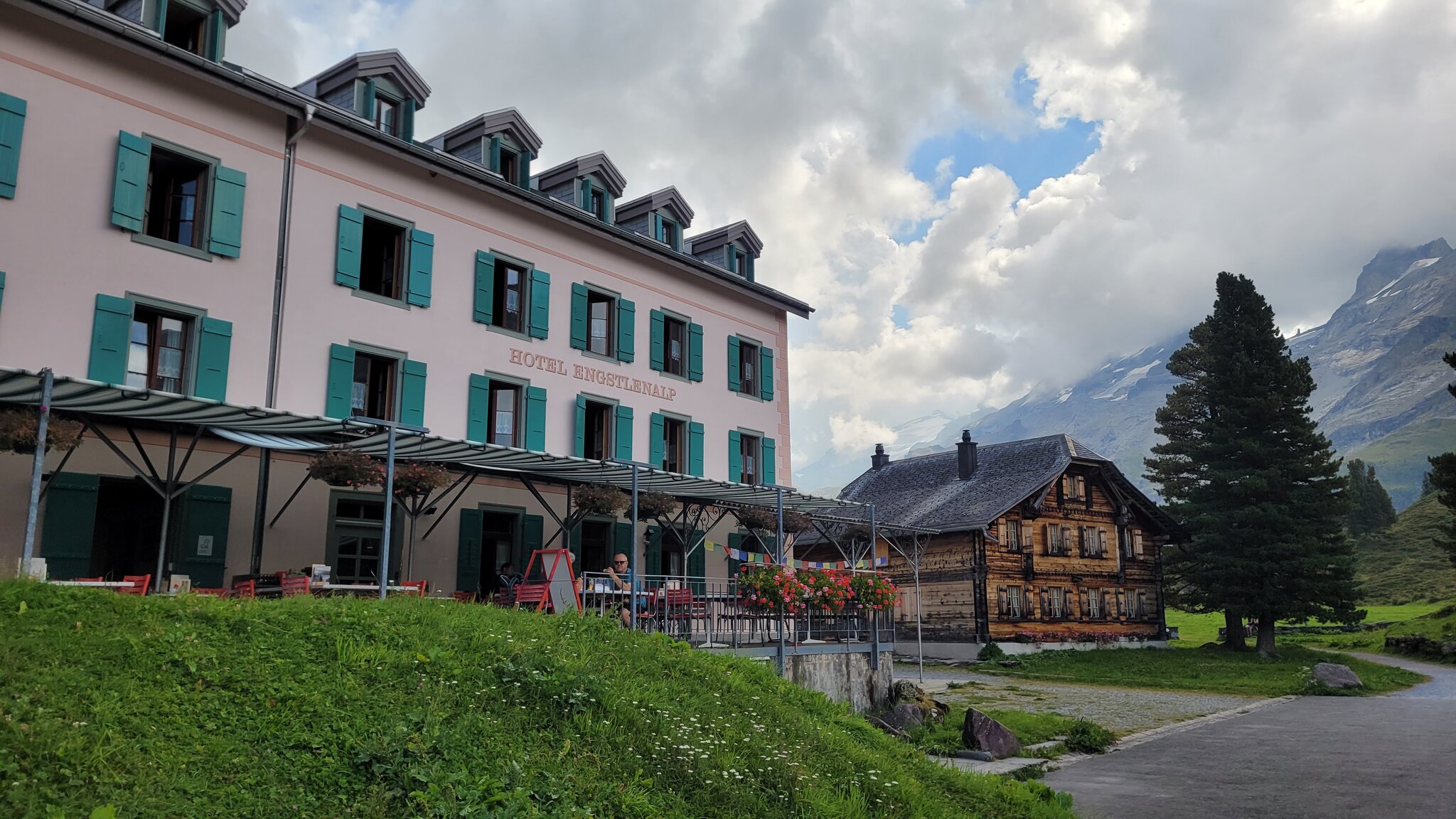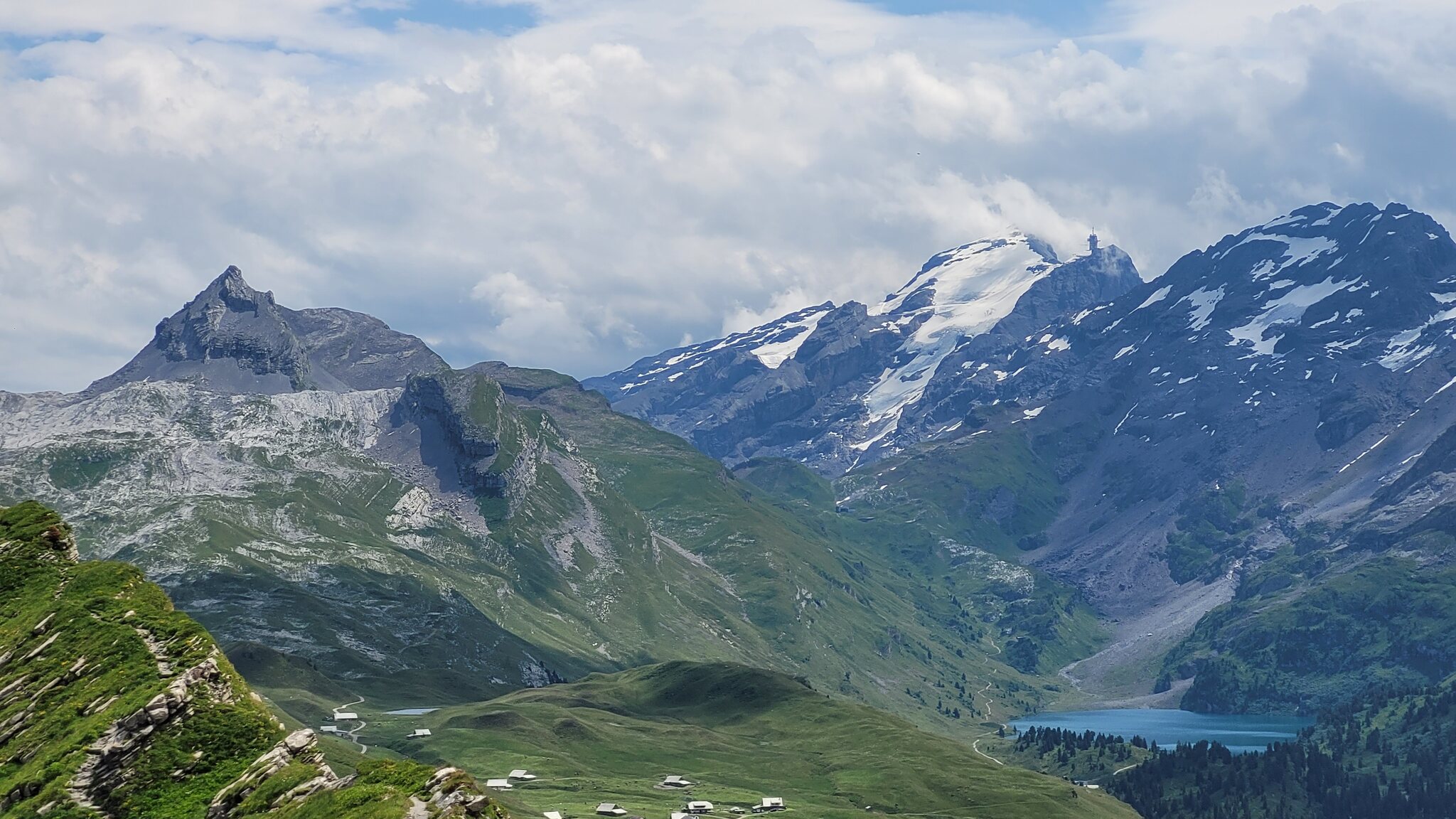 Blick zur Lodge: Der Weg zur Tannalp ist erst noch geteert, biegt aber bald in einen richtigen Wanderweg ab. Tannensee mit dem markanten Grat dahinter: Hinter der Tannalp geht es bergab in ein Seitental, das schon zum Kanton Bern gehört. Blick Richtung Berner Alpen nach Süden: Die Engstlenalp (nicht zu verwechseln mit der Engstligenalp), dahinter kam der Titlis mal kurz aus den Wolken: Zum Hotel Engstlenalp kann man auch mit dem Auto von der Berner Seite aus hochfahren: Der Engstlensee: Etwas oberhalb vom See nehme ich dann die Seilbahn, eine schicke D-Line aus 2019. Im Sommer wird die in einer Art GUB-Modus betrieben mit 2 Sesseln und einem Bike Rack pro Richtung. War mir auch neu, dass man eine KSB so betreiben kann. Das Ticket kann man oben am Jochpass lösen, 22 CHF mit Halbtax nach Engelberg sind ok. Ohne HT muss man für den Gipfel schon 105 CHF löhnen, der Skipass ist da ein besserer Deal. Einen Blick zur Baustelle kann ich erhaschen: .. bevor es zum Trübsee wieder runter geht. Die Bahn hier läuft normal. Auf der Vorderseite sieht man viel Blankeis: Danach habe ich noch eine kleine Tour durch Engelberg gemacht, ein paar schöne historische Gebäude hat es schon: Und eine beflaggte Fussgängerzone: Am Ende kommt man zum Kloster, das 1120 gegründet wurde. Der jetzige Bau ist Barock aus dem 18. Jahrhundert. Bis dahin war alles um Engelberg Klosterbesitz. 1803 wurde es zunächst Teil vom Kanton Nidwalden, mit dem Wiener Kongress 1815 ist man dann zum Kanton Obwalden gewechselt als Exklave. Warum es sich die Nidwaldner mit den Engelbergern verscherzt haben, müsste Chrigel mal näher erklären