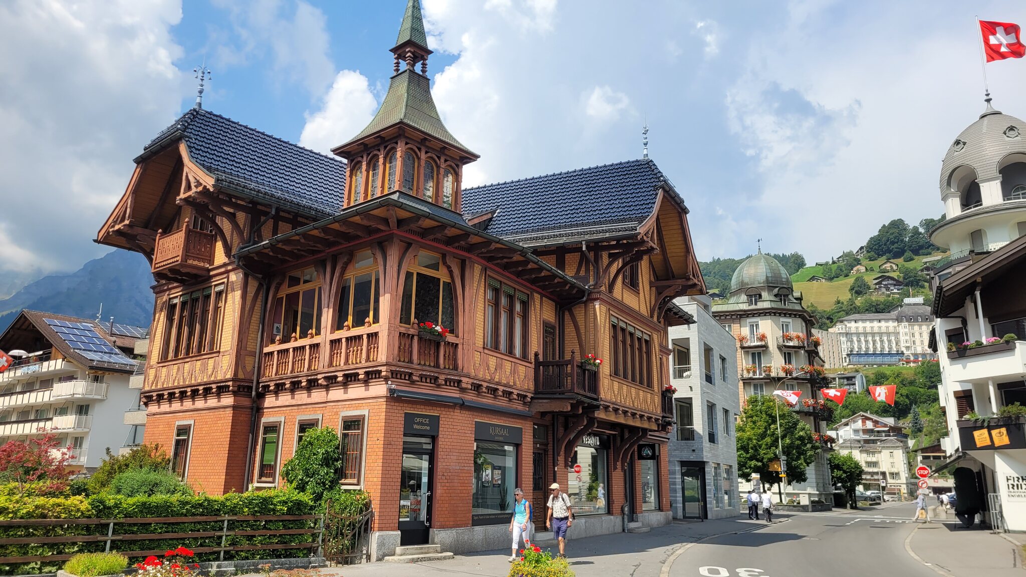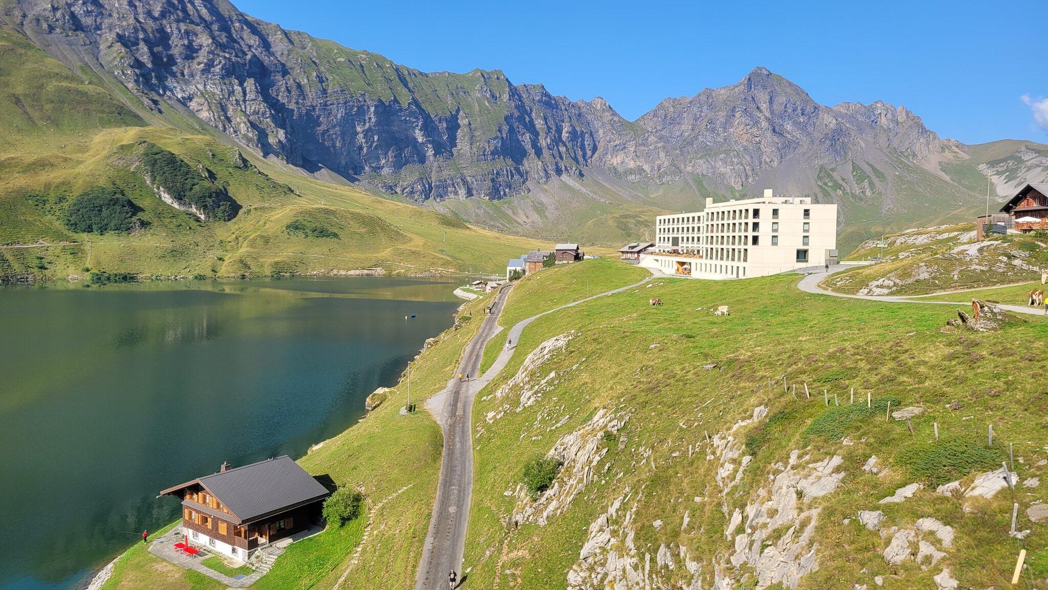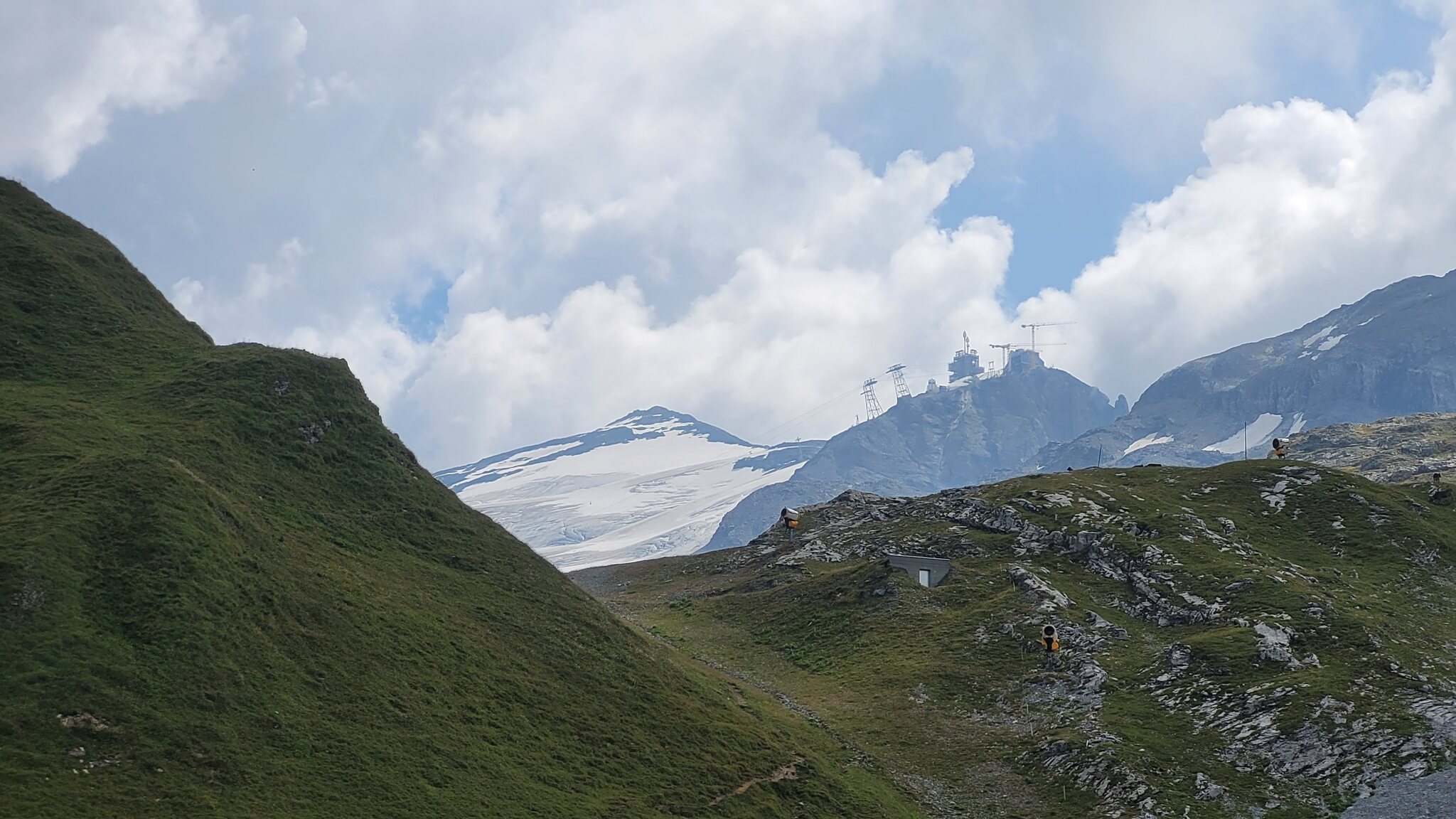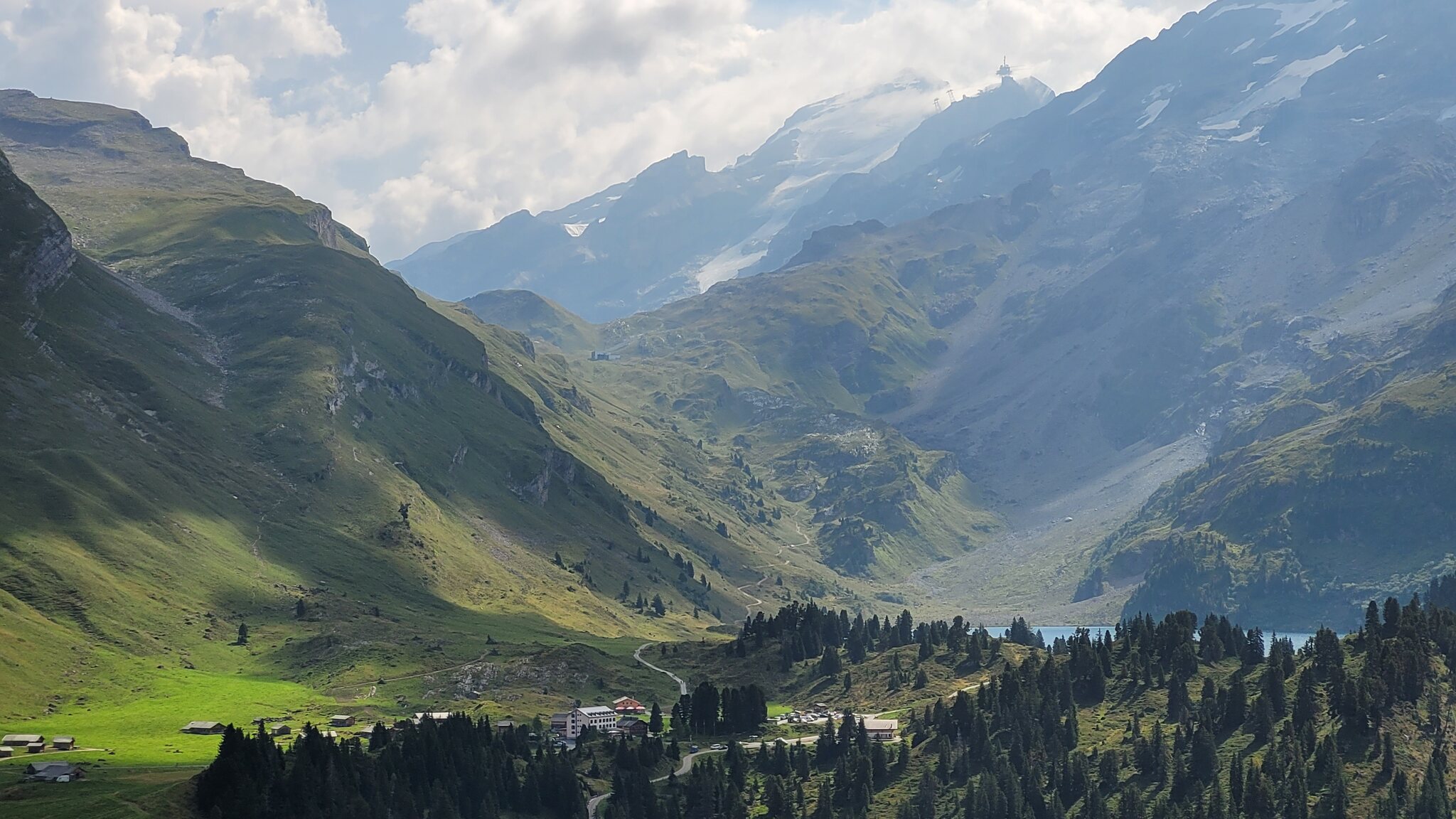 Blick zur Lodge: Der Weg zur Tannalp ist erst noch geteert, biegt aber bald in einen richtigen Wanderweg ab. Tannensee mit dem markanten Grat dahinter: Hinter der Tannalp geht es bergab in ein Seitental, das schon zum Kanton Bern gehört. Blick Richtung Berner Alpen nach Süden: Die Engstlenalp (nicht zu verwechseln mit der Engstligenalp), dahinter kam der Titlis mal kurz aus den Wolken: Zum Hotel Engstlenalp kann man auch mit dem Auto von der Berner Seite aus hochfahren: Der Engstlensee: Etwas oberhalb vom See nehme ich dann die Seilbahn, eine schicke D-Line aus 2019. Im Sommer wird die in einer Art GUB-Modus betrieben mit 2 Sesseln und einem Bike Rack pro Richtung. War mir auch neu, dass man eine KSB so betreiben kann. Das Ticket kann man oben am Jochpass lösen, 22 CHF mit Halbtax nach Engelberg sind ok. Ohne HT muss man für den Gipfel schon 105 CHF löhnen, der Skipass ist da ein besserer Deal. Einen Blick zur Baustelle kann ich erhaschen: .. bevor es zum Trübsee wieder runter geht. Die Bahn hier läuft normal. Auf der Vorderseite sieht man viel Blankeis: Danach habe ich noch eine kleine Tour durch Engelberg gemacht, ein paar schöne historische Gebäude hat es schon: Und eine beflaggte Fussgängerzone: Am Ende kommt man zum Kloster, das 1120 gegründet wurde. Der jetzige Bau ist Barock aus dem 18. Jahrhundert. Bis dahin war alles um Engelberg Klosterbesitz. 1803 wurde es zunächst Teil vom Kanton Nidwalden, mit dem Wiener Kongress 1815 ist man dann zum Kanton Obwalden gewechselt als Exklave. Warum es sich die Nidwaldner mit den Engelbergern verscherzt haben, müsste Chrigel mal näher erklären