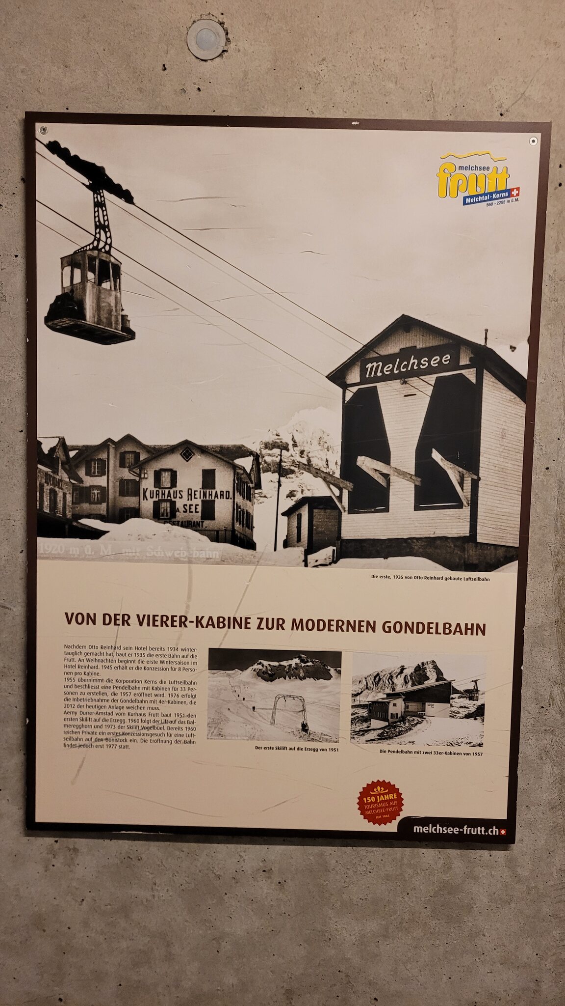 Die alte Bergstation der Zubringerbahn wurde mit einem Tunnel mit der neuen verbunden, in dem ich heute zum ersten mal war. Im Winter braucht man den nicht unbedingt. Dort waren verschiedene Bilder zur Geschichte ausgestellt, u.a. die erste Bahn von 1935, die ein Hotelier gebaut hatte.