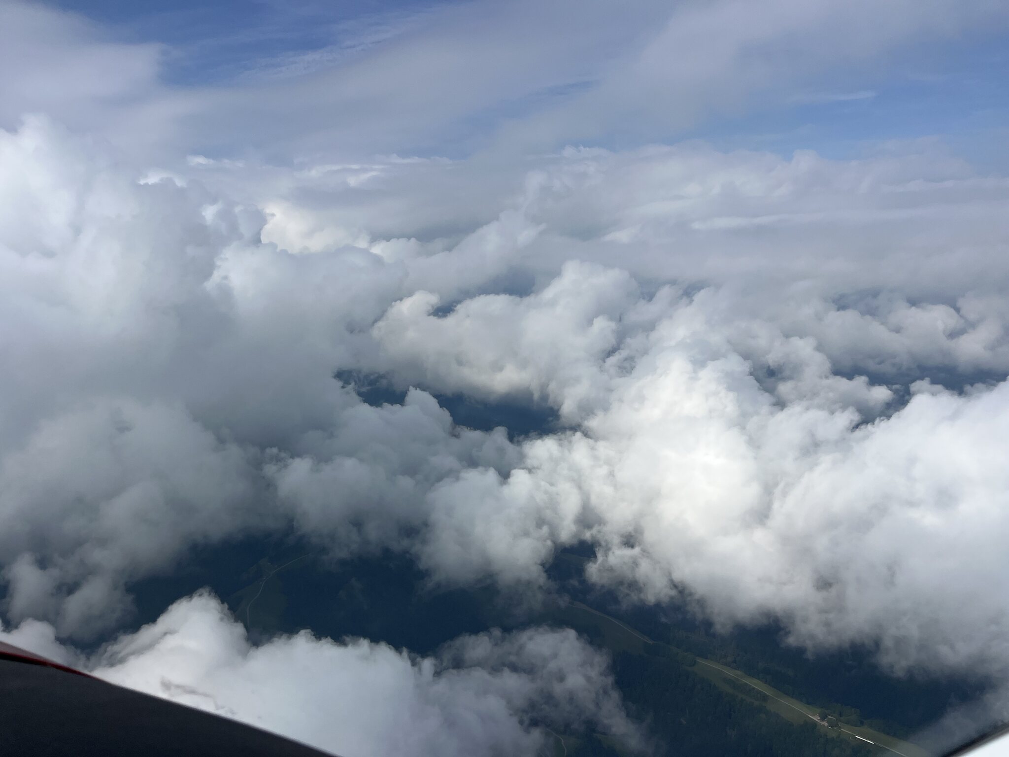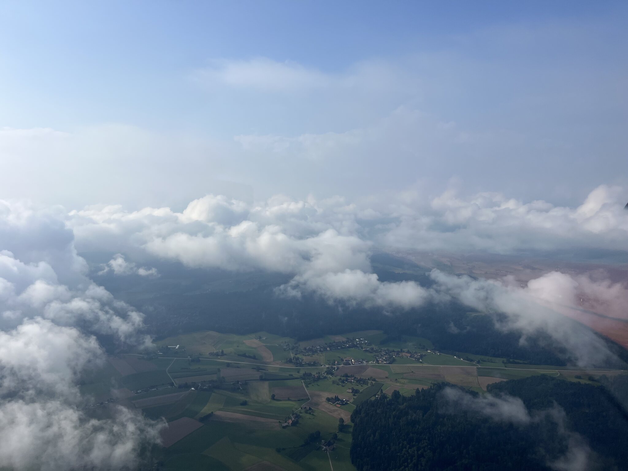 Wie schon gestern war der Hinweg wettertechnisch schwierig. Wir wollten on top fliegen, aber im Bereich Emmental gab es kein Durchkommen mehr und wir mussten wieder unter den tiefen Wolken weiterfliegen.