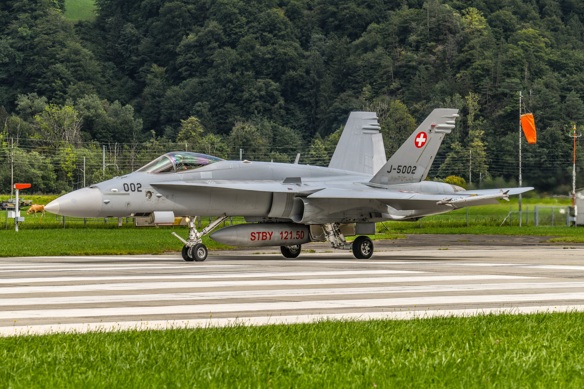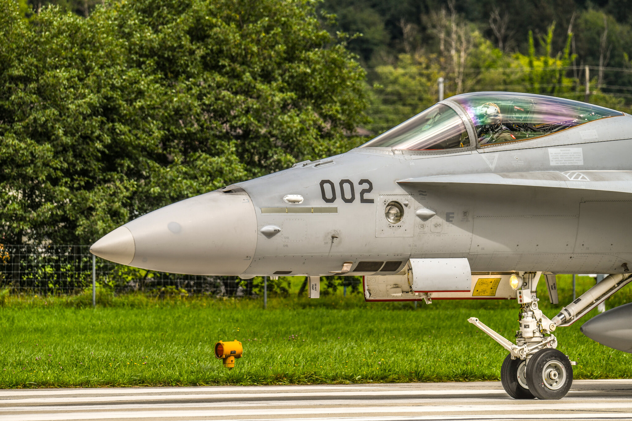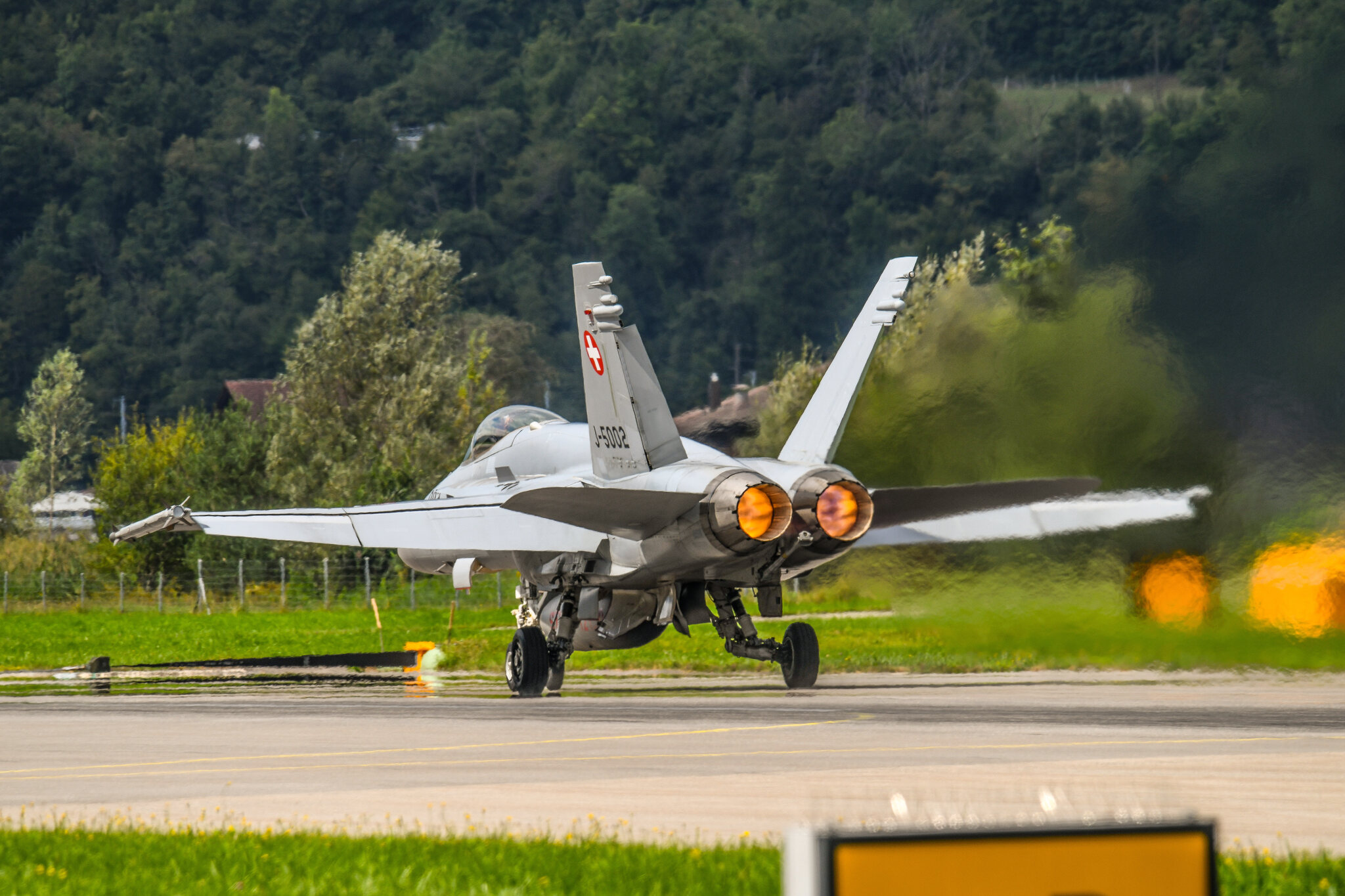 Nach dem Mittagessen und einem Referat der Luftwaffe durften wir einen Start zweiter F/A18 hautnah, direkt am Pistenrand verfolgen. Irrsinnig laut!