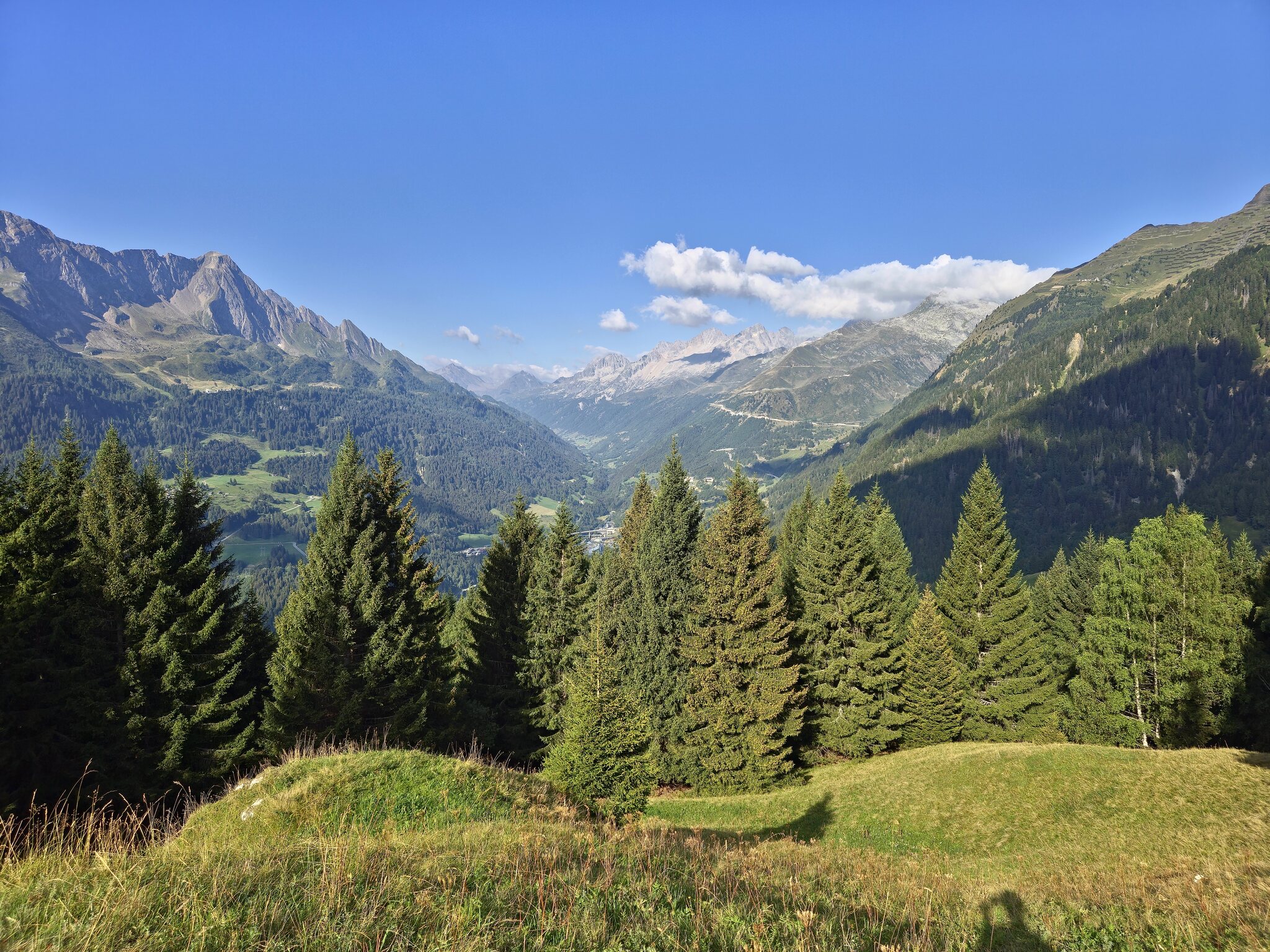 Blick in Richtung Andermatt. Während hier bei uns bestes Wetter herrscht, werden die Wolken ab Andermatt deutlich dichter und hängen teilweise tief in den Bergtälern. Es war also die absolut richtige Entscheidung in Richtung Süden zu fahren.