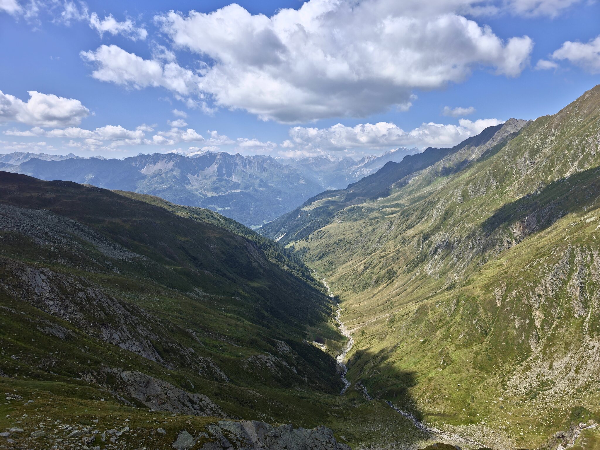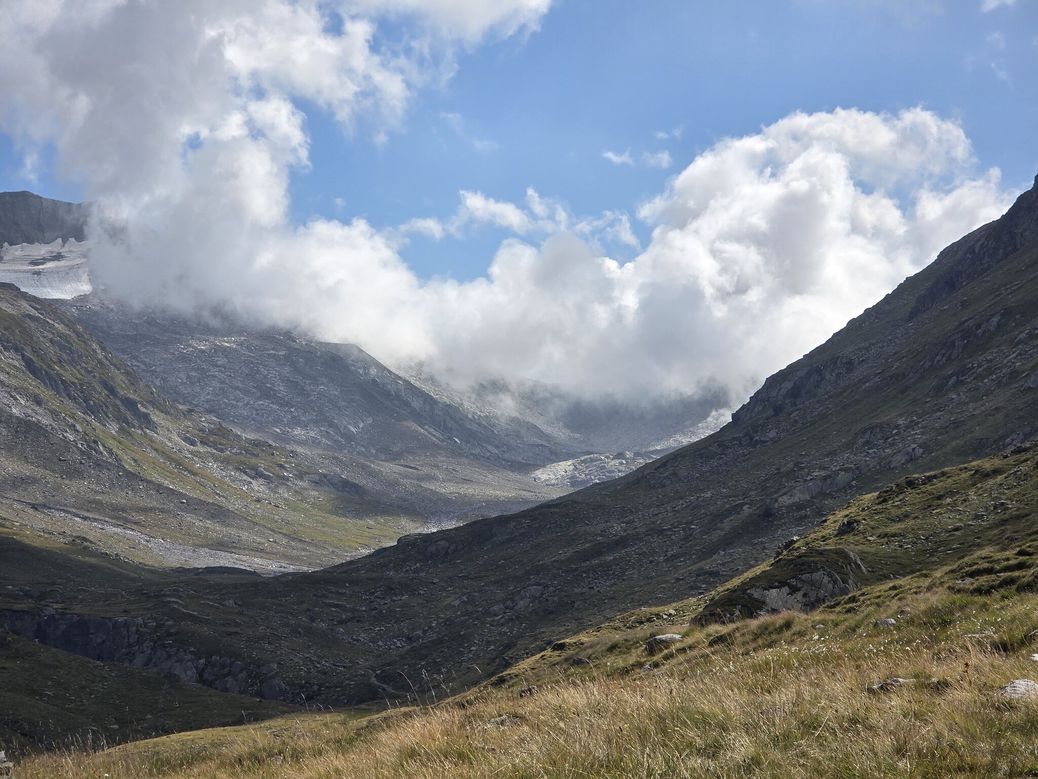 Das Wetter meint es heute gut mit uns. Als wir in etwa auf Höhe der Maighels-Hütte sind, ziehen tiefe Wolcken in den oberen Teil des Tals und zum Passo Borengo. Als wir dort oben waren herrschten hingegen noch beste Wetterverhältnisse.