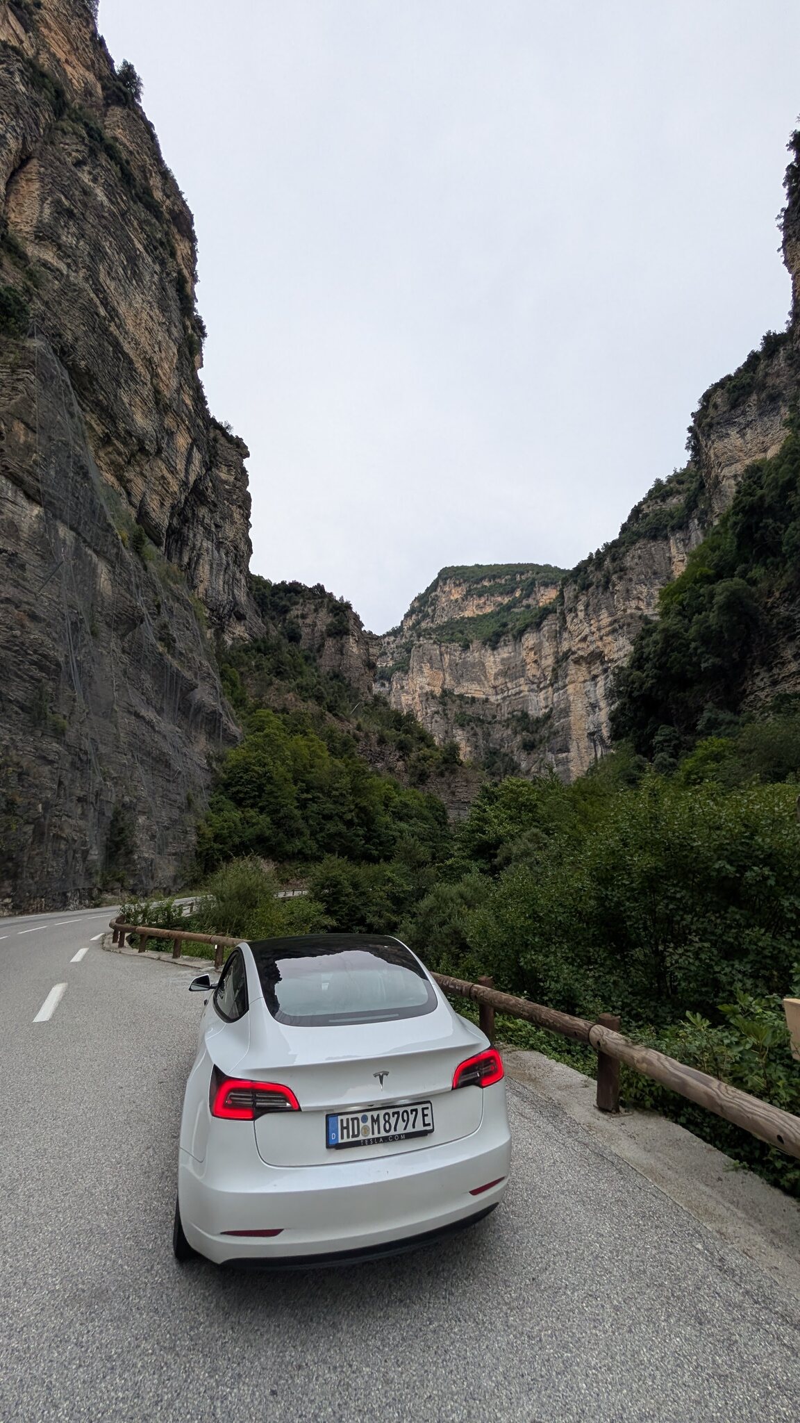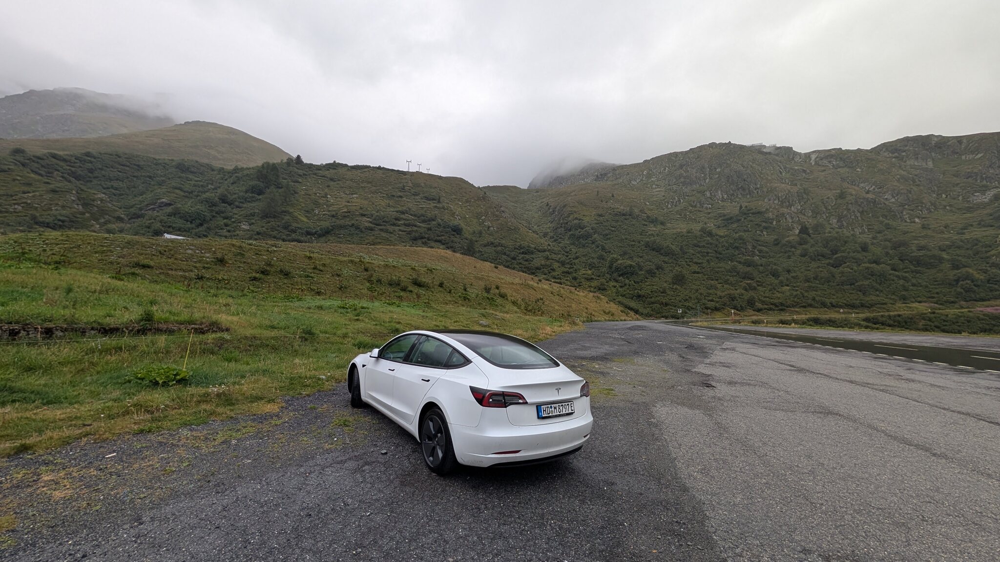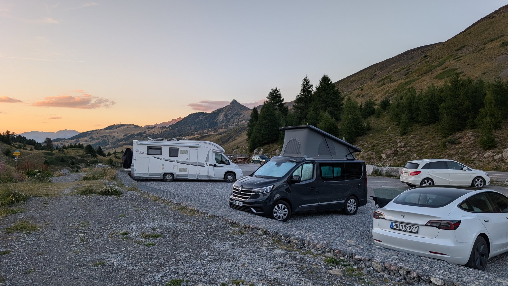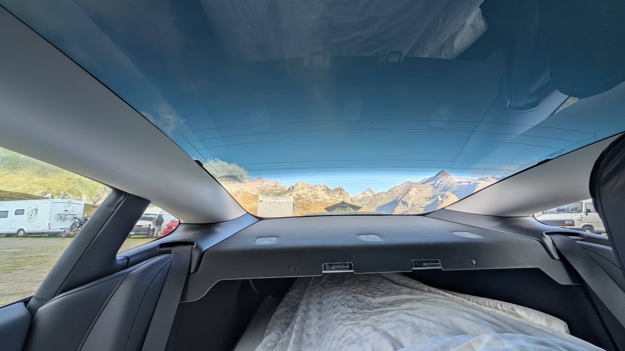 Geschlafen habe ich im nachts entspannt klimatisierten Elektroauto mit 2,10 x 0,90 Meter breiten Liegefläche und Matratze, und das sehr entspannt und angenehm mit tollem Bergblick!