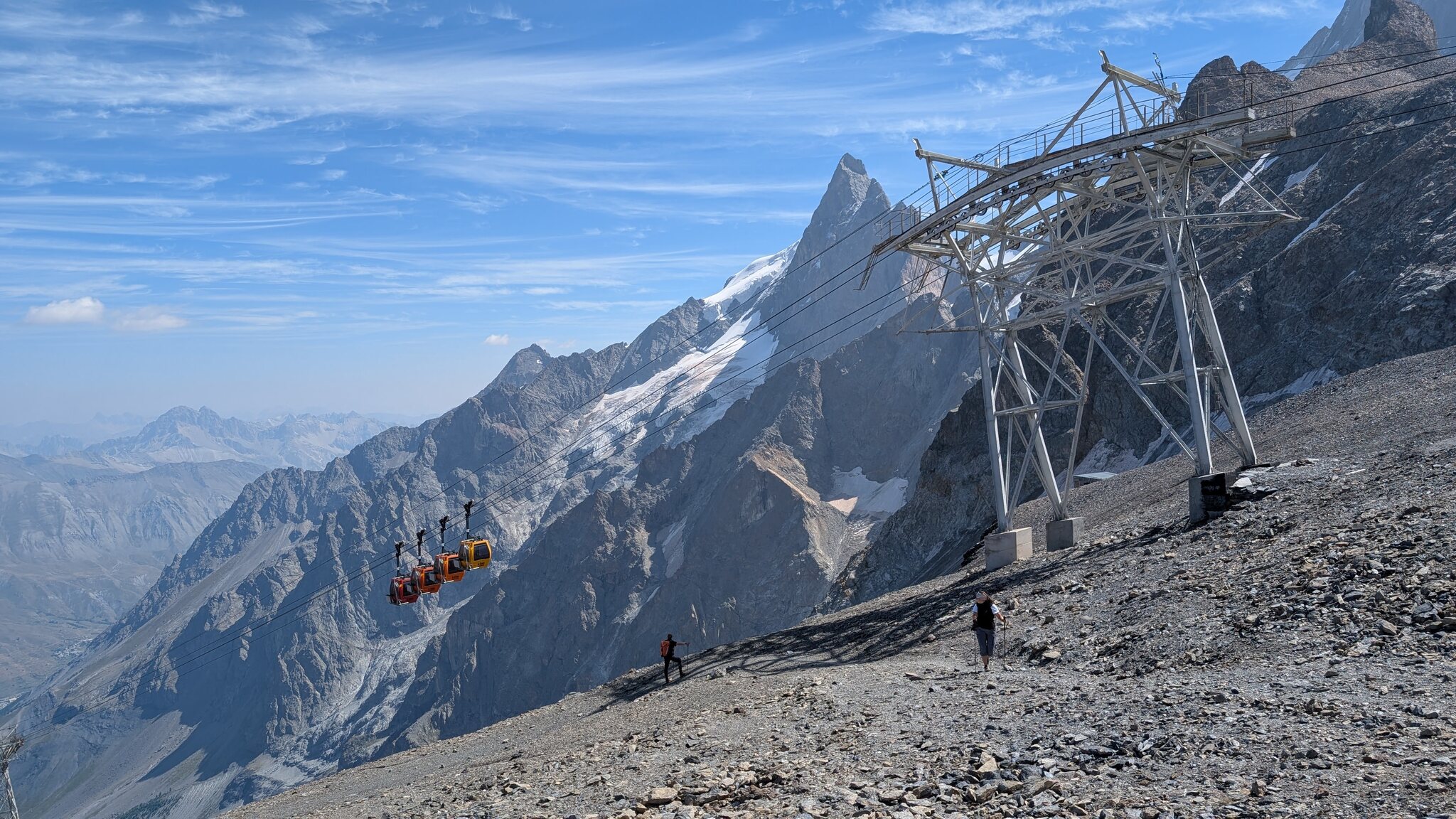 Passstraße zum Col de l'Iseran mit gleichnamiger neuer Gondelbahn und der Pendelbahn aus dem Tal