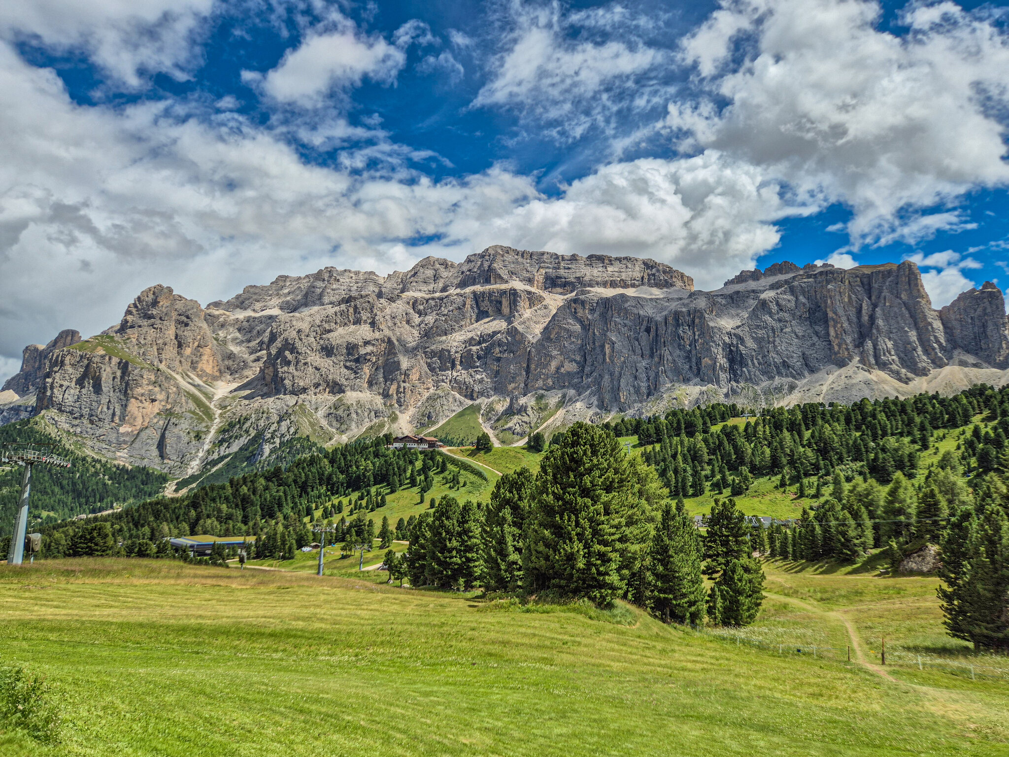 Während der Aufstieges hat man immer einen tollen Blick zum Heiligkreuzkofel. Nach einer Stunde erreichen wir auch schon die Gardenaccia-Hütte für eine kurze Rast. Der Abstieg erfolgt über den Normalweg durch eine kleine Scharte. Da es erst kurz nach 12 war, entschieden wir uns, über den Flowtrail abzufahren und unsere Tour gegenüber in Richtung Piz la Ila ins blaue Meer zu verlängern. Zunächst entlang der roten Gran Risa und dann über die blaue Umfahrung geht es bis zur La Fraina Talstation. Von dort weiter bis zu gleichnamiger Hütte Über verschiedene Wege geht es zurück nach Corvara. Wenn auch das Wetter heute gut gehalten hat, sind die Temperaturen eher weniger sommerlich gewesen. Im Pool war es zum Glück wärmer
