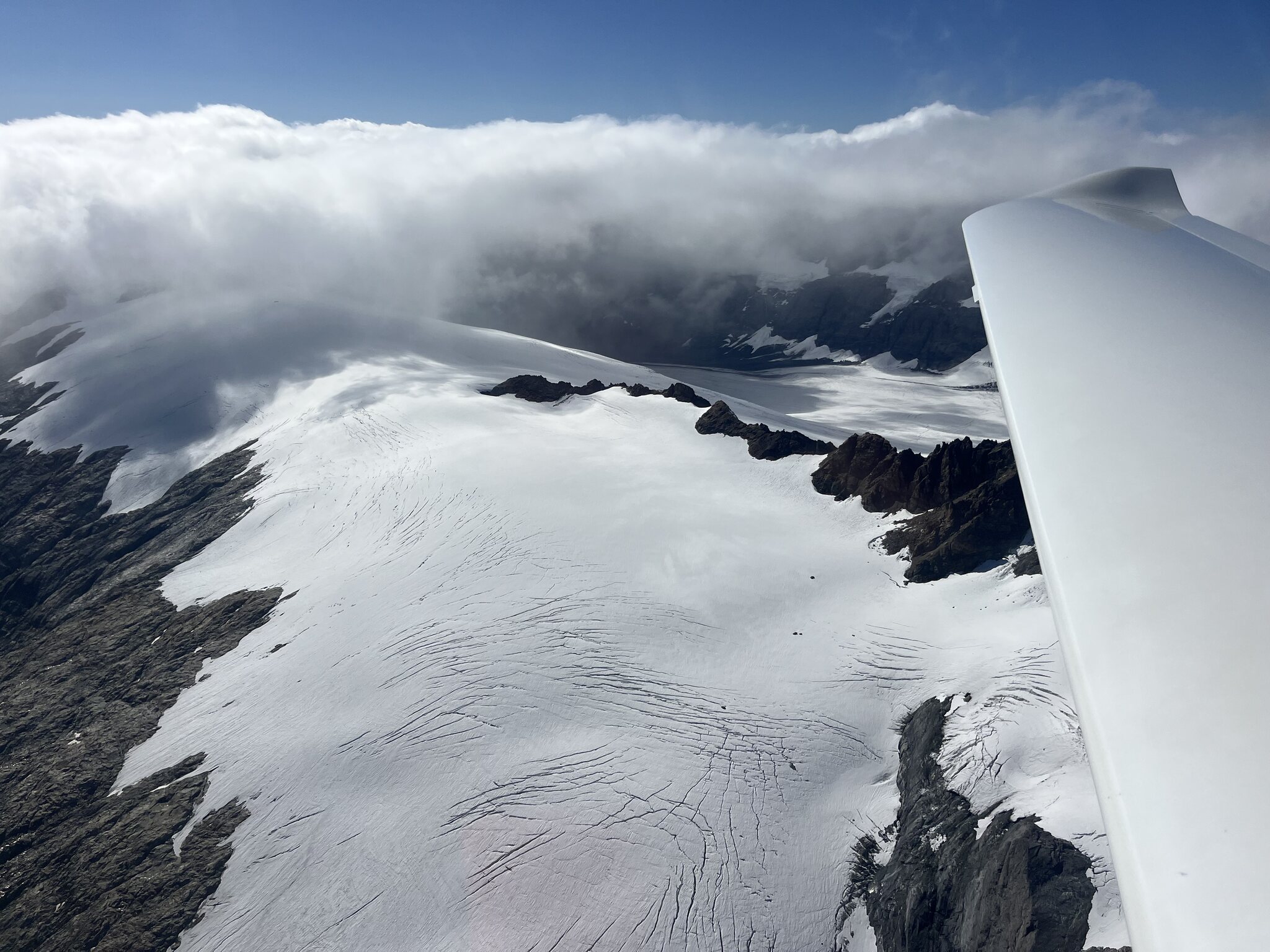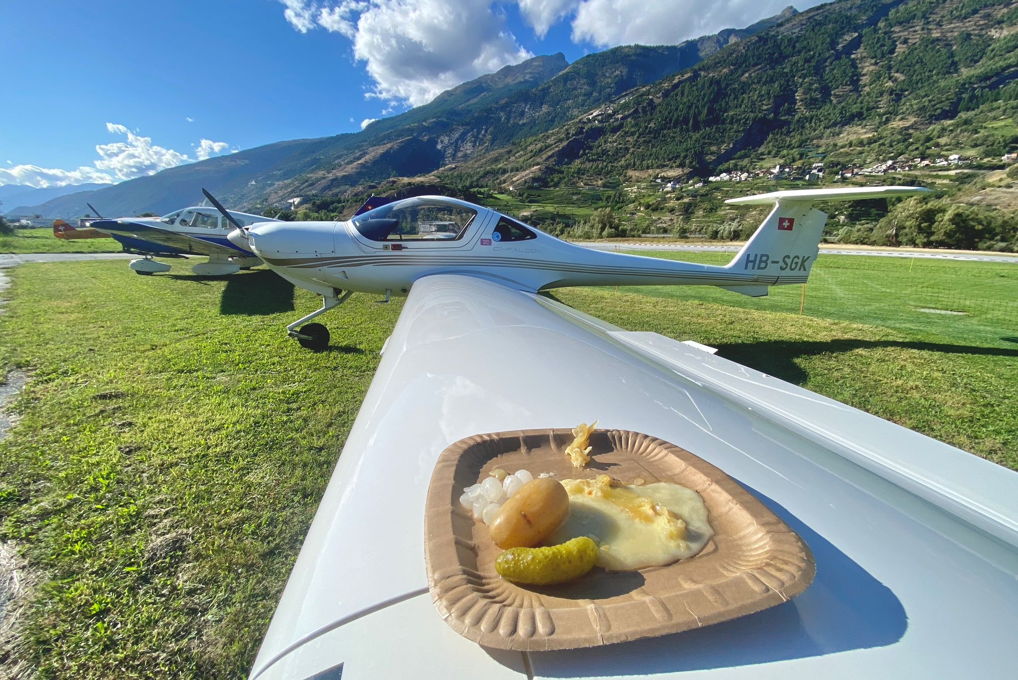 Was tun, wenn zwei Anlässe terminlich kollidieren? Man legt sie zusammen! Unser Sunsetflug mit der Fluggruppe Kägiswil fällt drum mit dem FlyIn in Raron zusammen. Ich konnte meine Fliegerkollegen überzeugen, dass wir uns etwas früher treffen und einen Besuch in Raron machen. Um die Mittagszeit regenete es noch heftig und beim Eintreffen um 15.30 Uhr in Kägiswil sieht es auch nicht gut aus für den Flug über die Alpen. Den grossen Umweg über Montreux wollen wir aus Zeitgründen nicht. Wir vereinbaren, dass ich vorausfliege und wir dann unterwegs auf der „Schnorri-Frequenz“ entscheiden, ob es gelingt oder wir alternativ nach Ecuvillens (bei Fribourg) fliegen.