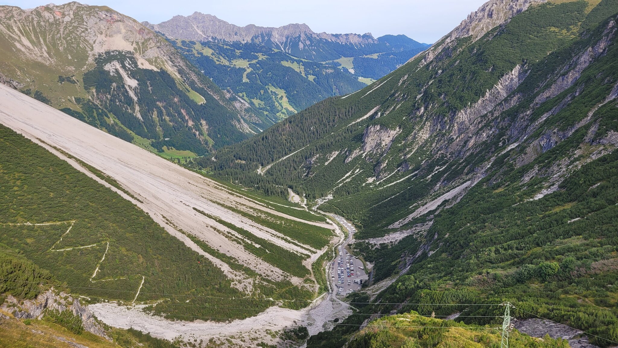 Blick hinab zum Parkplatz und einem beeindruckenden Schuttkegel links:
