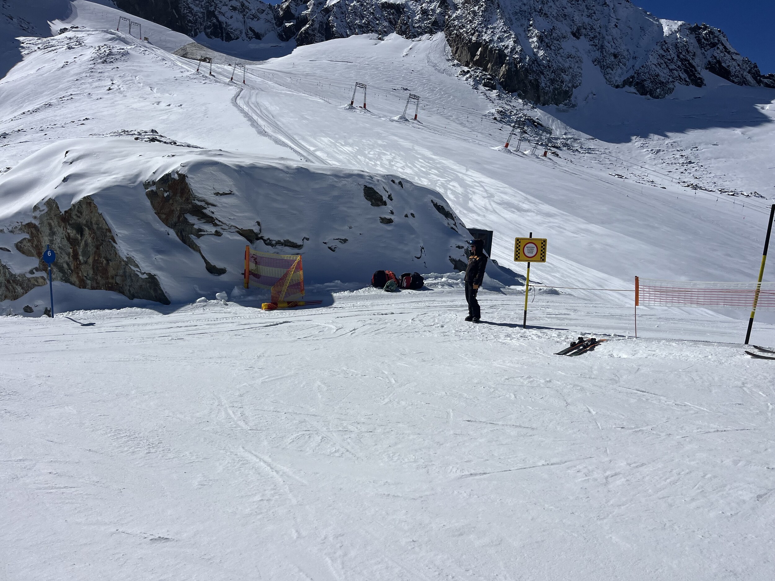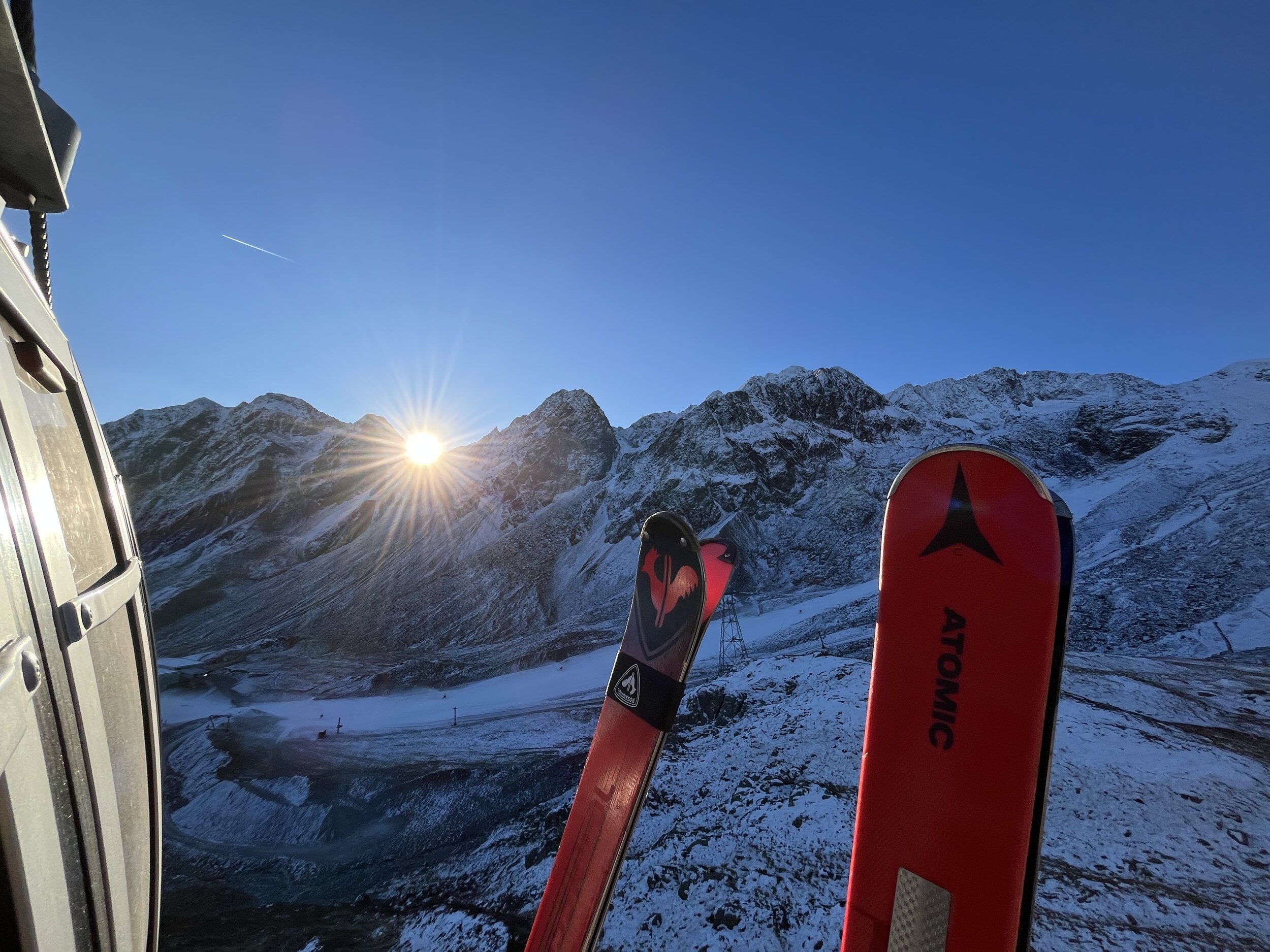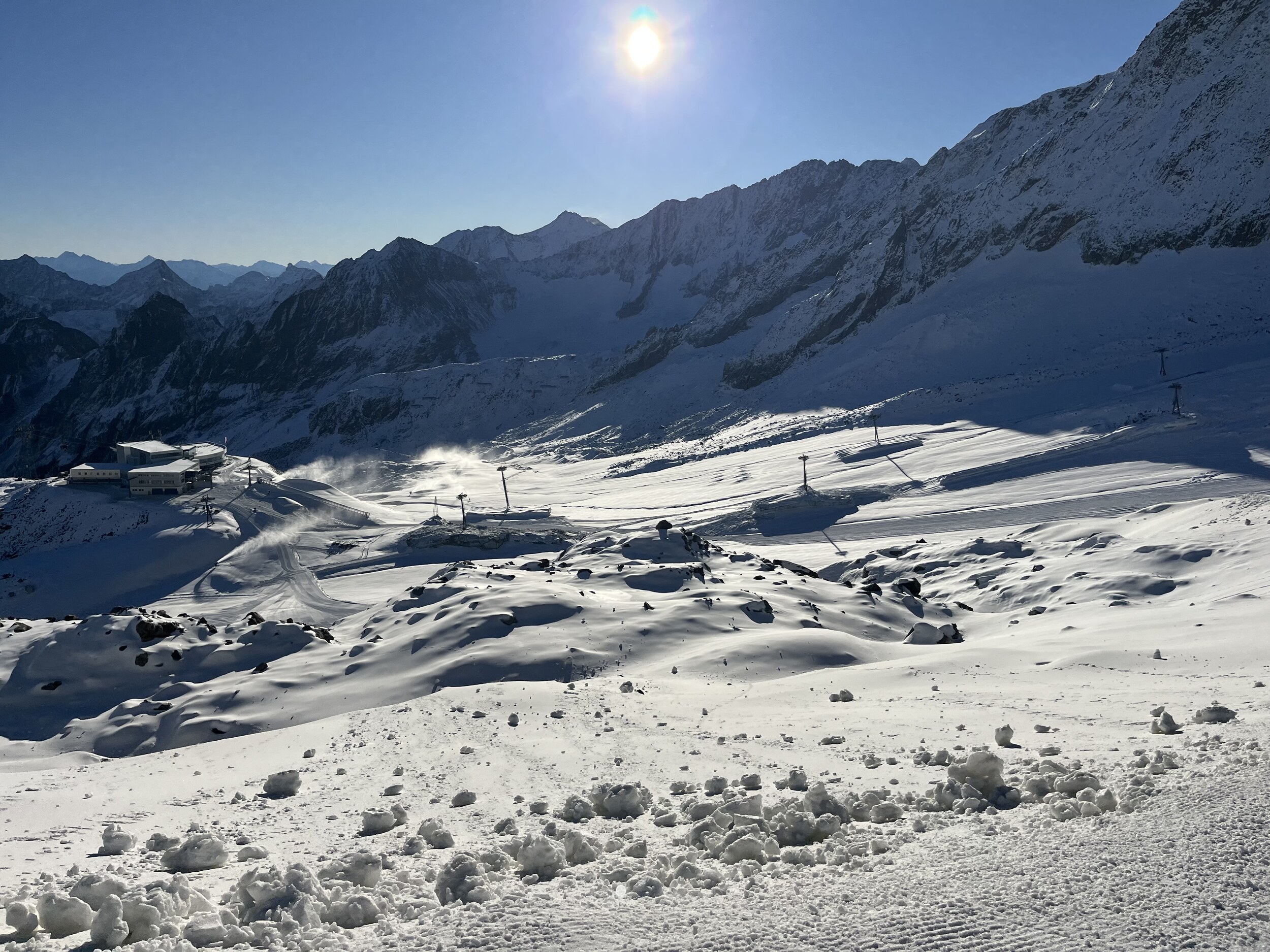 Vor der Bahn dann eine kurze Kolonne an Skirennfahrern. Und natürlich schaffen es die Stubaier mal wieder nicht, pünktlich zu öffnen. Erst um 8.04 Uhr geht es los. Mit nervigen Skikids in der Gondel, denen man mal noch erklären müsste, dass man sich auch im Tal anziehen könnte. Die Erwartungen sind tief. Aber das Wetter ist toll. Edit 8.45 Uhr: Der untere Teil der 7 ist nicht bereit. Ich bin auch heute einer der ersten. Für die Skiteams ist die Daunfernerpiste offen. Da stehen viele Bullys bereit. Keiner vor mir ist offenbar Privatskifahrer. Also ziehe ich die erste Spur auf dieser einzigen Piste. Eher auf der härteren Seite, aber griffig. Stubaier Präparierung. Noch Fragen? Edit 10.30 Uhr: