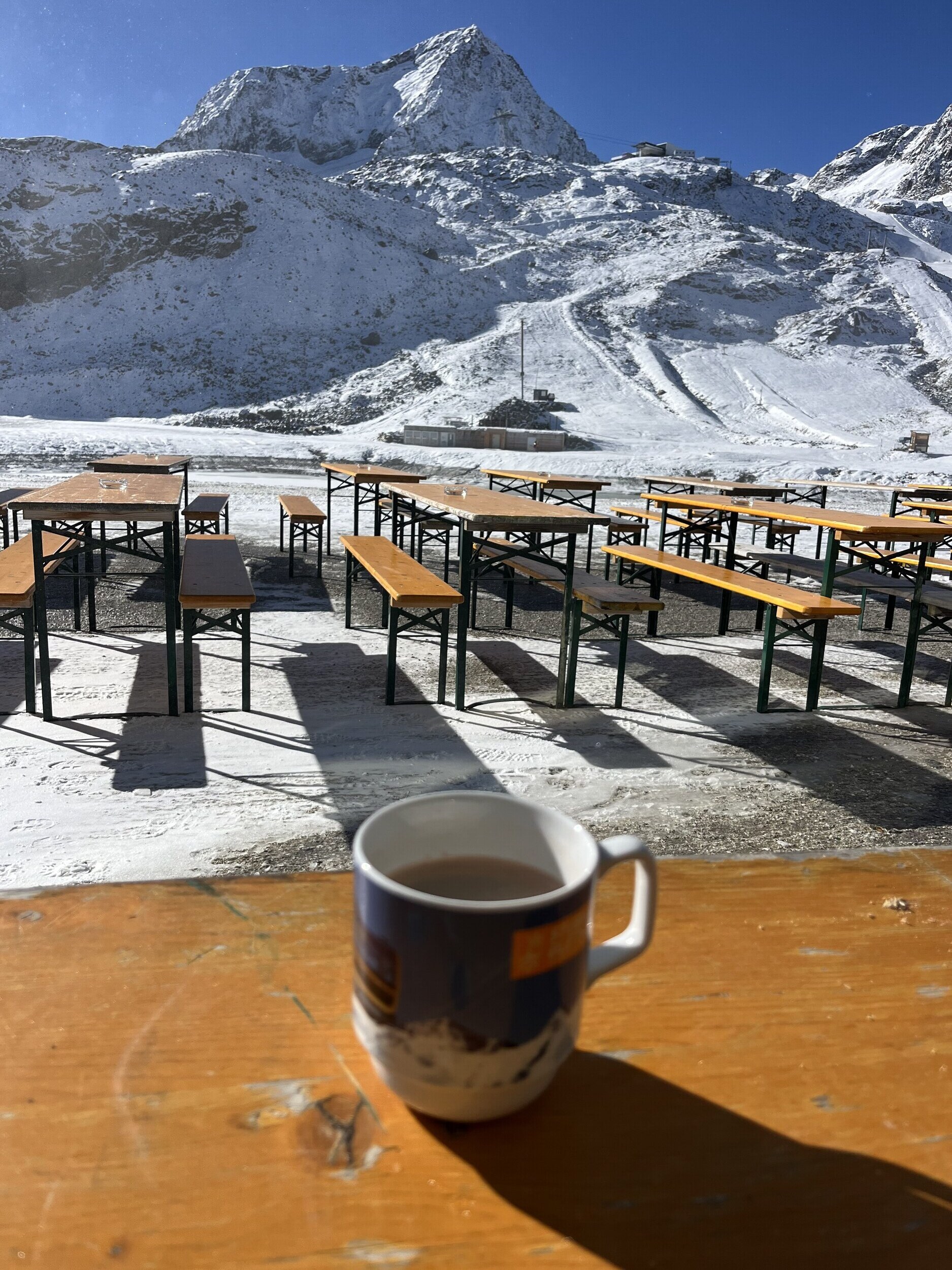 Auf dem Steilhang und darunter wird es leider nun etwas knollig. Daunferner sähe schön aus. Dumm halt, dass man den Lift fünf Monate ausser Betrieb hat und dann am Vorabend beim Probestart merkt, dass kein Strom da ist… Wenn ich um 10.30 Uhr im Restaurant sitze, ist entweder das Wetter schlecht oder das Restaurant was Besonderes. Beides trifft nicht zu. Sondern ich bin am Stubaier…