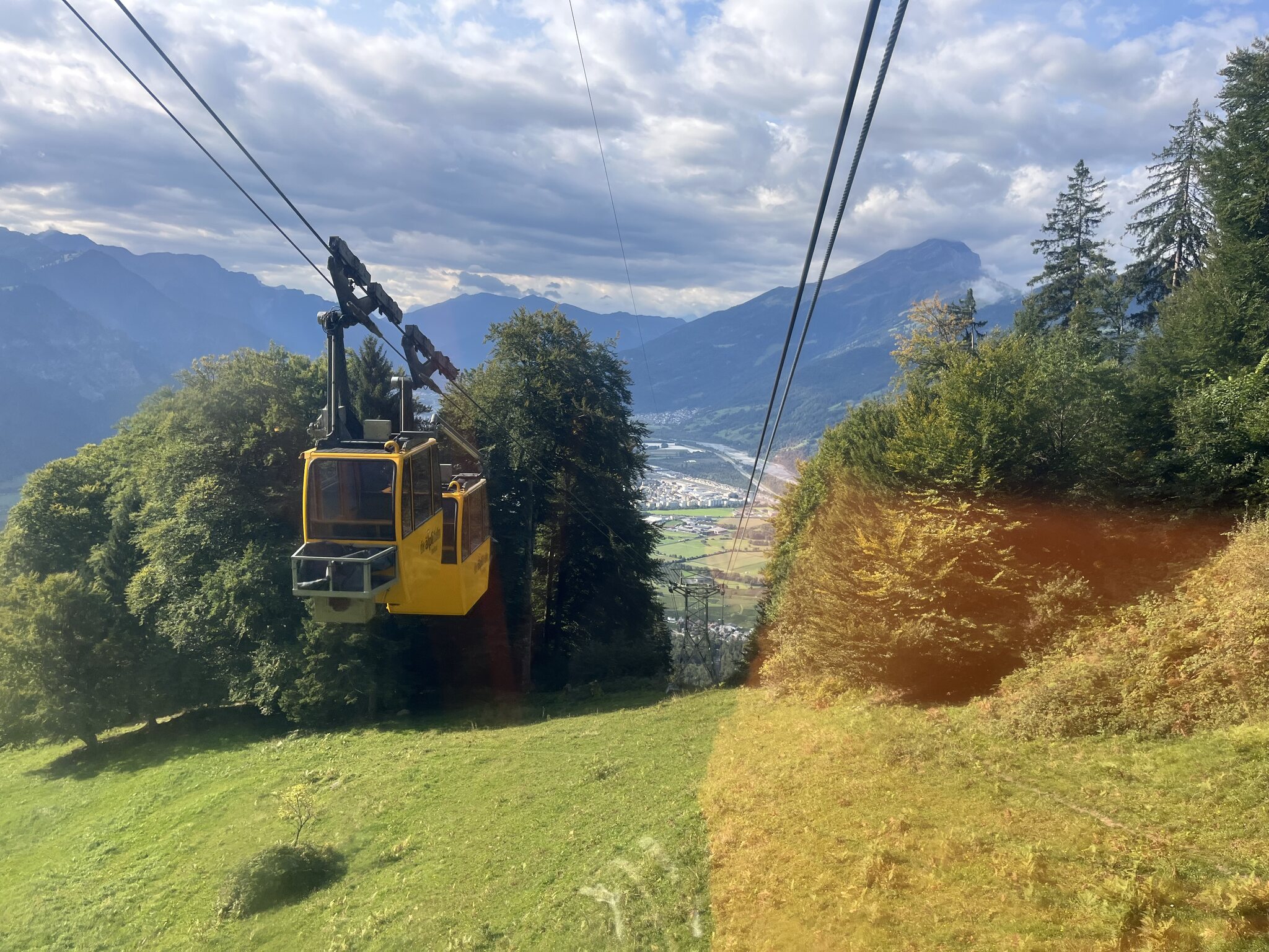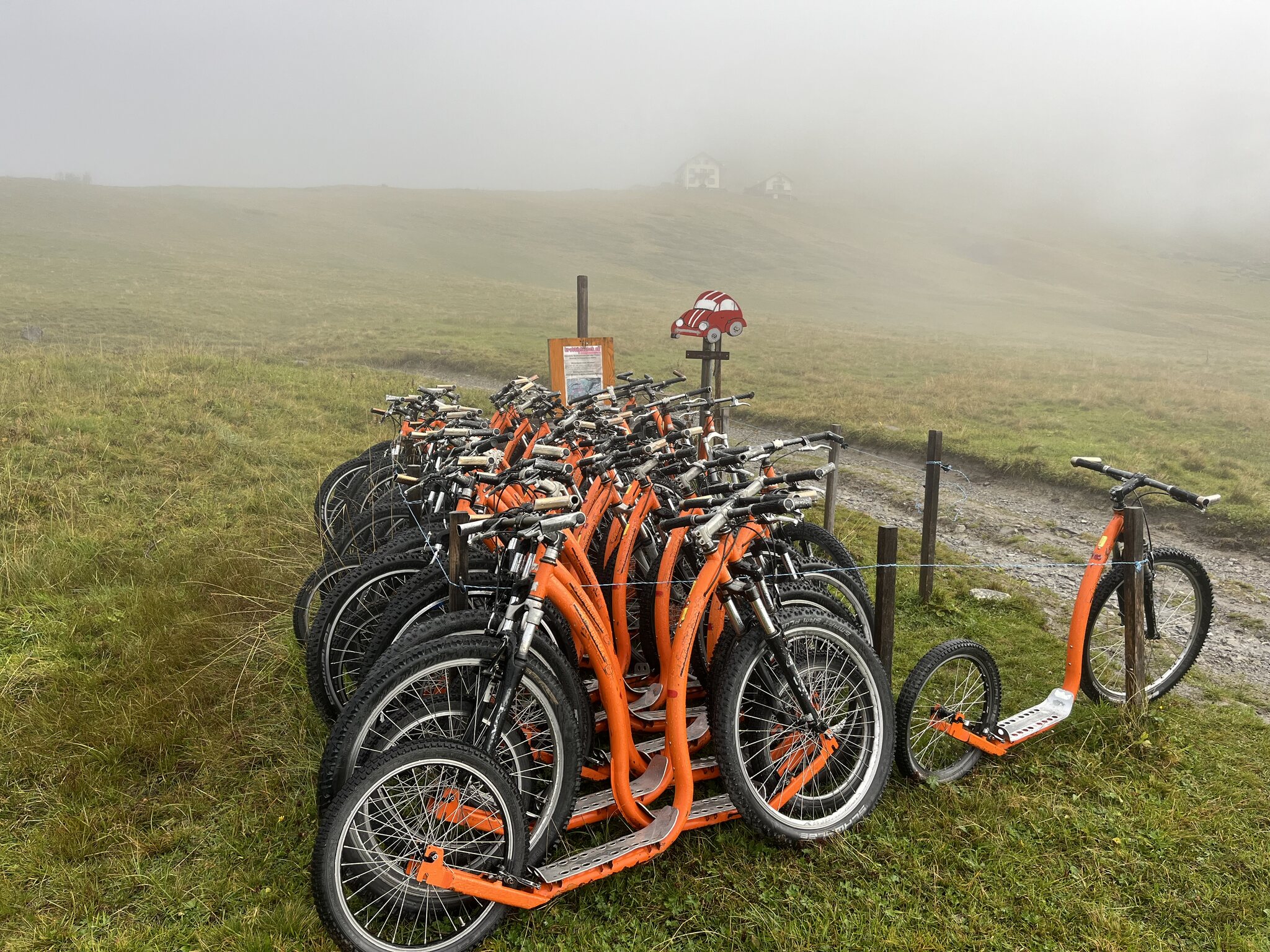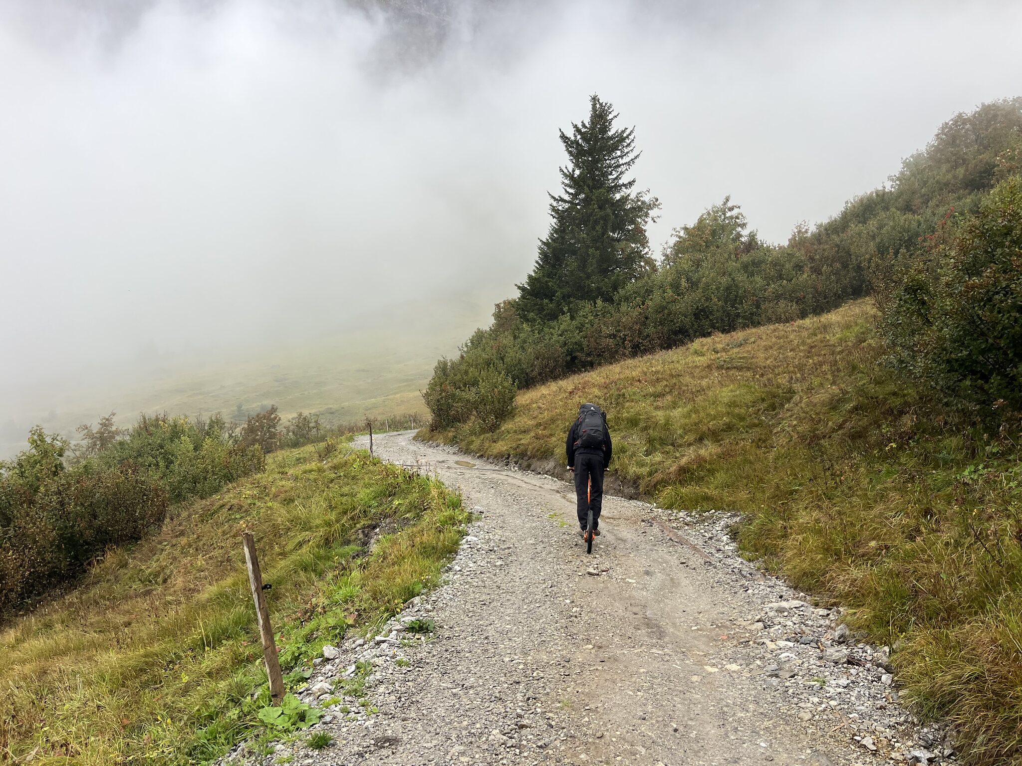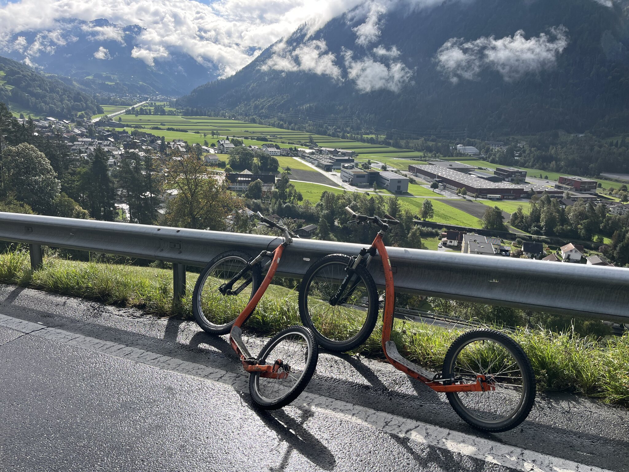 Ein gemütliches Aufstehen und Zmörgele ist leider nicht drin. Spätestens um 8 Uhr muss man gefrühstückt haben (das Zmorge ist leider sehr spartanisch) und bald mal die Hütte verlassen. So bleibt uns nicht wirklich Zeit, das schöne Wetter abzuwarten. Sondern wir machen uns um 8.30 Uhr bei leichtem Nieselregen auf den Weg: Der Fussmarsch dauert nur wenige Minuten, bis wir die in der Hütte bezahlten Trottinetts übernehmen können. So sparen wir uns den vierstündigen Abstieg. Wir werden fürchterlich nass und dreckig. Schlamm bis fast zum Nacken hoch, weil diese Trottis leider keine Schutzbleche haben. Die Strecke ist spannend und die Gegensteigungen sind sehr kurz. Kurz vor Seewis beginnt eine asphaltierte Strasse -> weniger Schlamm, aber noch mehr Wasser. Erst kurz vor Grüsch zeigt sich dann die Sonne. Dank dem Brunnen am Bahnhof Grüsch, den wir ziemlich genau 1h nach Abfahrt erreichen, können wir uns etwas säubern und ziehen trockene, saubere Kleidung an. Aber uns ist die Lust an der Fortsetzung der Wanderung - ursprünglich sollte es mit dem Postauto nach Valzeina gehen, um dann zu Fuss nach Igis abzusteigen vergangen… sodass wir direkt die Zugverbindung zurück nach Hergiswil nehmen.