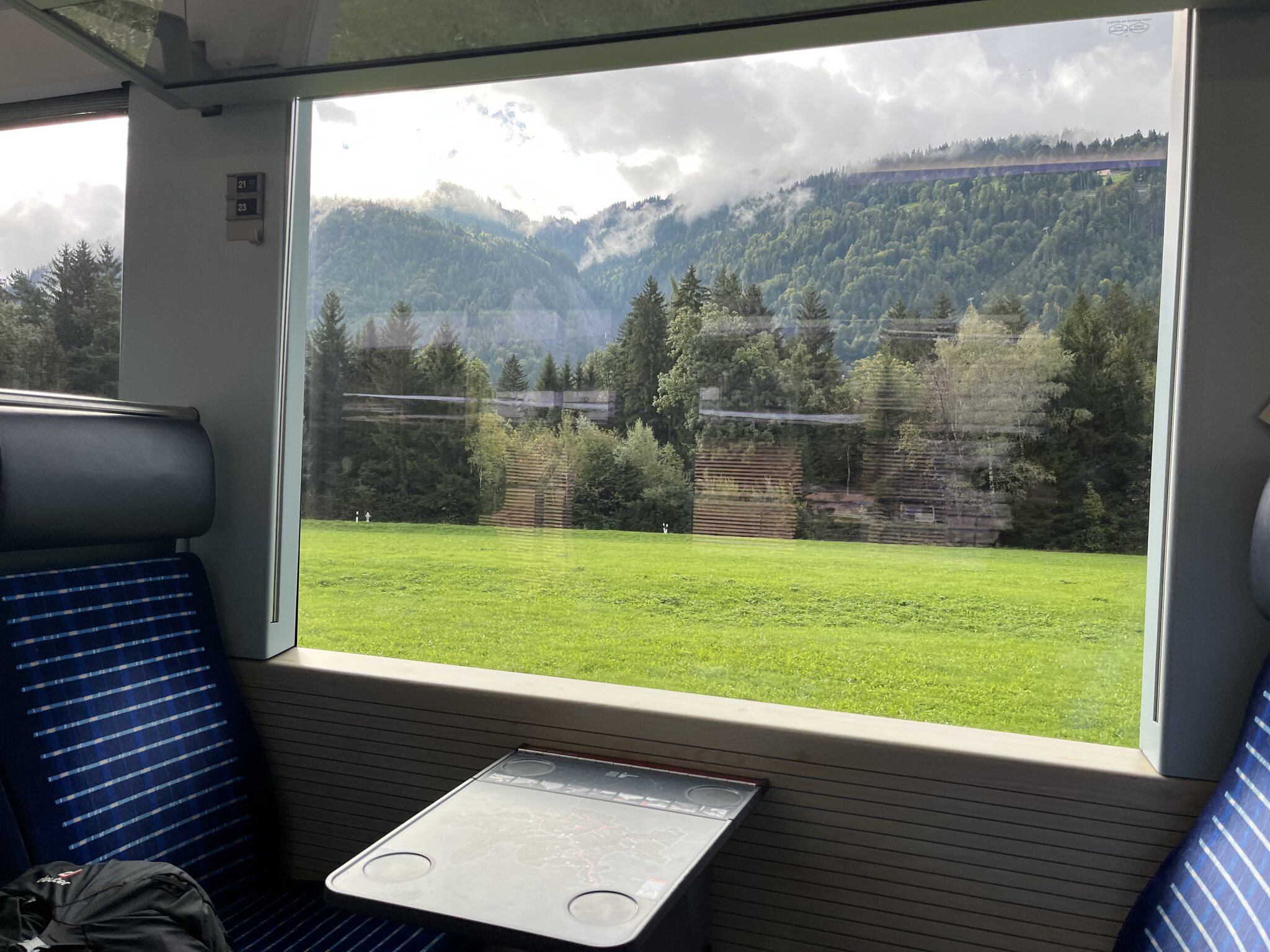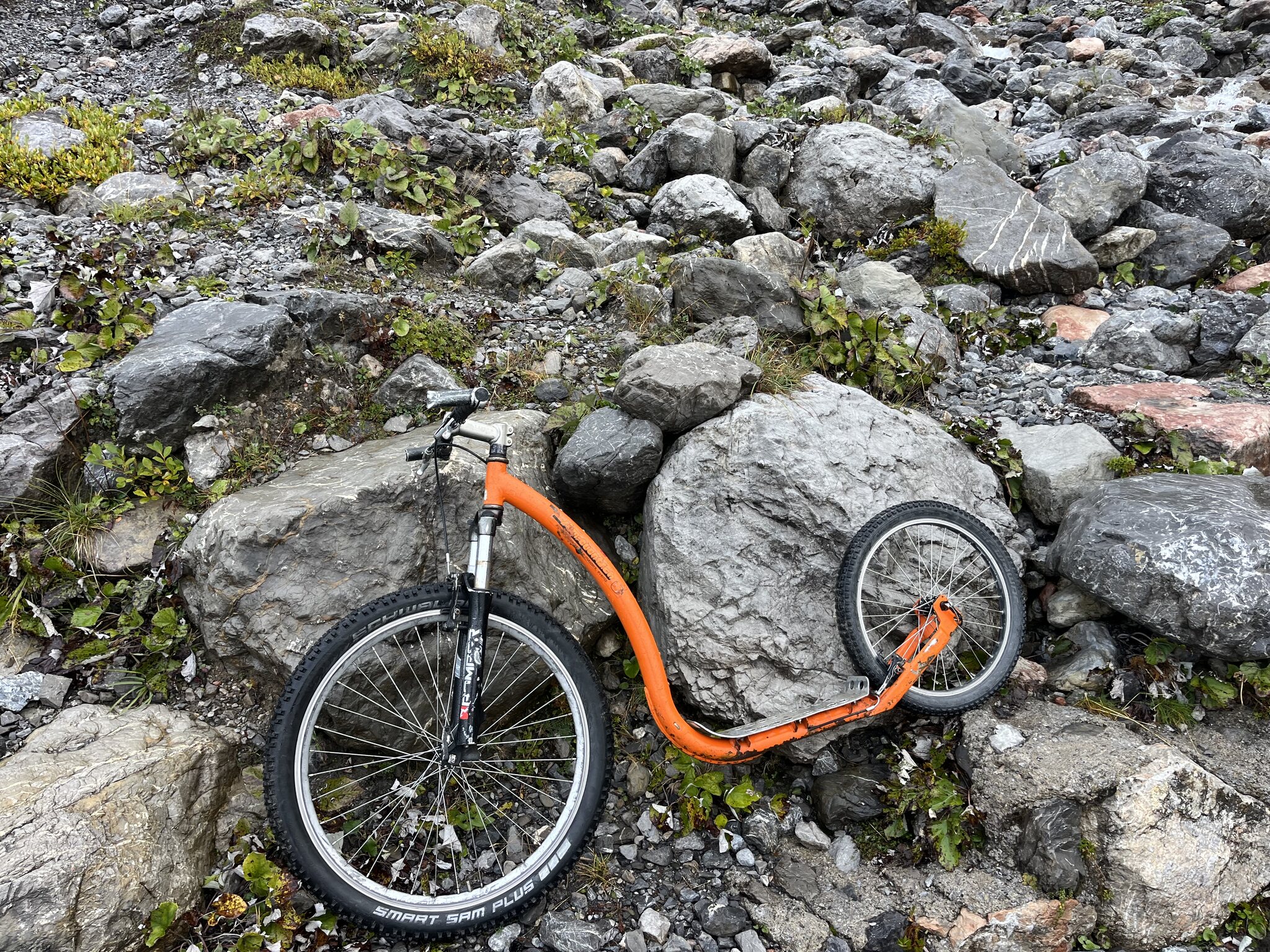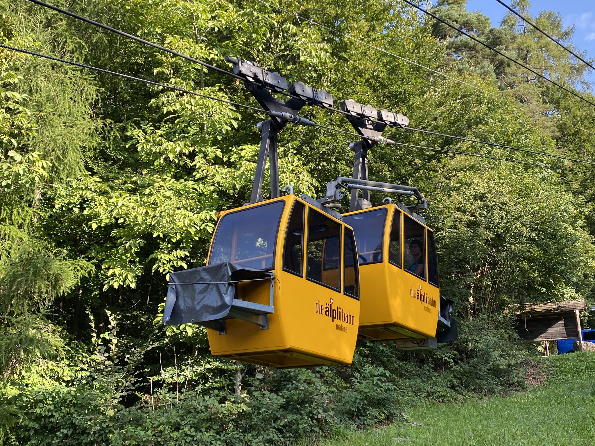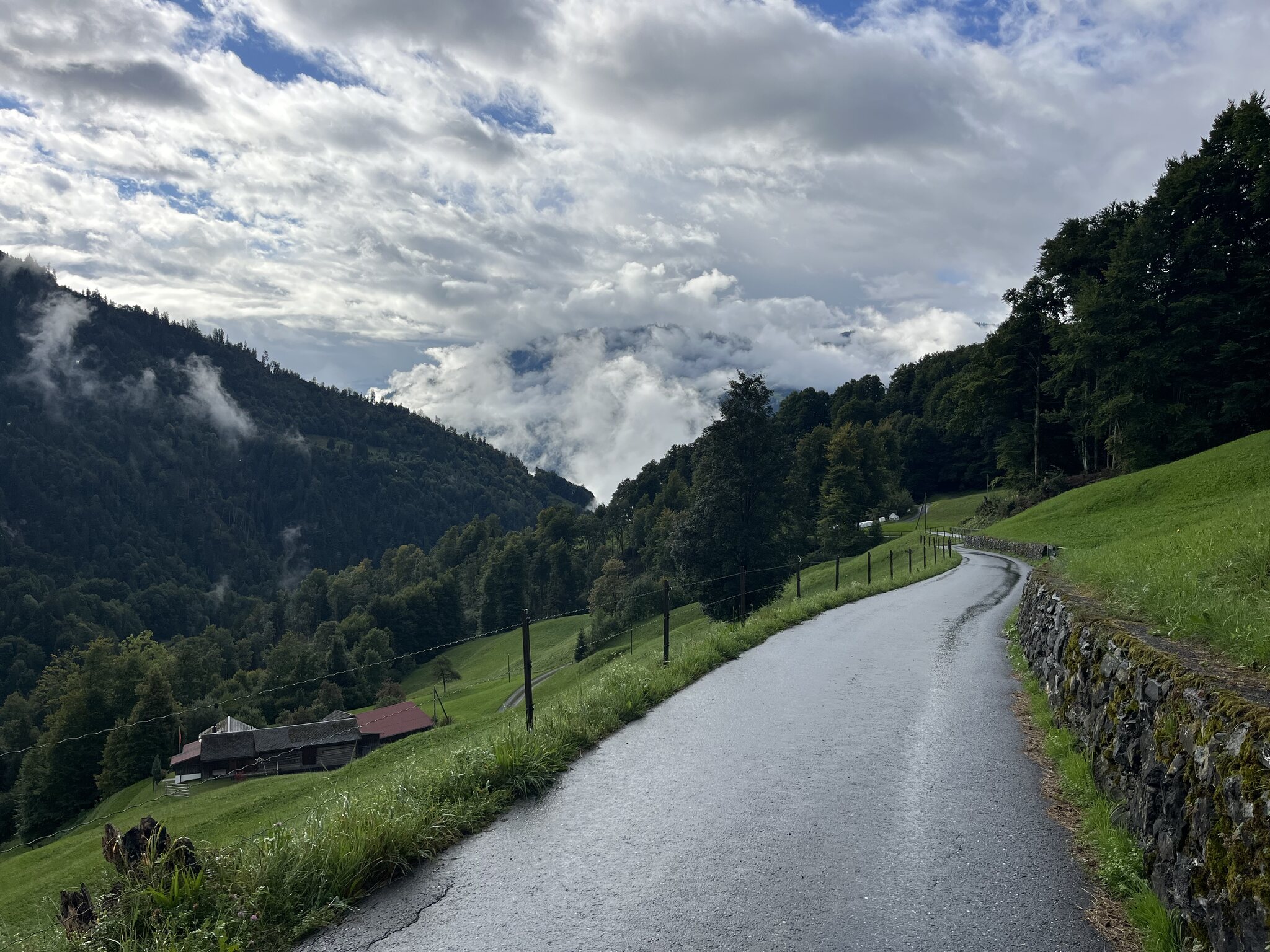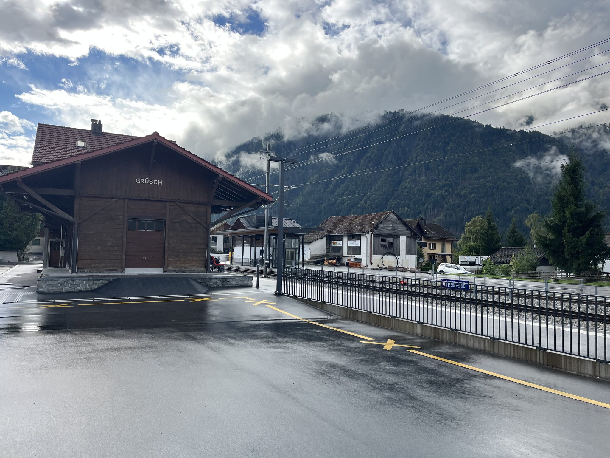 Ein gemütliches Aufstehen und Zmörgele ist leider nicht drin. Spätestens um 8 Uhr muss man gefrühstückt haben (das Zmorge ist leider sehr spartanisch) und bald mal die Hütte verlassen. So bleibt uns nicht wirklich Zeit, das schöne Wetter abzuwarten. Sondern wir machen uns um 8.30 Uhr bei leichtem Nieselregen auf den Weg: Der Fussmarsch dauert nur wenige Minuten, bis wir die in der Hütte bezahlten Trottinetts übernehmen können. So sparen wir uns den vierstündigen Abstieg. Wir werden fürchterlich nass und dreckig. Schlamm bis fast zum Nacken hoch, weil diese Trottis leider keine Schutzbleche haben. Die Strecke ist spannend und die Gegensteigungen sind sehr kurz. Kurz vor Seewis beginnt eine asphaltierte Strasse -> weniger Schlamm, aber noch mehr Wasser. Erst kurz vor Grüsch zeigt sich dann die Sonne. Dank dem Brunnen am Bahnhof Grüsch, den wir ziemlich genau 1h nach Abfahrt erreichen, können wir uns etwas säubern und ziehen trockene, saubere Kleidung an. Aber uns ist die Lust an der Fortsetzung der Wanderung - ursprünglich sollte es mit dem Postauto nach Valzeina gehen, um dann zu Fuss nach Igis abzusteigen vergangen… sodass wir direkt die Zugverbindung zurück nach Hergiswil nehmen.