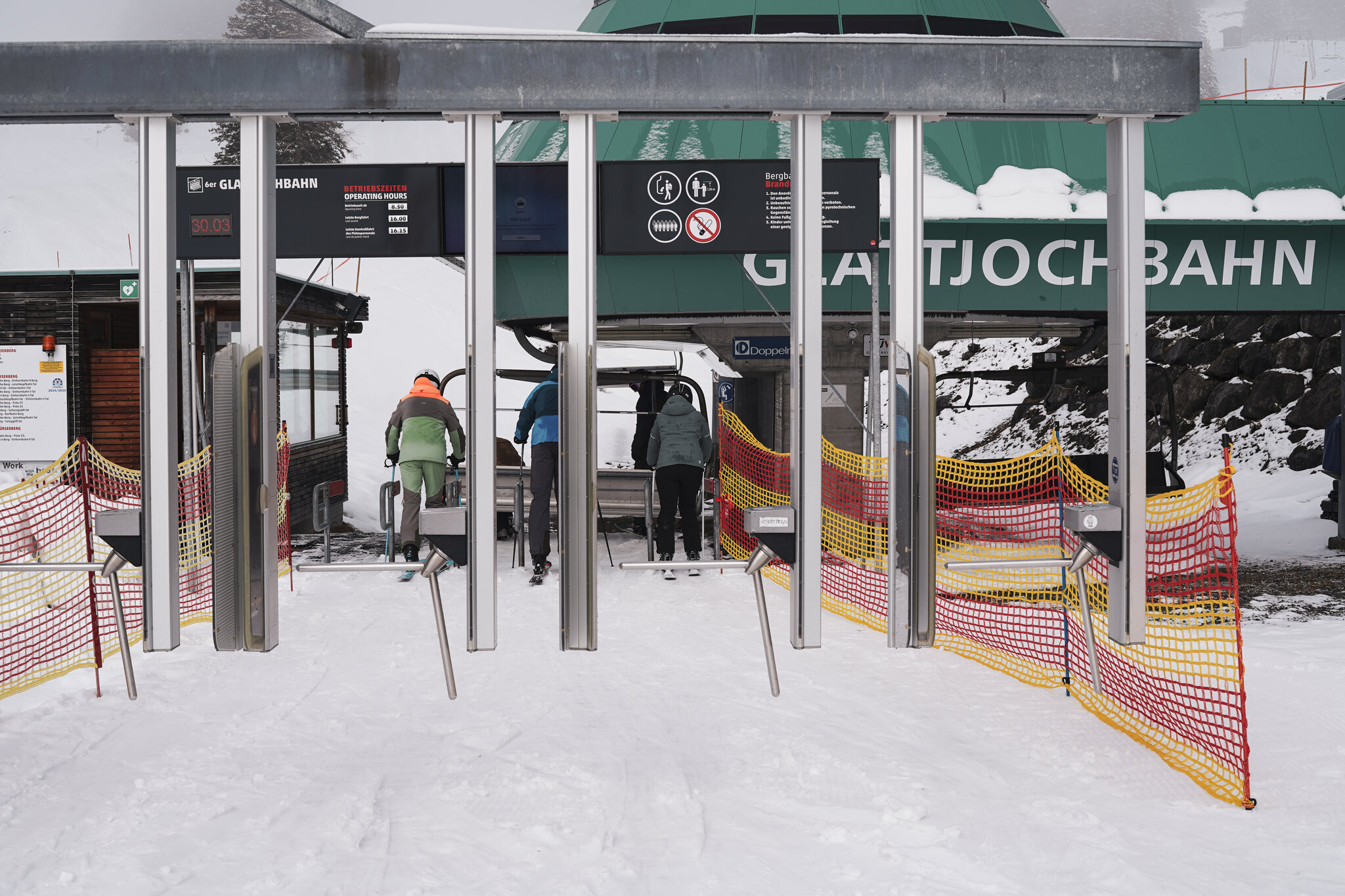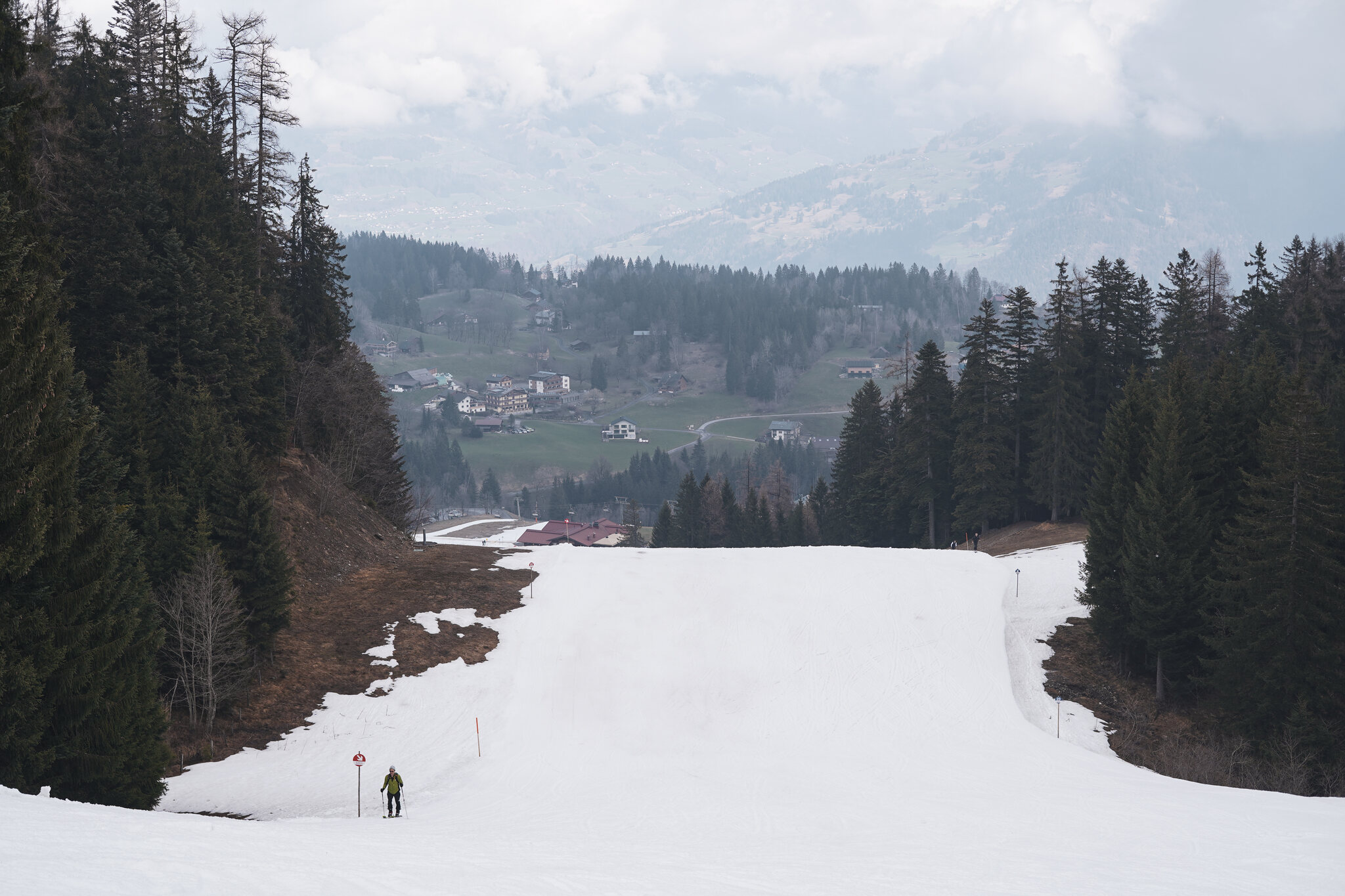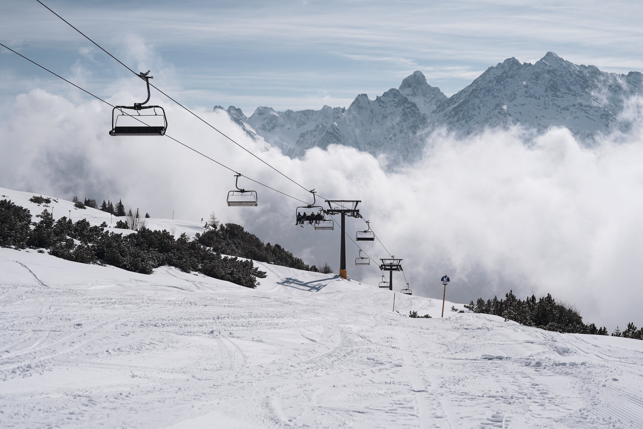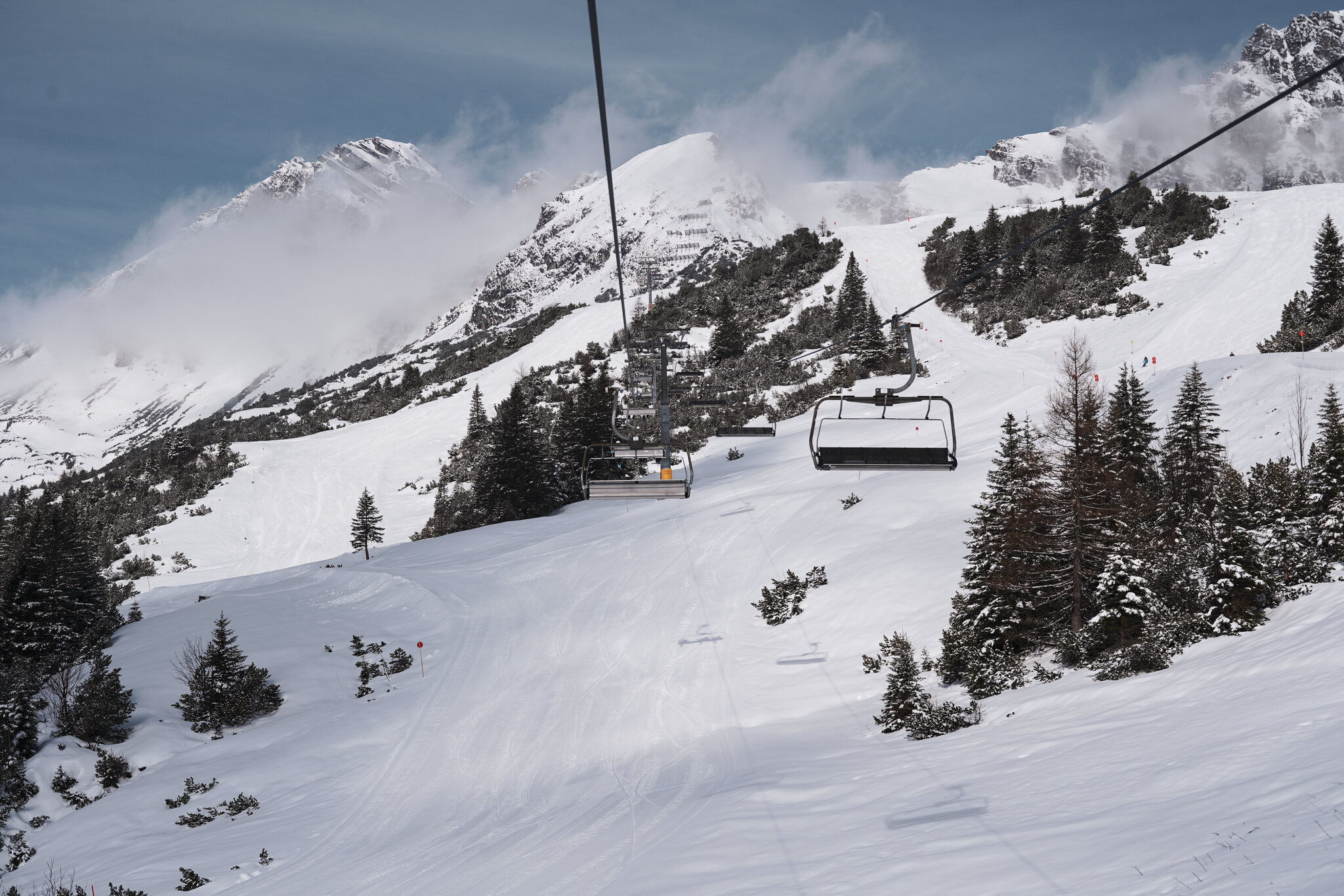 Das Wetter wechselte zwischen sonnigen Abschnitten und einzelnen Nebelschwaden, die über den Hang zogen. Auf den Abfahrten war kaum mehr jemand anzutreffen, abgesehen vom Snowpark Lift, wo sich noch einige Snowboarder hielten. Ansonsten war ich weitgehend allein unterwegs. Während ich meine Schwünge auf den gut präparierten Pisten genoss, sammelten die Mitarbeitenden bereits die Markierungen ein, ein leises aber unübersehbares Zeichen für das Saisonende. Besonders im Fokus standen die Leuschkopfbahn, die Einhornbahn 2 und der parallele Tschenglalift. Für alle drei war es der letzte Betriebstag, bevor sie im Sommer der neuen Gondelbahn mit Mittelstation weichen mussten. Damit wurde dieser Skitag auch zu einem kleinen Abschied, ein letztes Mal hinauf, bevor die Anlagen Geschichte sind.