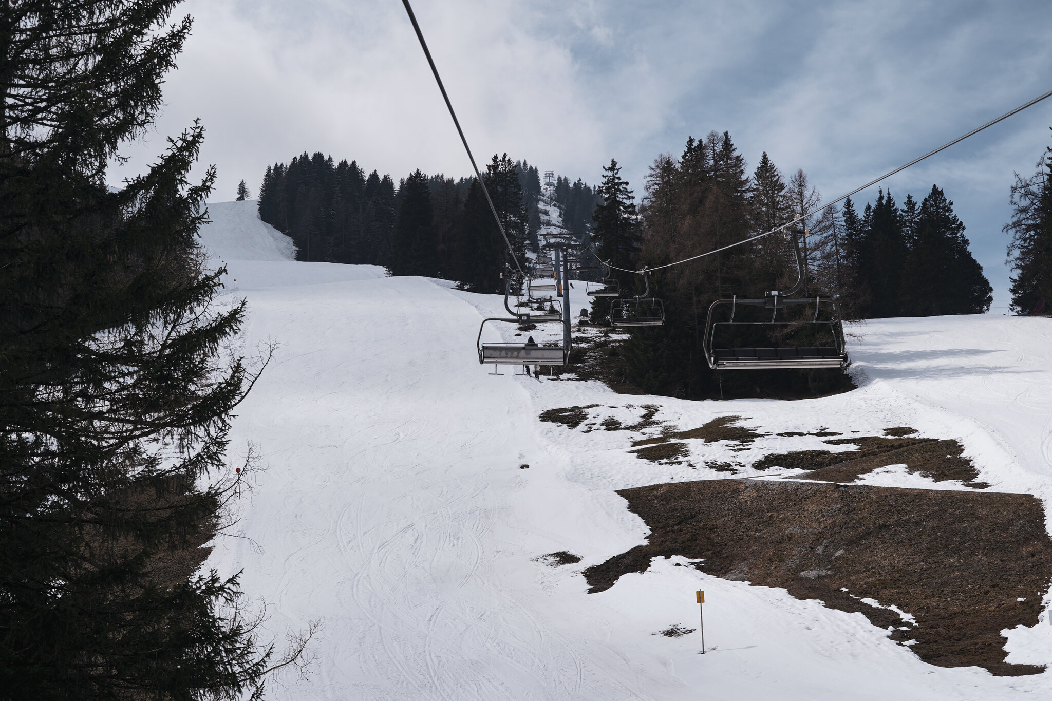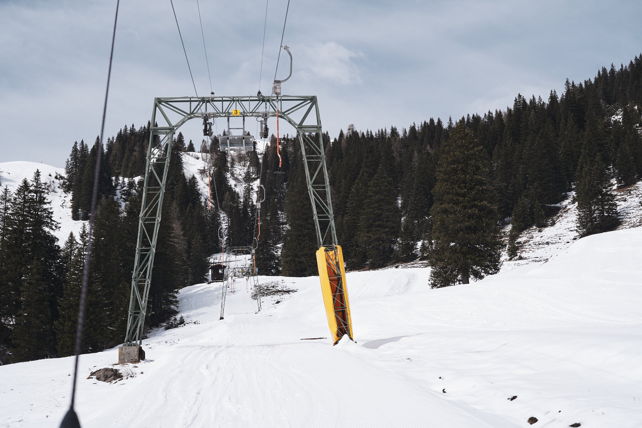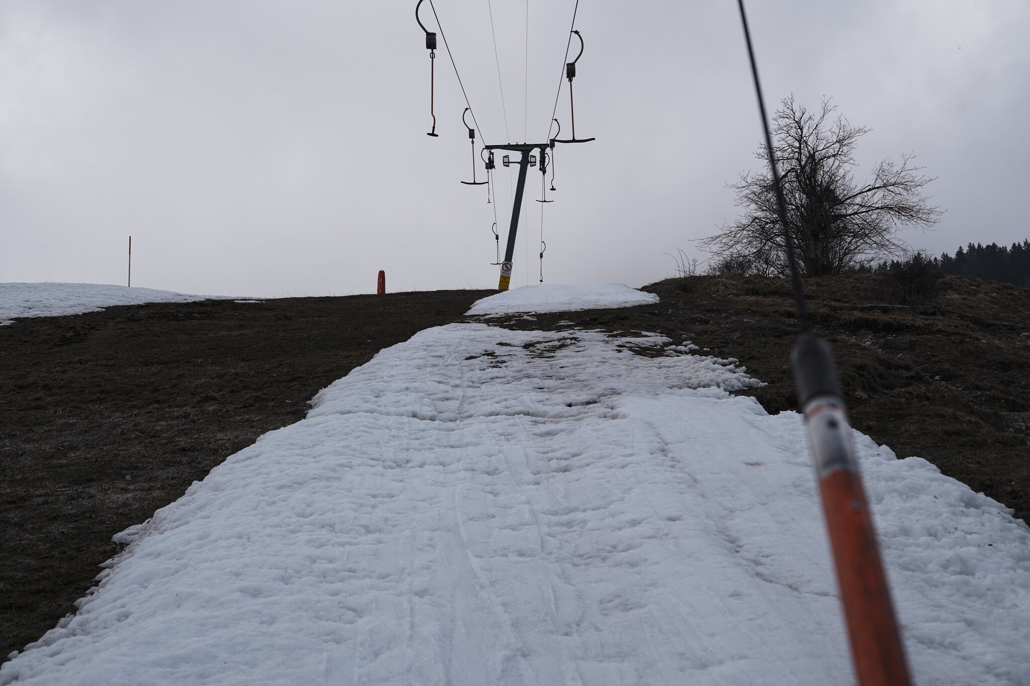 Beim Auswählen der Bilder habe ich mir noch überlegt ob es überhaupt auffällt, aber offenbar werden die Fotos sehr genau angeschaut. Am letzten Betriebstag fehlte wohl die Motivation und der Lift drehte leer seine Runden. Nach der Fahrt wusste ich auch weshalb, die Stelle war von der Talstation aus nicht sichtbar. Ich war mit dem guten Material unterwegs und bin zum Glück ohne Kratzer davongekommen.