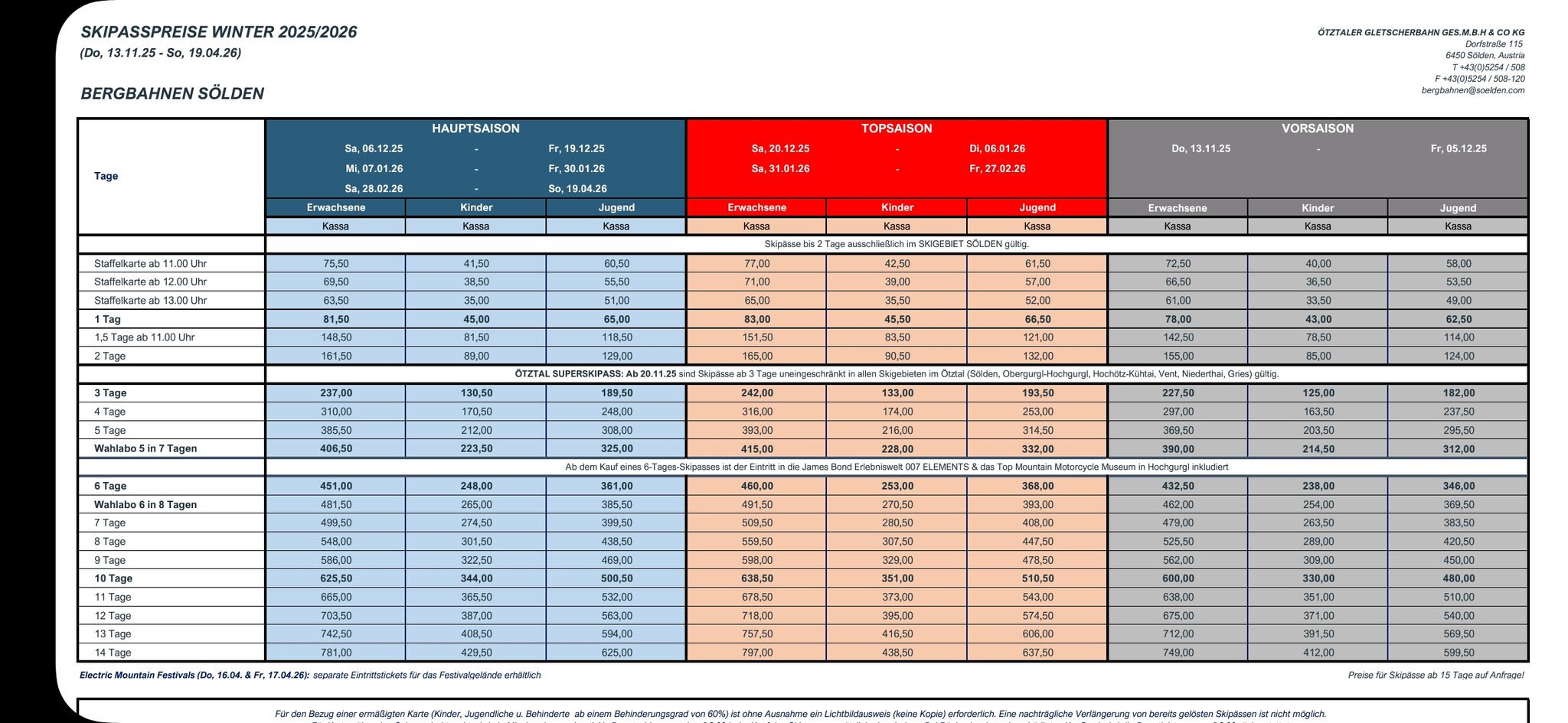 Besser bis zum Oktober warten und vor Ort die Saisonkarte zum Spottpreis kaufen. Waren letztes Jahr meine ich 333€. Lohnt sich schon, wenn man eine Woche dorthin fährt.