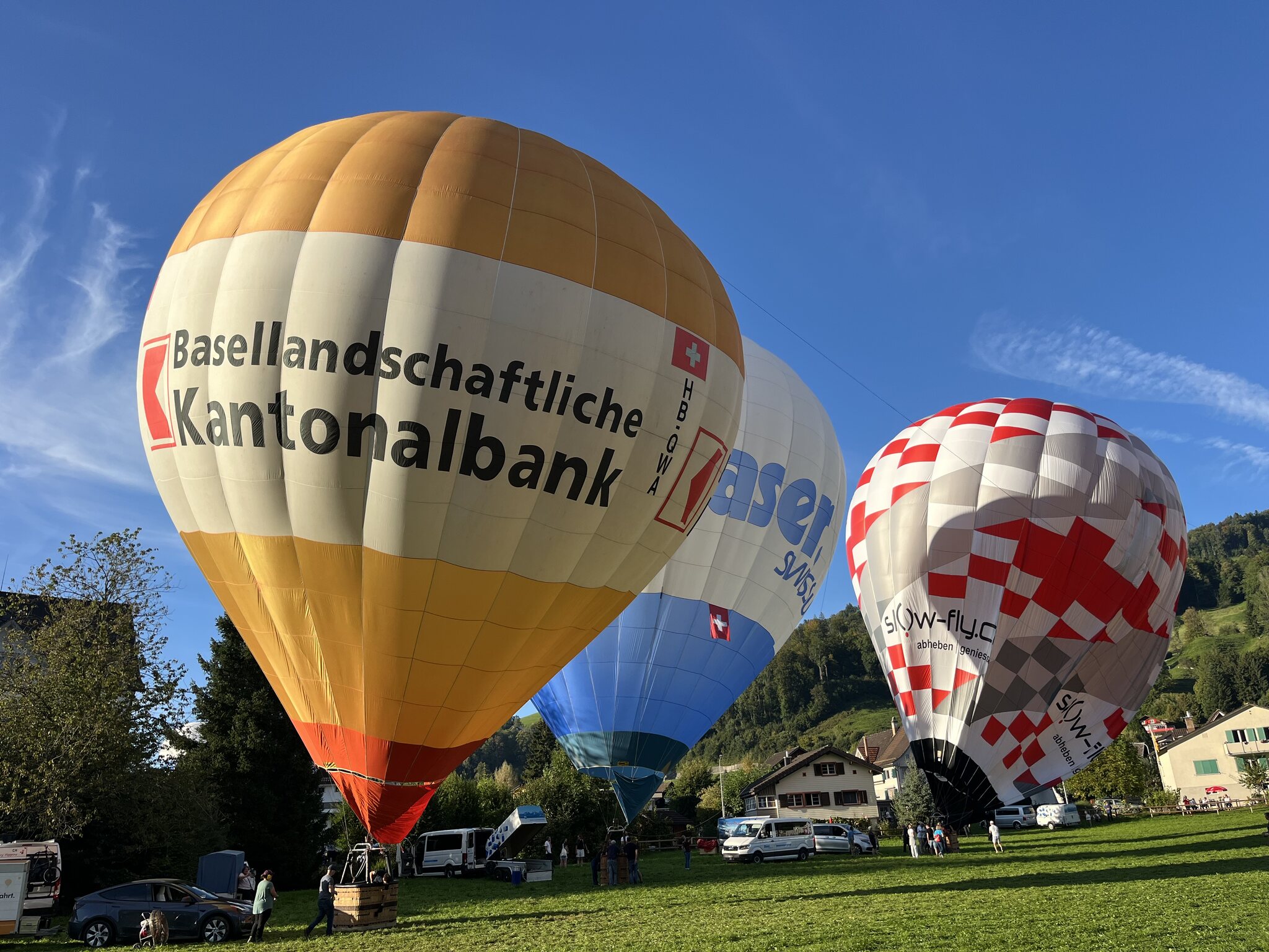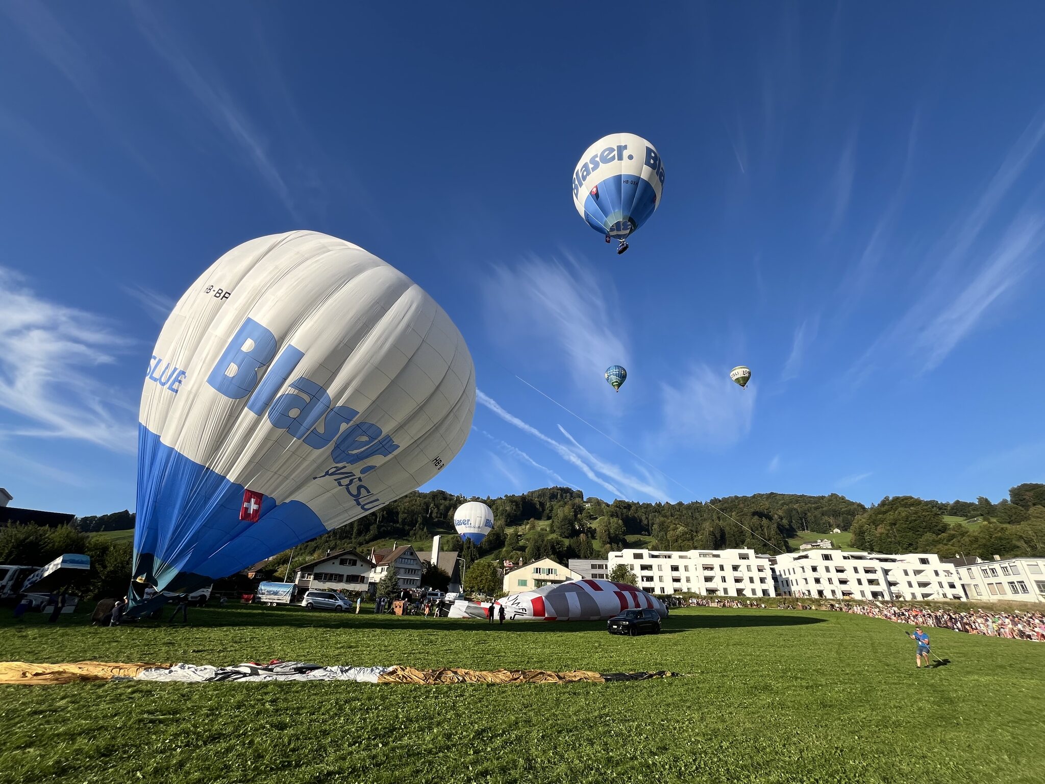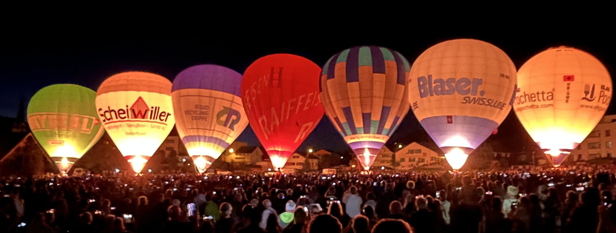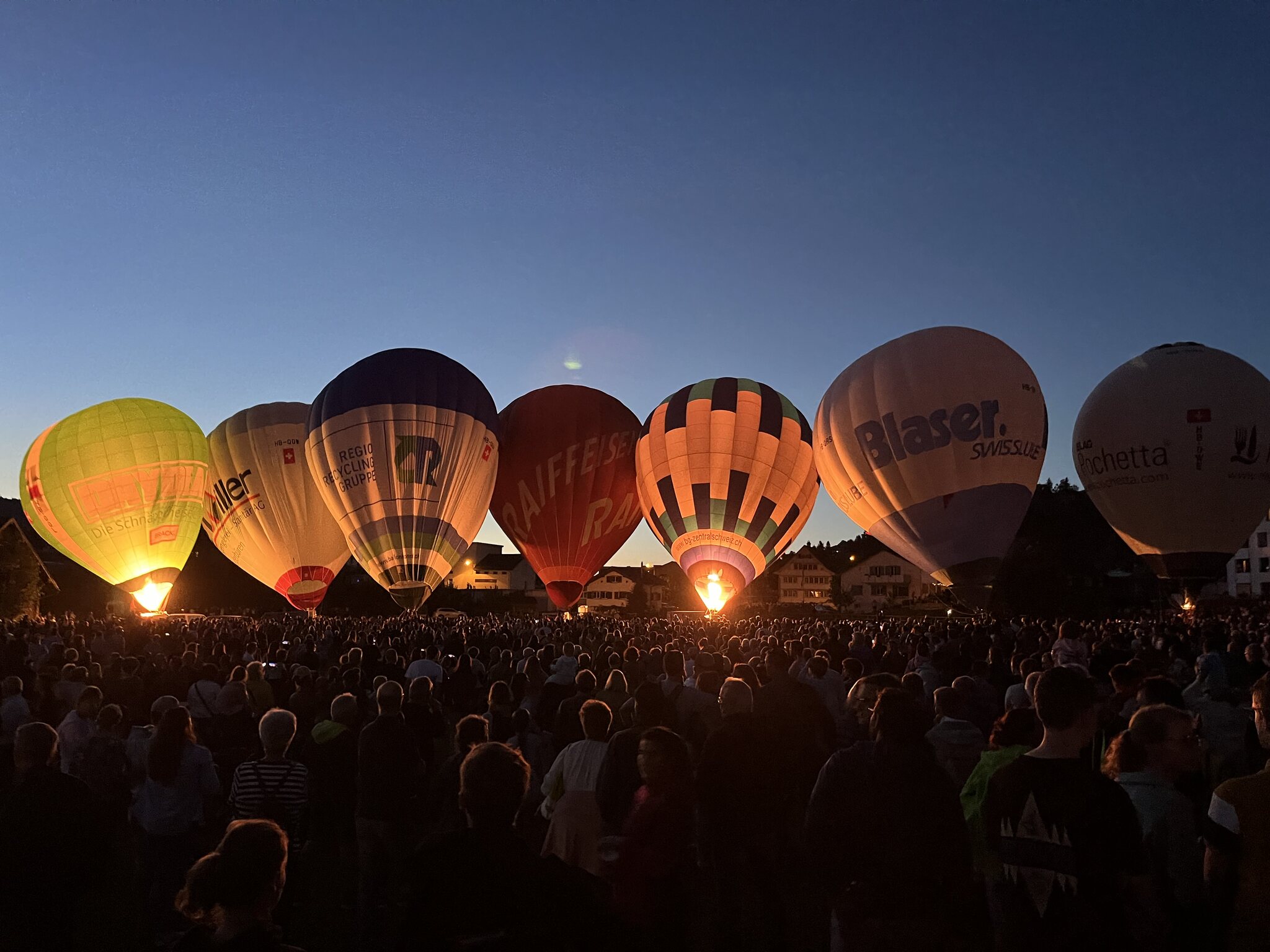 Ich will mir nicht vorstellen, wie voll das im Sommer hier sein muss. Jetzt hat es nur wenige Leute und der See ist angenehm kühl, fast schon kalt. Gegen 17 Uhr starten die Abendfahrten. Und es bietet sich mir die Gelegenheit, dem neuerlichen Gewinner des Gordon Bennet Rennens, der auch mein Pilot im März (Bericht) war, persönlich zu gratulieren. Um 20.30 Uhr dann das Night Glow. Fantastische Bilder. Aber die Musikauswahl ist sehr schade. Die Alphörner zu Beginn sind noch passend und schön. Danach folgt aber völlig unpassende und langweilige Musik. Da müsste man doch pompöse, aufbauende Musik nehmen, die dieses optische Spektakel angemessen untermalen. Da ist noch viel Luft nach oben. Das Gas ist bereits oben