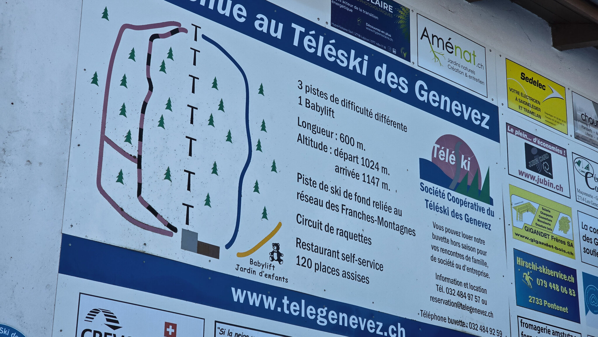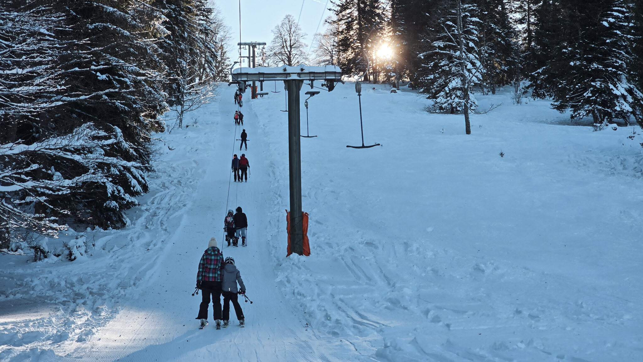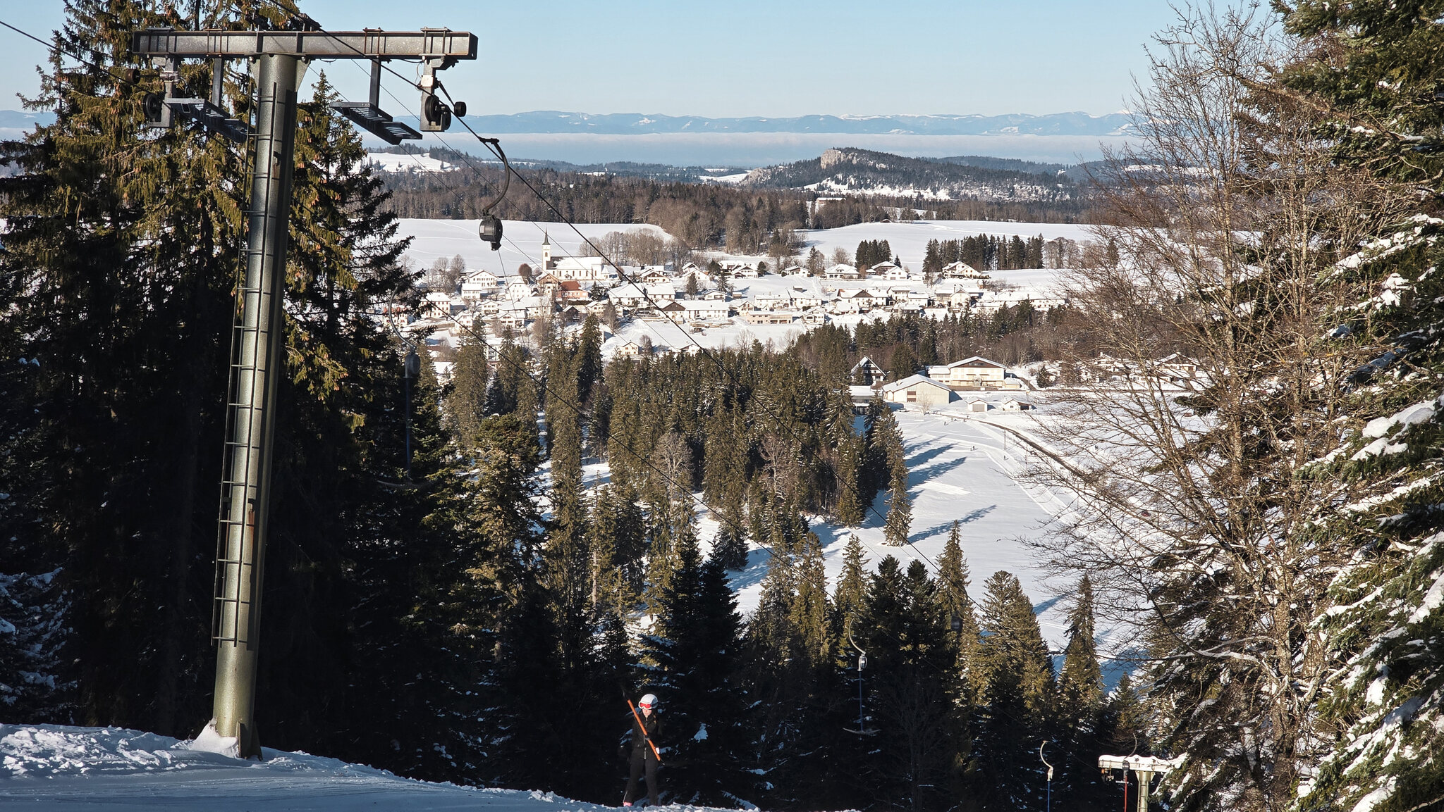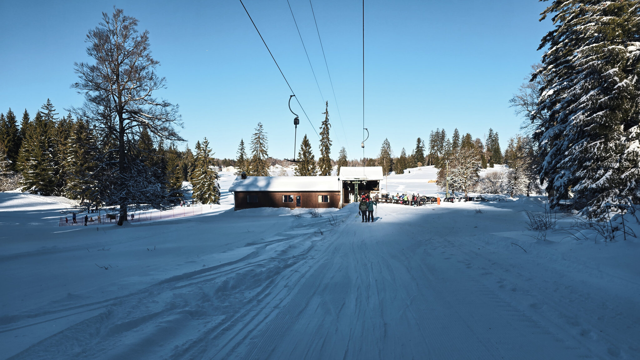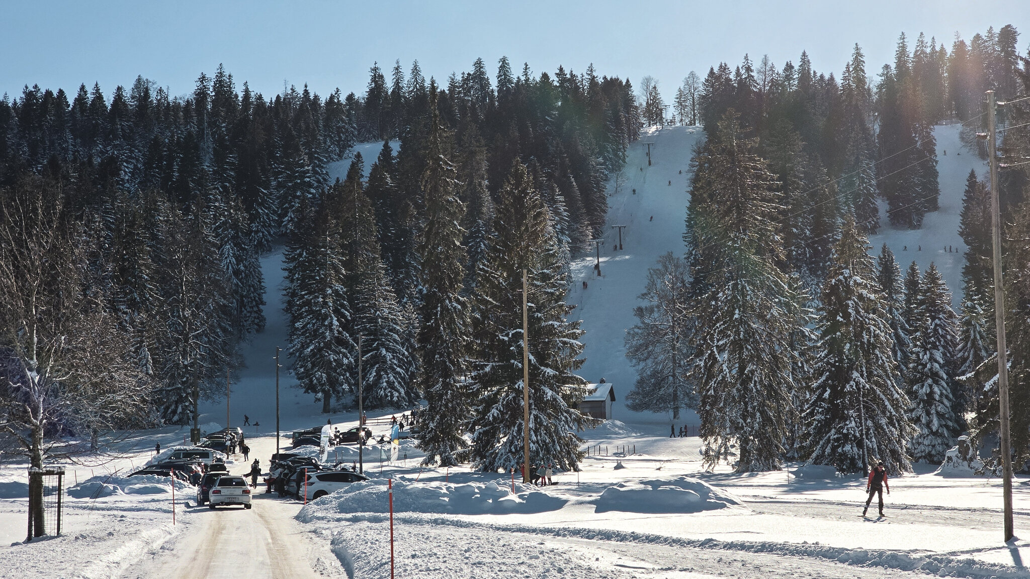 Etwas ausserhalb des gleichnamigen Dorfs versteckt sich der Skilift Les Genevez, ein kleines Relikt aus einer Zeit, als im Jura noch regelmässiger Wintersport möglich war. Der Parkplatz liegt am Waldrand auf rund 1000 Metern über Meer, von hier sind es nur wenige Schritte bis zur Talstation. Eine Bühler-Anlage aus dem Jahr 1970 wartet darauf, die wenigen, aber dafür umso erfreulicheren Betriebstage mit Leben zu füllen. Der Lift überwindet gerade einmal 120 Höhenmeter auf einer Länge von etwas mehr als 500 Metern. Sechs Zwischenstützen genügen, um die kurze, schattige Strecke zurückzulegen. Oben angekommen, eröffnet sich ein kleines, aber reizvolles Pistenangebot. Rechts des Lifts zieht sich eine blaue Abfahrt hinunter, während auf der linken Seite zwei rote Varianten für etwas mehr Schwung sorgen. Wer es noch direkter mag, folgt der inoffiziellen Route entlang der Lifttrasse.