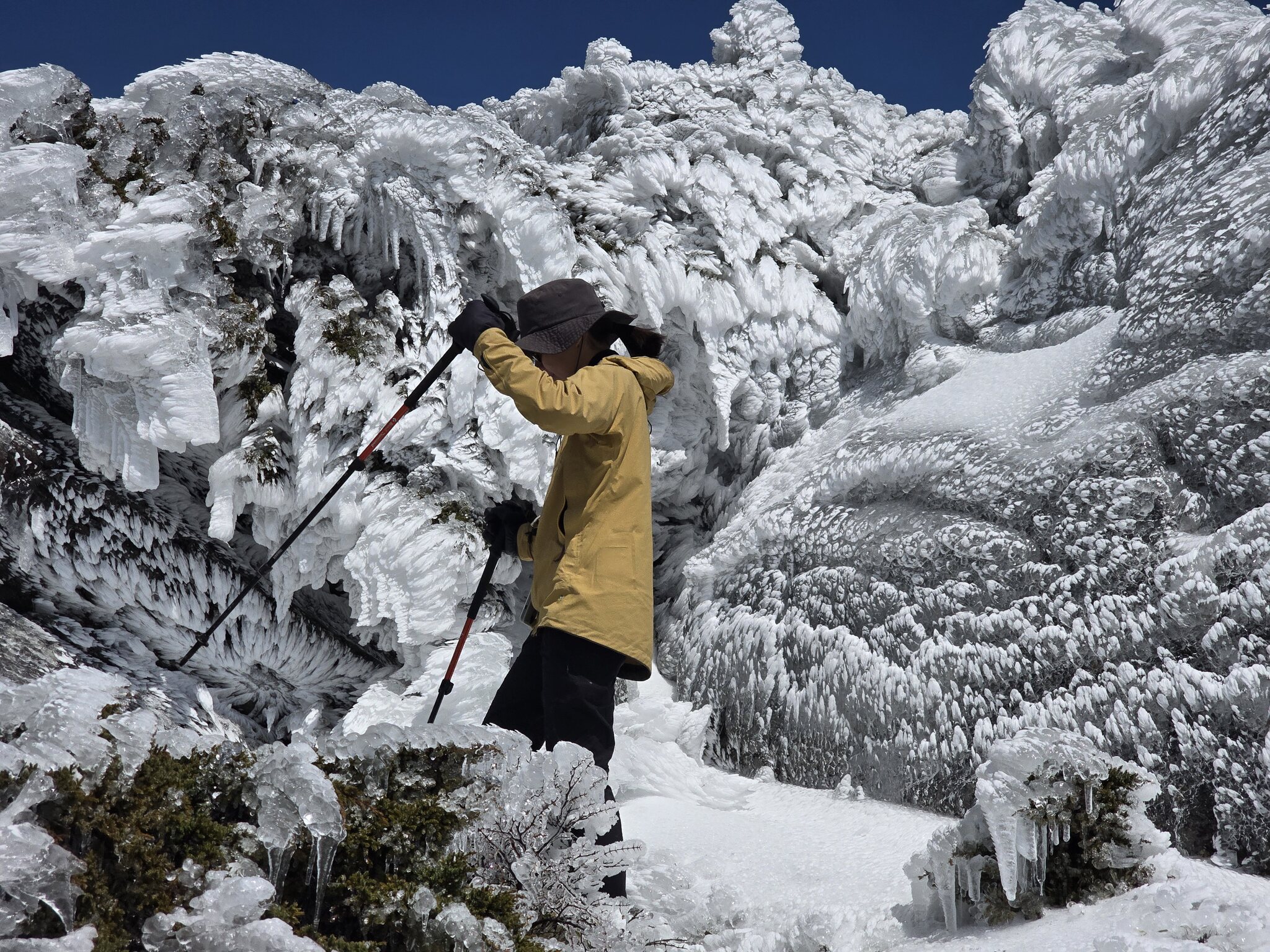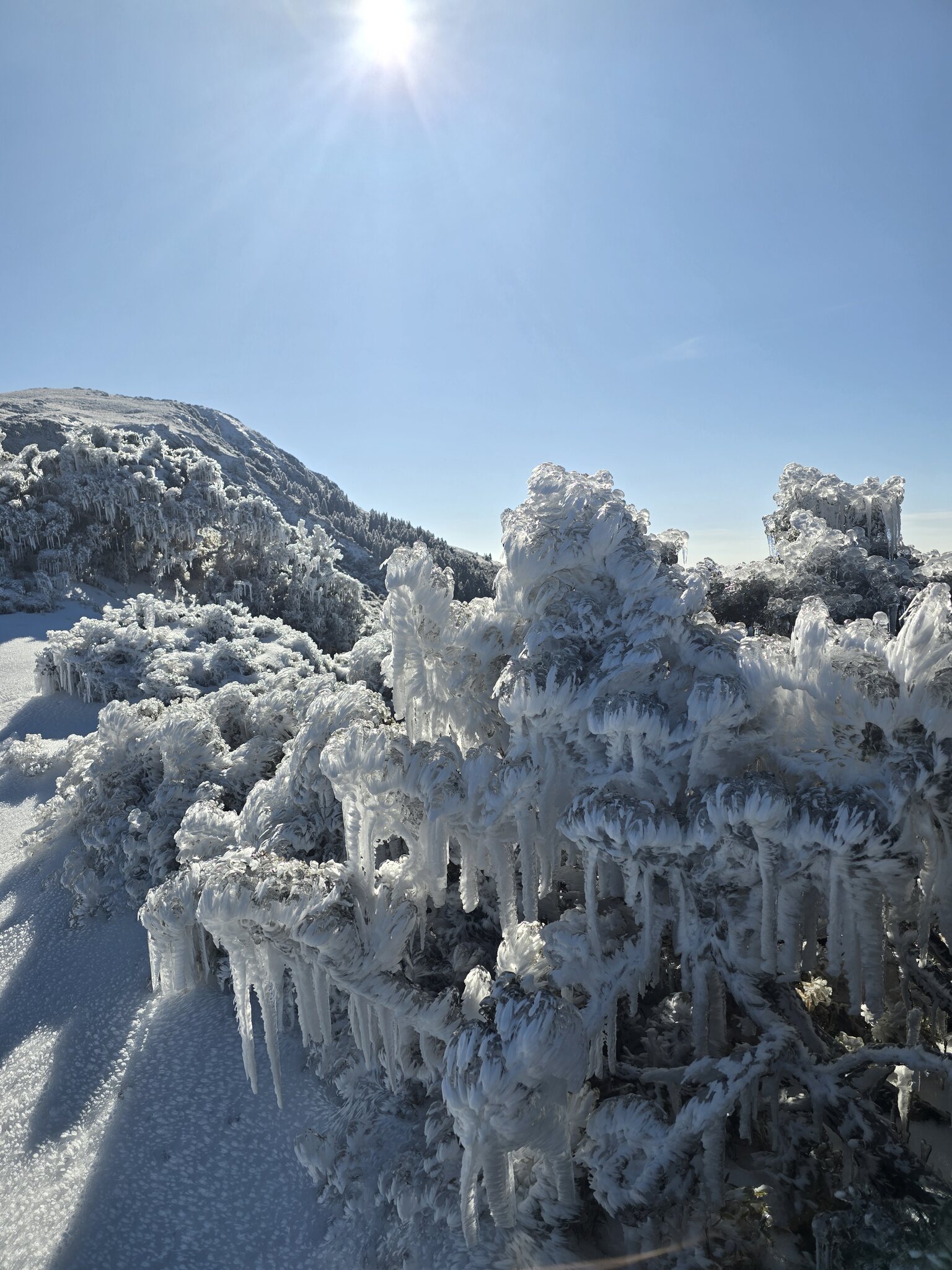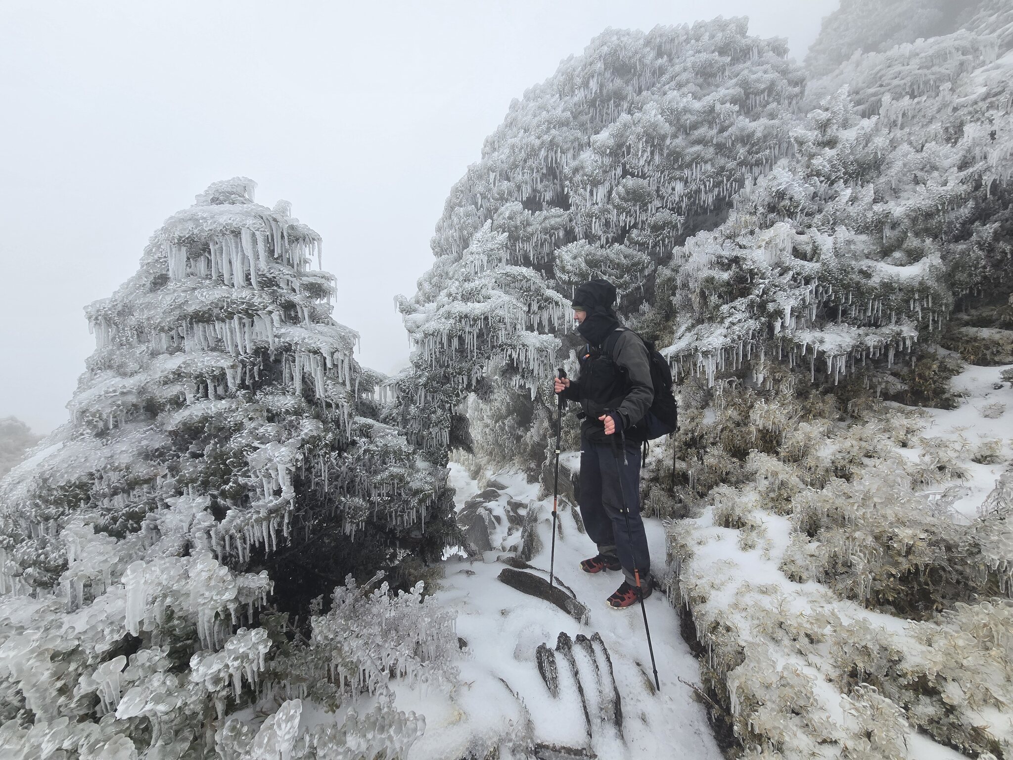 Regen alleine in Taiwan wäre ja kein Problem. Man darf erst ab 350mm/Regen vorhergesagt für 24h die Unterkunft kostenlos stornieren (die Unterkünfte sind vom Staat subventioniert zur Verfügung gestellt um 5-15euro/Nacht, das Problem ist eher einen Platz zu bekommen in Hauptsaison nur per Lotterie möglich). Bei Eis / Schnee ist aber immer kostenlos stornieren möglich da es eh kaum noch passiert. Anfang des 20. Jahrhunderts hatte es noch weiße Berge von Dezember bis Ende Februar... Wir hatten natürlich keine Steigeisen was wir aber angeben mussten bei den Rangern um raufgehen zu dürfen. Mit Stöcken und Vorsicht war es aber gut möglich, da ja zum Glück ganz oben auf dem Eis eine relativ griffige Schicht Graupel war.