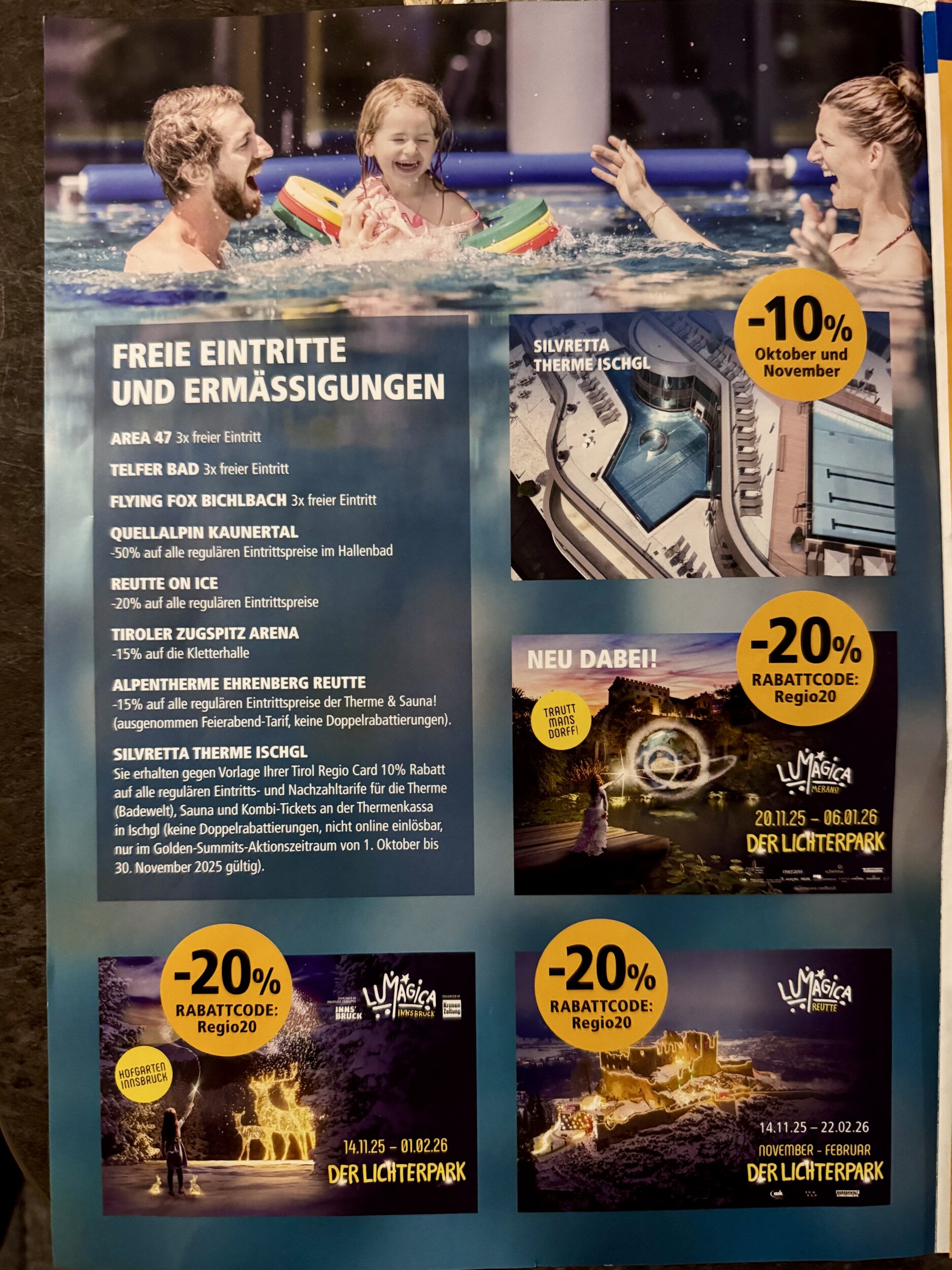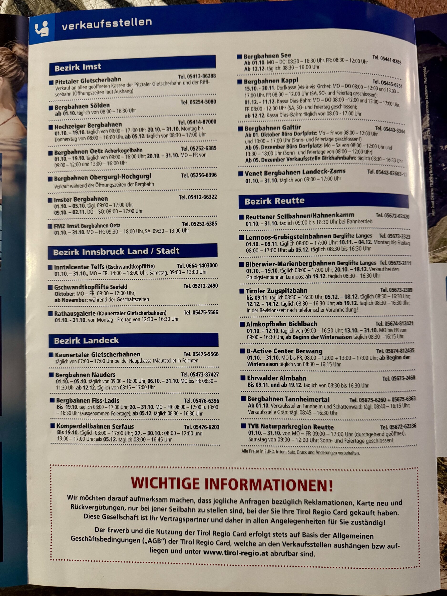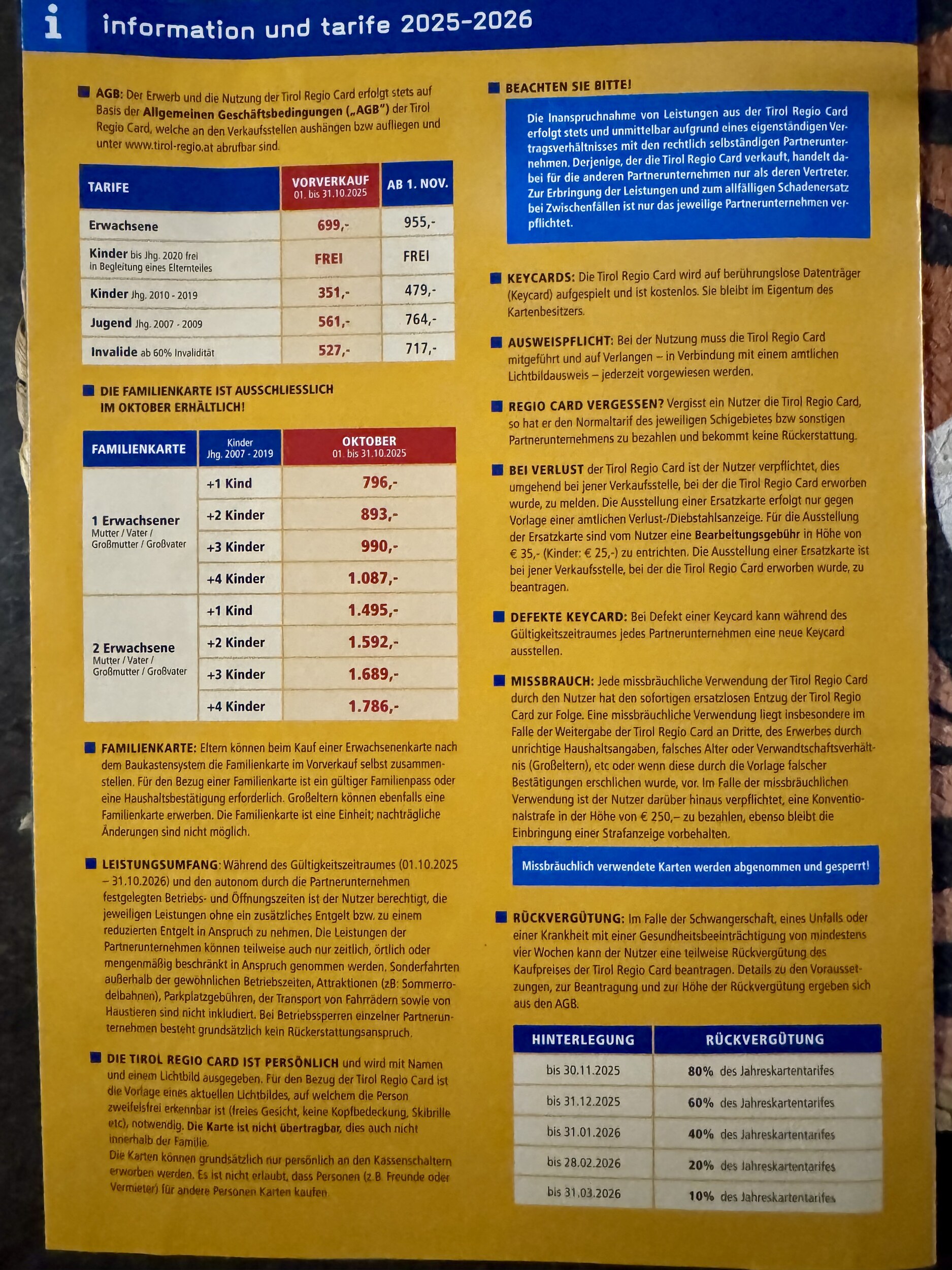 So, anbei endlich mal ein aussagekräftiges Prospekt für die Tirol Regio Card. Einheimische kommen da einfach ran, Touristen wird es schwer gemacht. Am besten mit Kindern, Ausweisen, Fotos und zur Sicherheit noch Geburtsurkunden mitbringen!