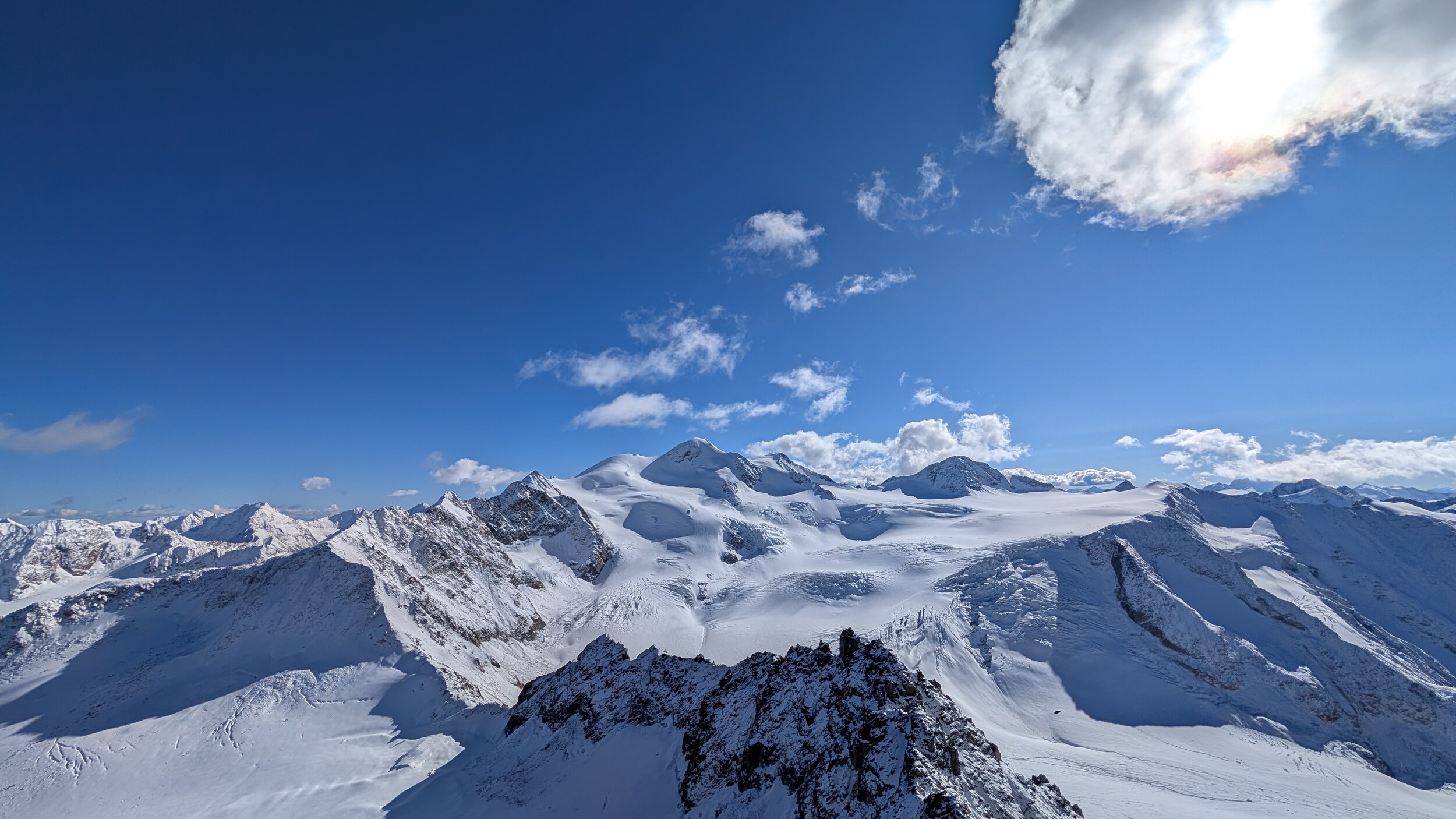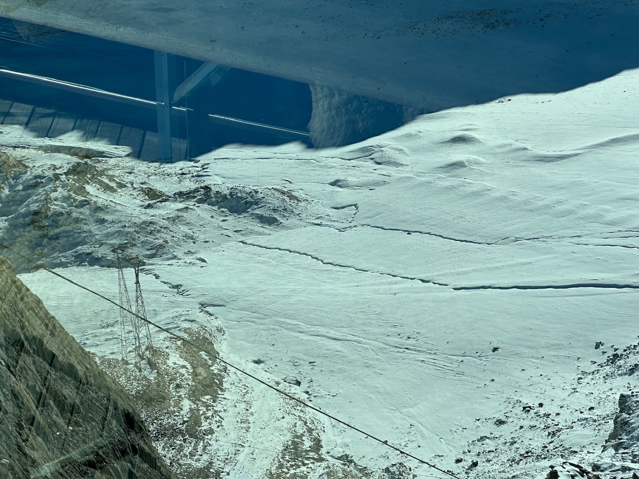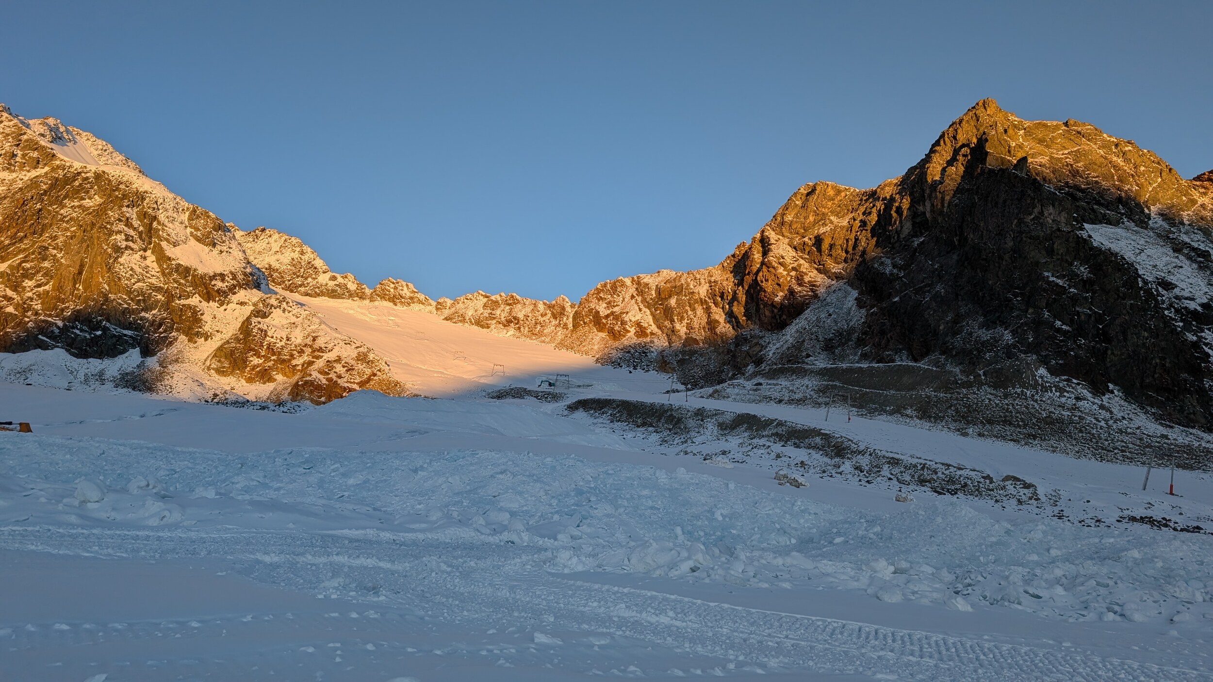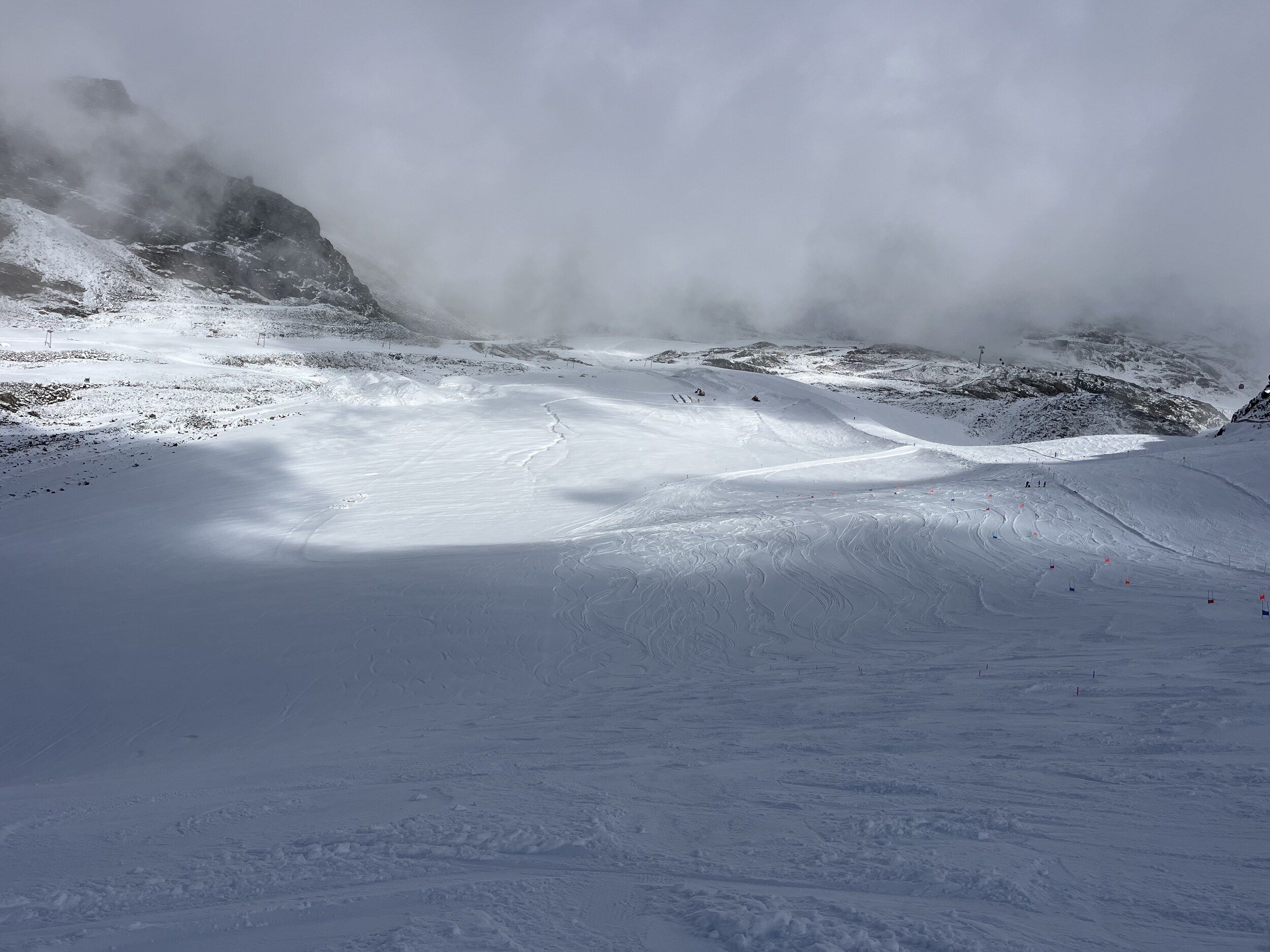 Dafür habe ich auch probiert, ein bisschen Off-Piste zu fahren. Der Schnee dort war gut, aber es hatte zu wenig, um die Spalten und andere Löcher komplett zu füllen. Das wird noch eine Weile brauchen. Trotzdem schöne Aussicht: