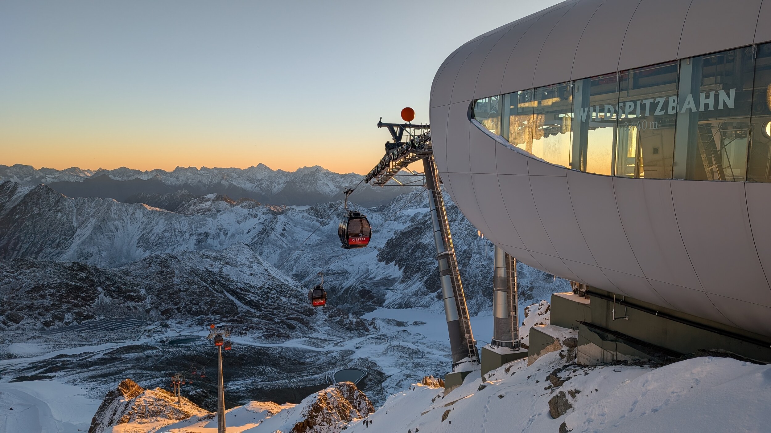 Ich bin um 8 Uhr oben am Wildspitzbahn Talstation angekommen. Das Wetter war eines klassisch grau unten, blau oben:
