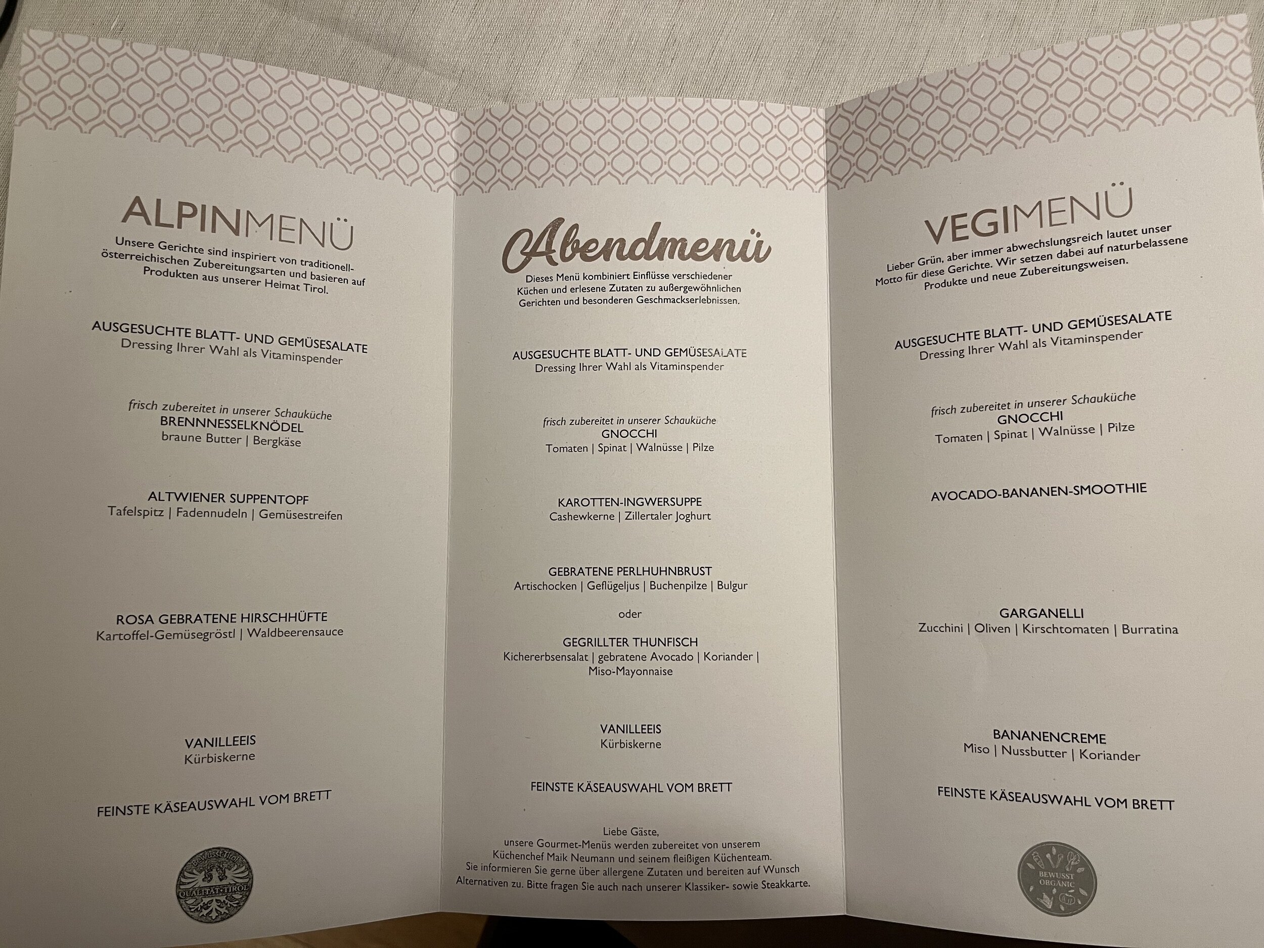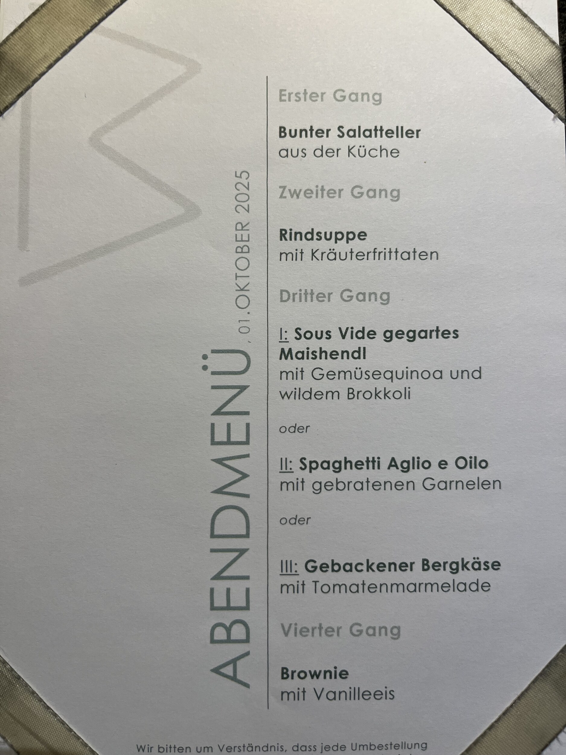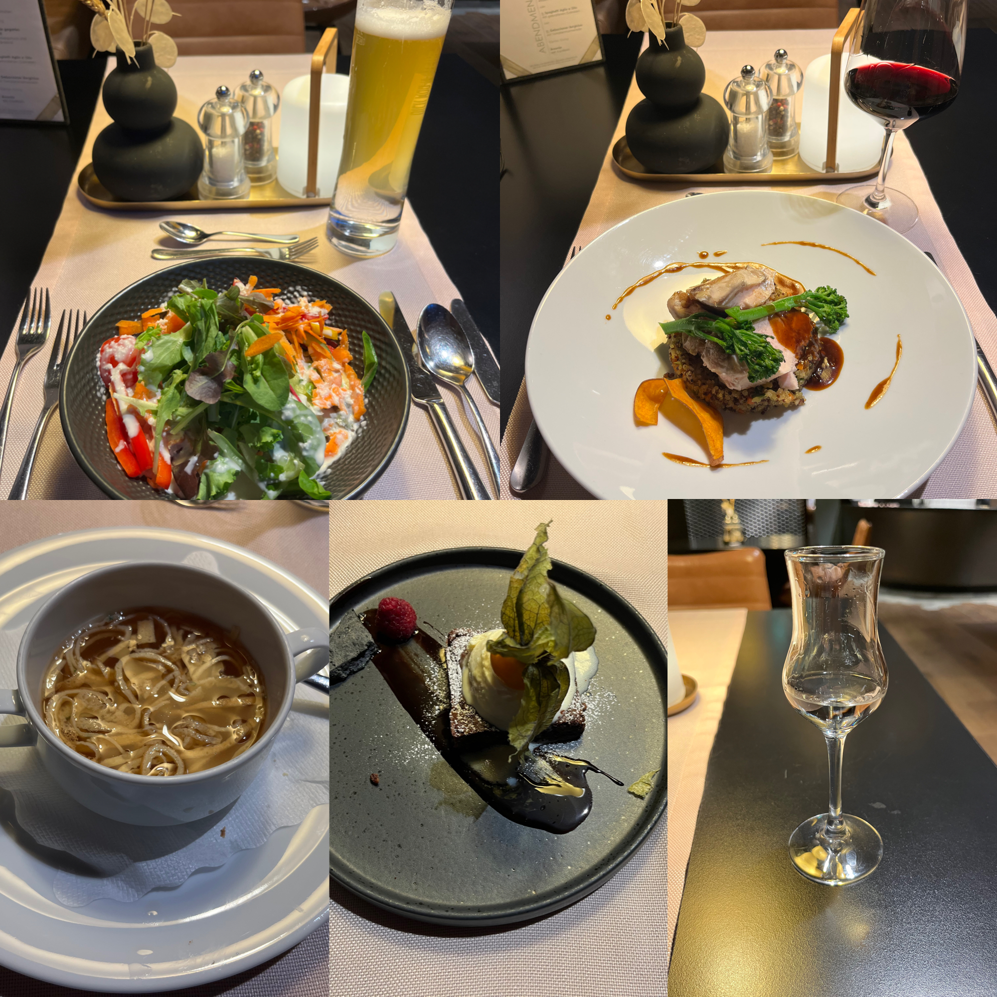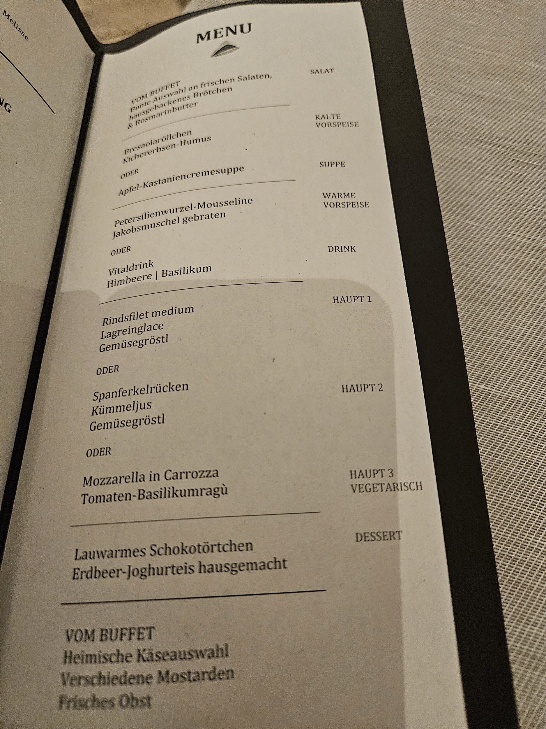 Es ist jetzt nicht so, dass das heutige Menü aussergewöhnlich exklusiv wäre (wobei es Hitparades McDonalds Challenge-Einträge aber alleweil toppt), sondern das ganze Hotel hier in Sölden hat etwas ganz besonderes: ein aussergewöhnlich gutes Preis-Leistungs-Verhältnis. Für gerade mal 101.- (über Booking, mit Genius-Rabatten) bin ich hier in einem 3*S Hotel direkt an der Talstation der Gaislachkogelbahn in einem Doppelzimmer zur Alleinbenützung untergekommen. Topmodernes Hotel mit grosszügiger Wellnessanlage (Sauna, Biosauna, Dampfbad, Infrarotgrill, grossem Ruheraum inkl. Tee, Sirups, Früchten, Snacks), Viergangmenü und Frühstücksbuffet. Schön, dass es in Sölden sowas noch gibt, muss ich mir merken.