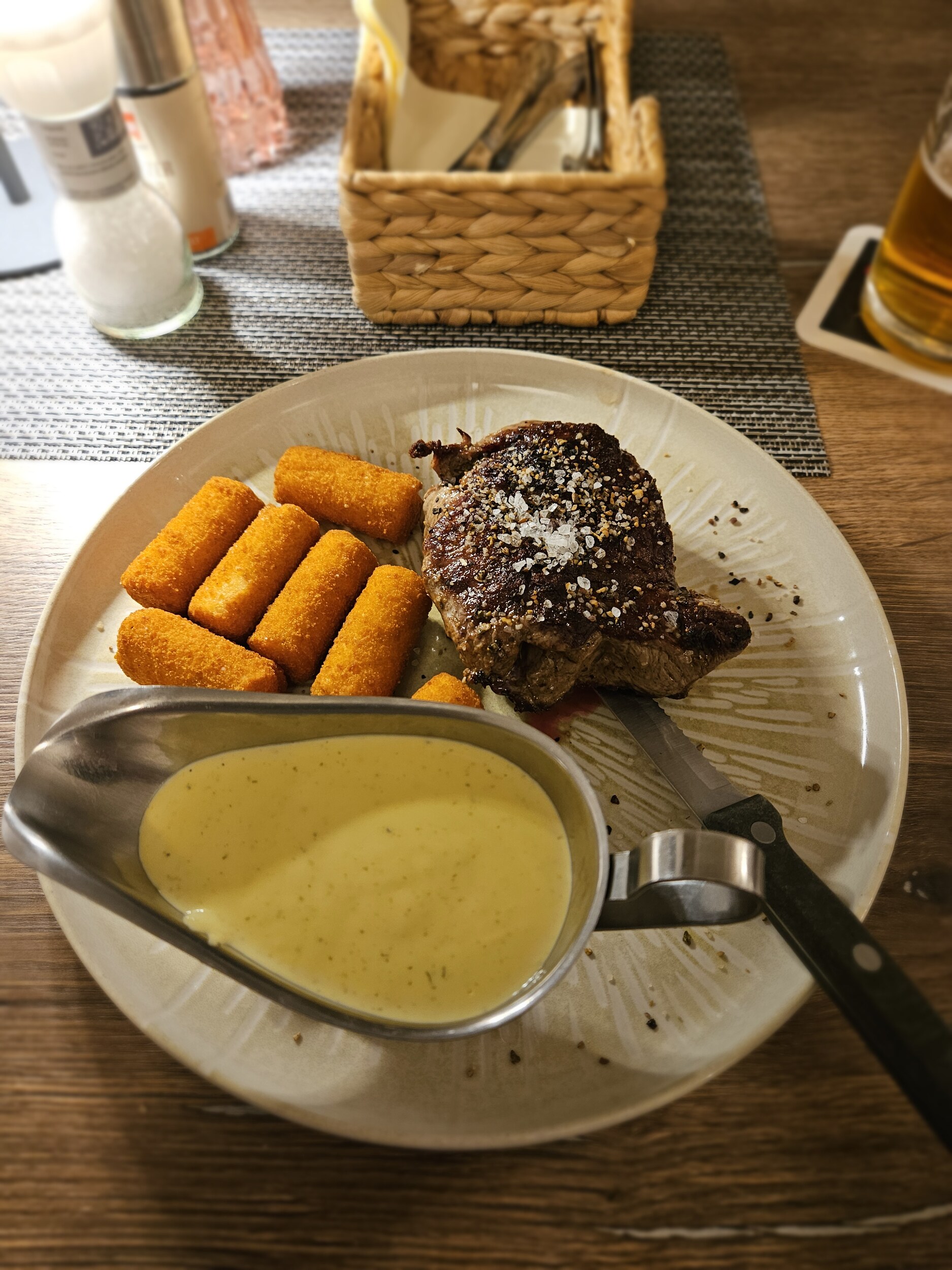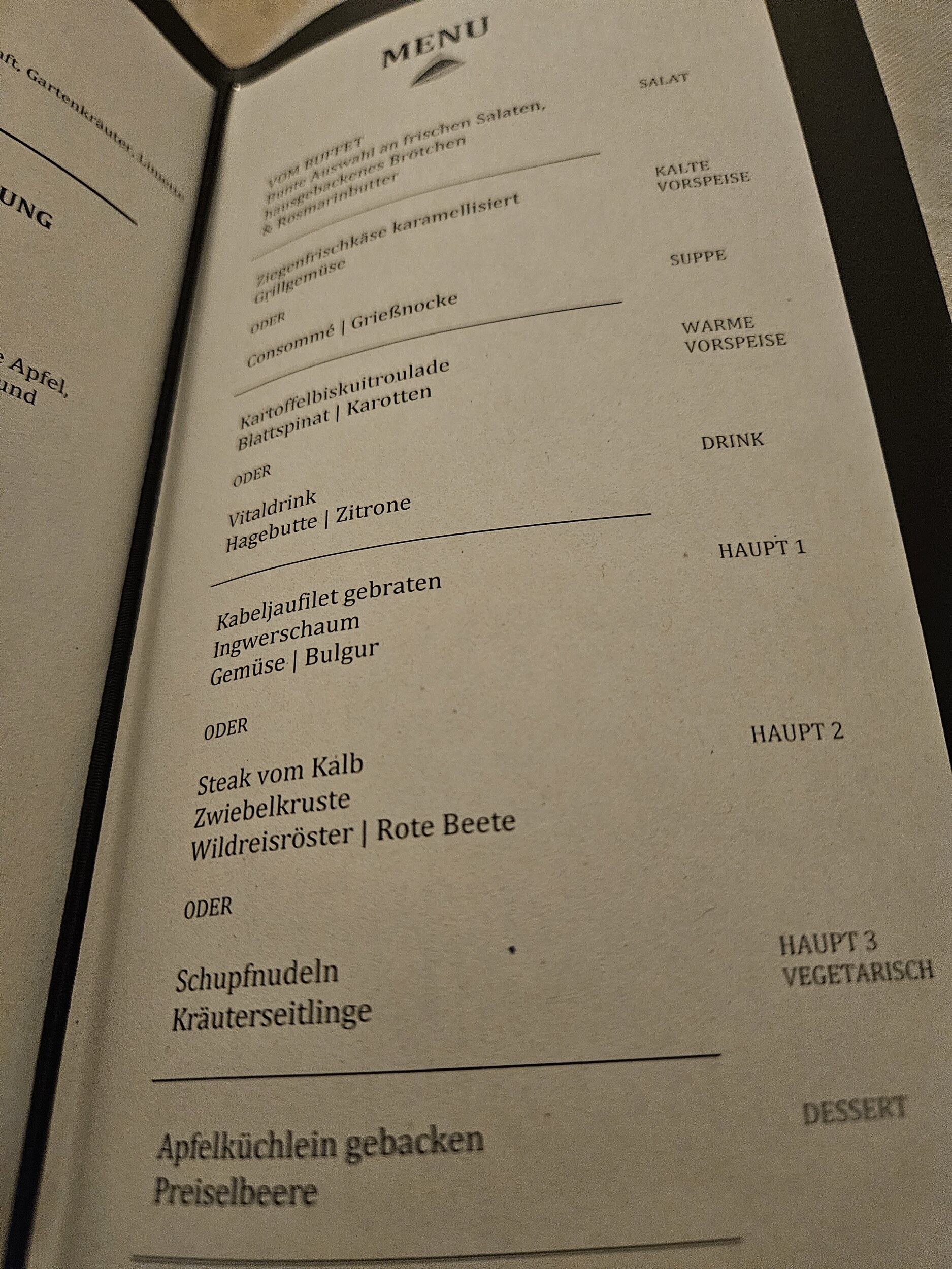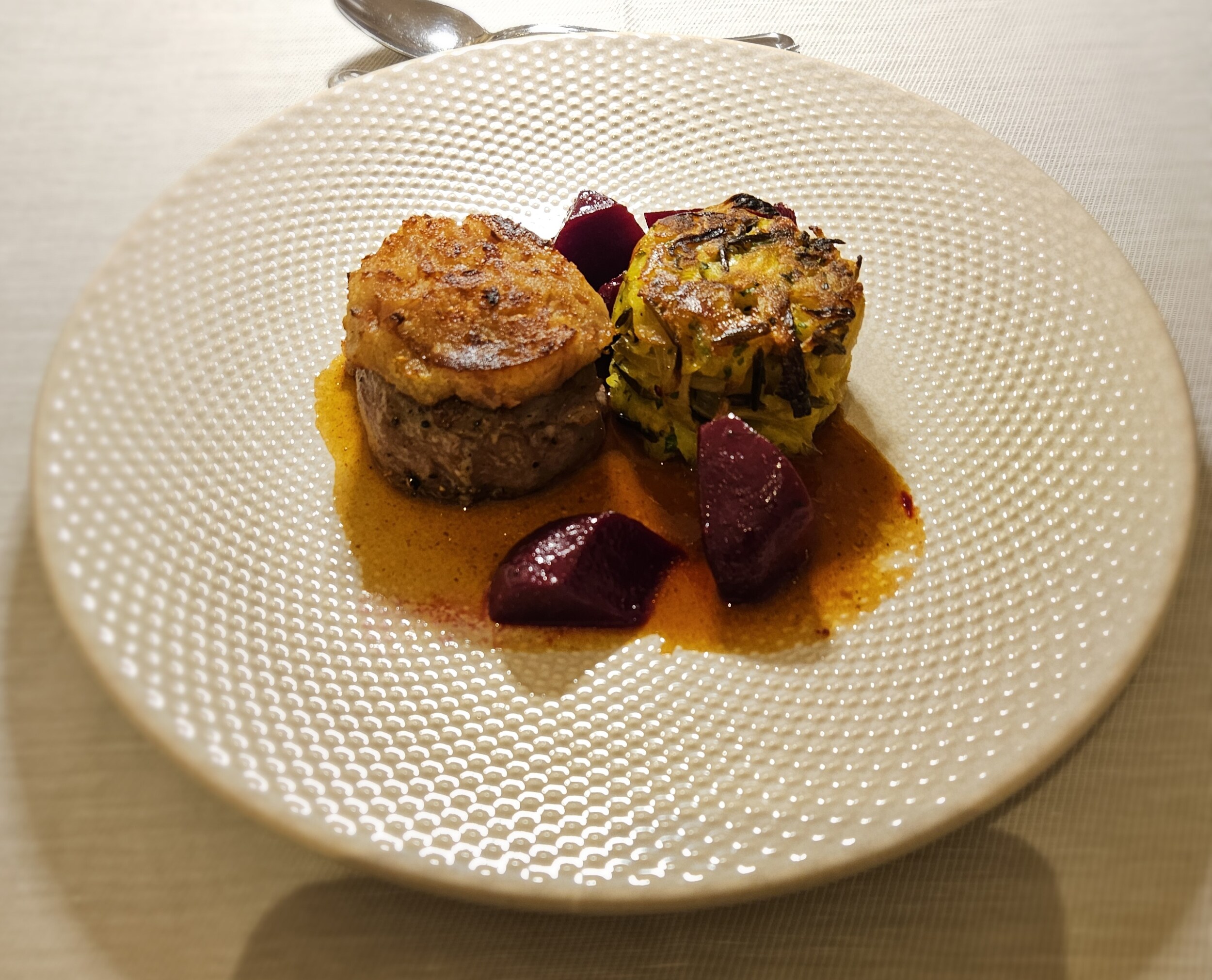 Nach dem Salat, Consommé mit Grießnocken, Bisquitröllchen mit Spinat und als Hauptspeise Kalbssteak unter einer Zwiebelkruste mit Wildreisrösti. Genau wie die Apfelküchlein zum Dessert wieder auf gewohnt gutem Niveau
