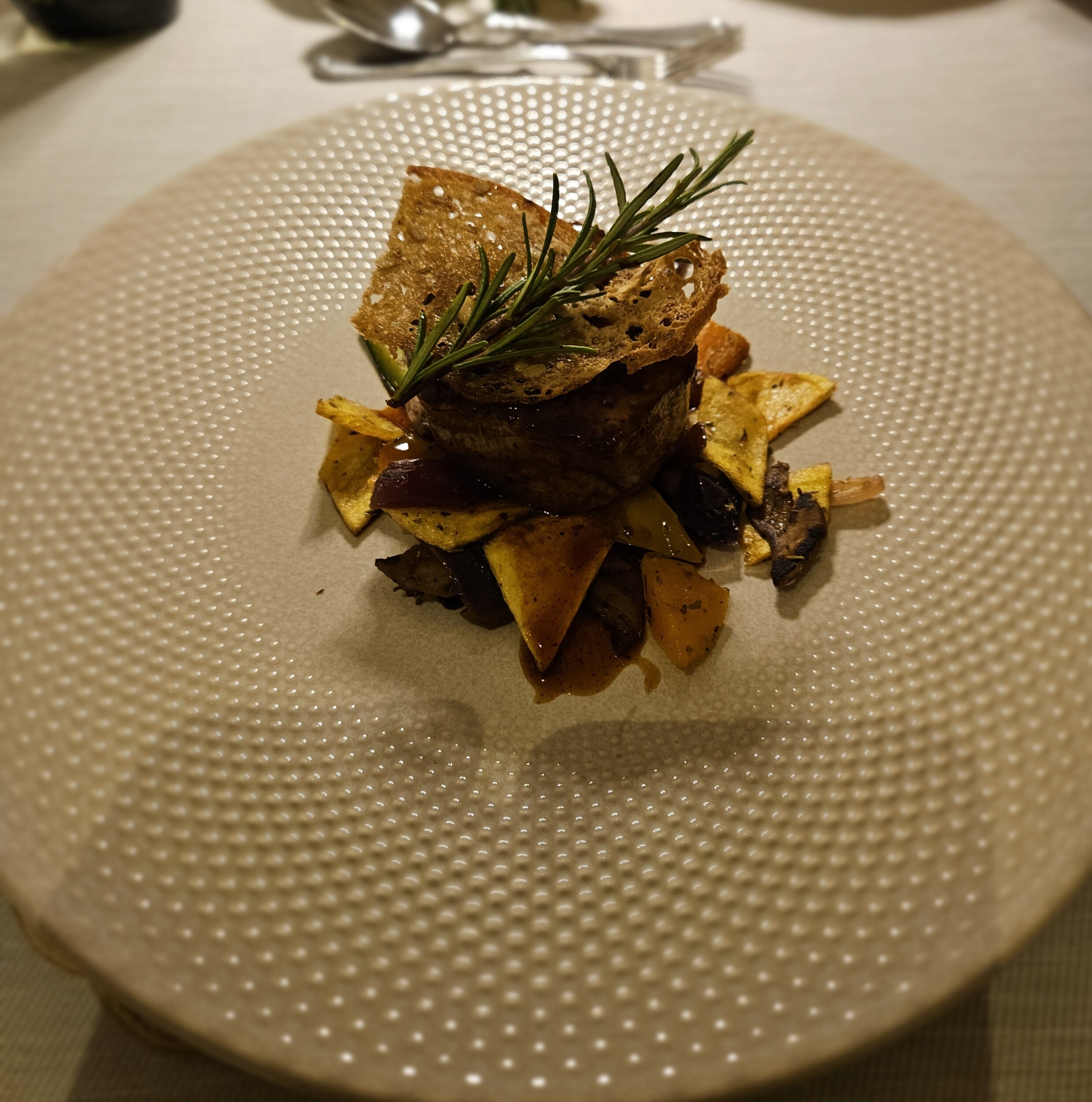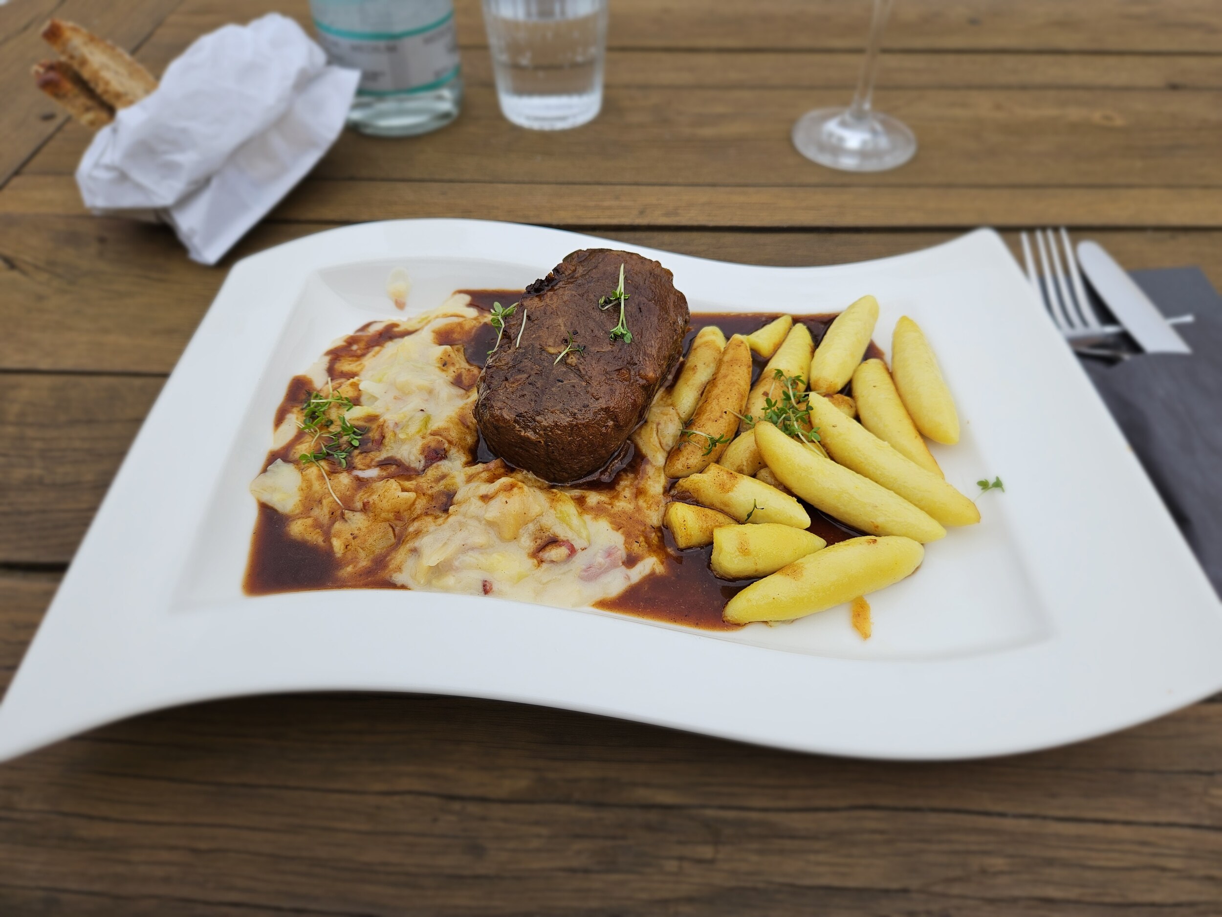 Das Rinderfilet auf Gemüse-Gröstl, bei dem mir Chef Thomas Gesellschaft leistete, war auch wieder über jeden Zweifel erhaben. Das sagte ich ihm dann auch; sein Schwager ist der Küchenchef und er und sein Team machen das handwerklich wirklich gut