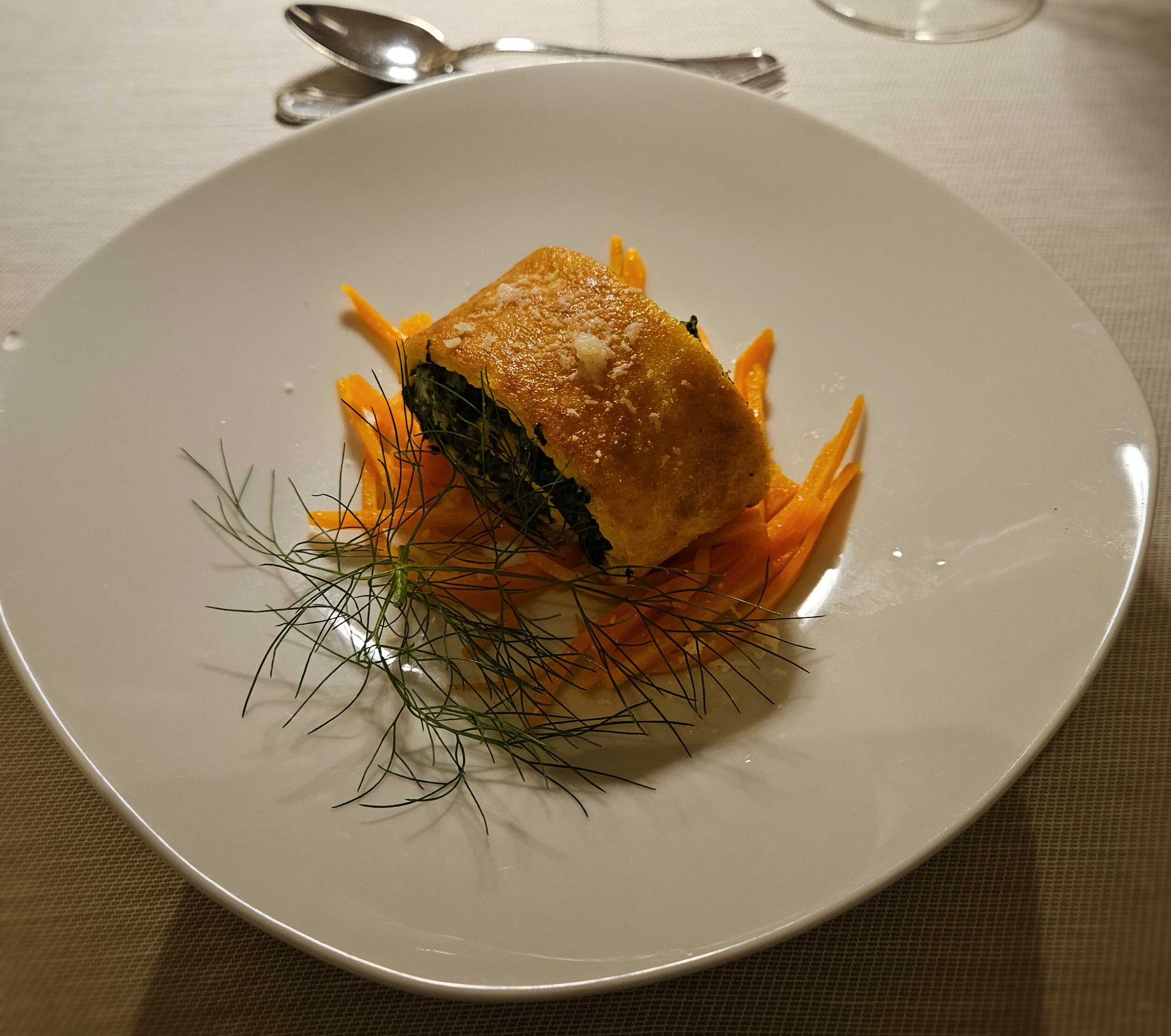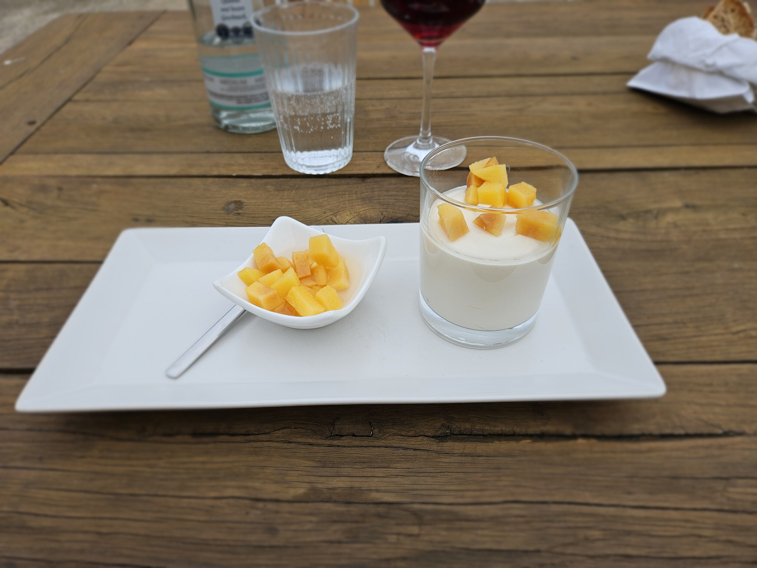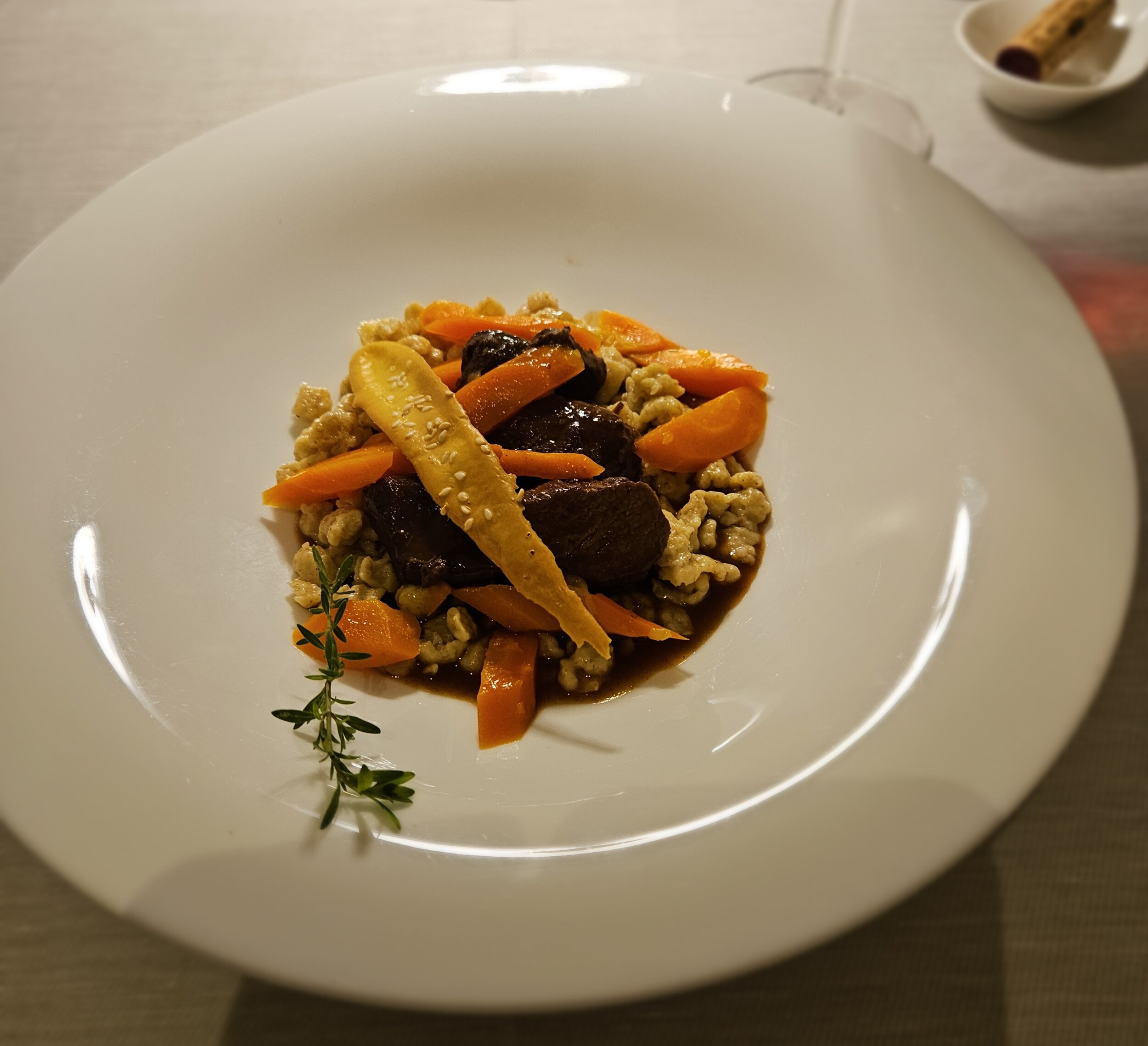 Begleitet wurde das ganze von einem 2021er Blauburgunder Mazon von Brunnenhof des Kurt Rottensteiner mit 14 Vol%. Empfehlung vom Chef, ähnlich dem Libra vom Kränzelhof, mit noch etwas mehr Sandelholz im Duft und neben Kirsche Anklänge von Preißelbeeren mit einer schönen Säure.