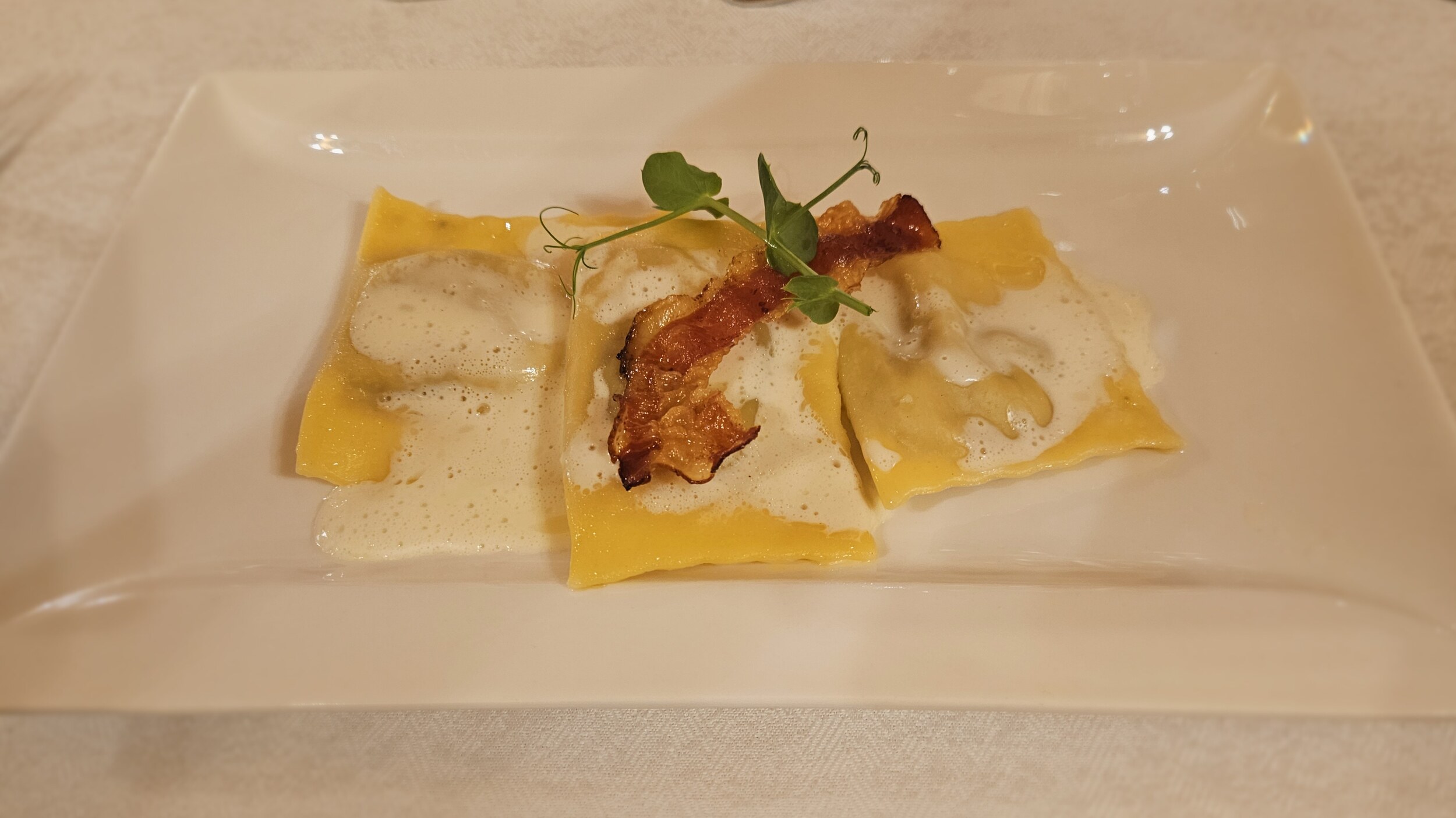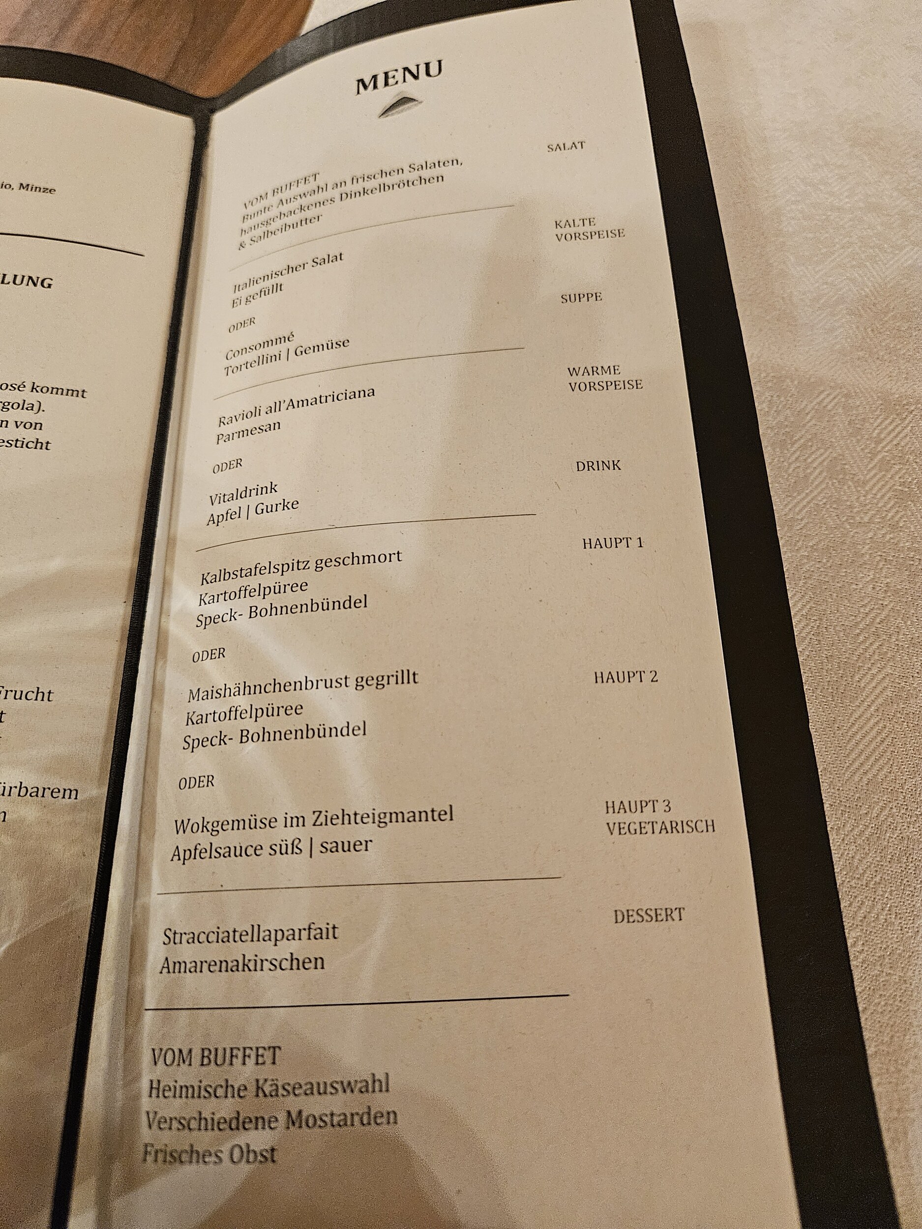 Nach dem Salat vom Buffet, den ich nicht verewigt habe, folgte eine schöne Consommé mit Einlage und Ravioli Amatriciana. Gewohnt geschmackvoll. Als Hauptgang der butterzarte Kalbstafelspitz mit einer wieder tollen Soße; zum reinsetzen. Auch das Straciatella-Parfait war über jeden Zweifel erhaben und vom Käsebuffet gingen dann nur noch Teile.