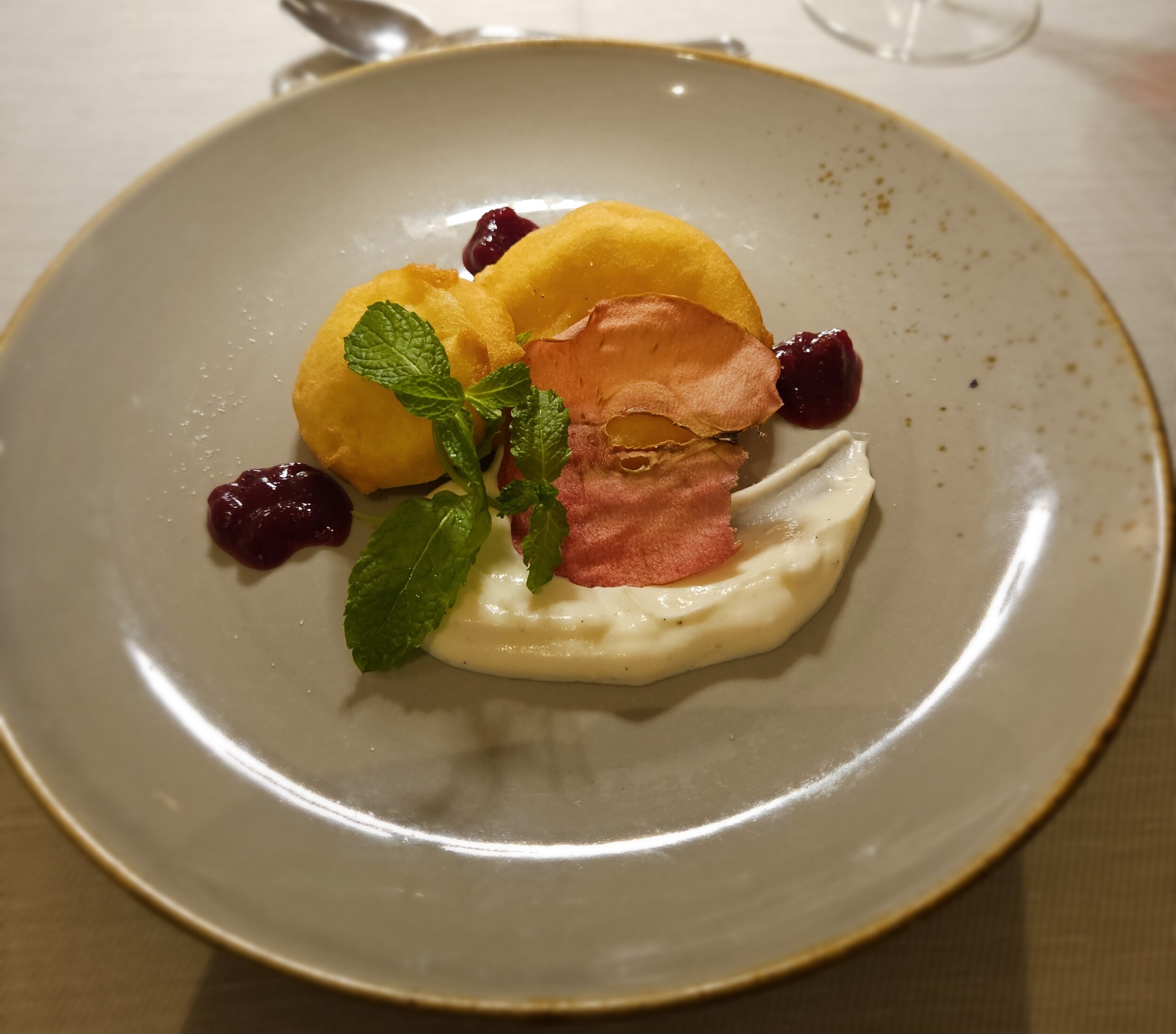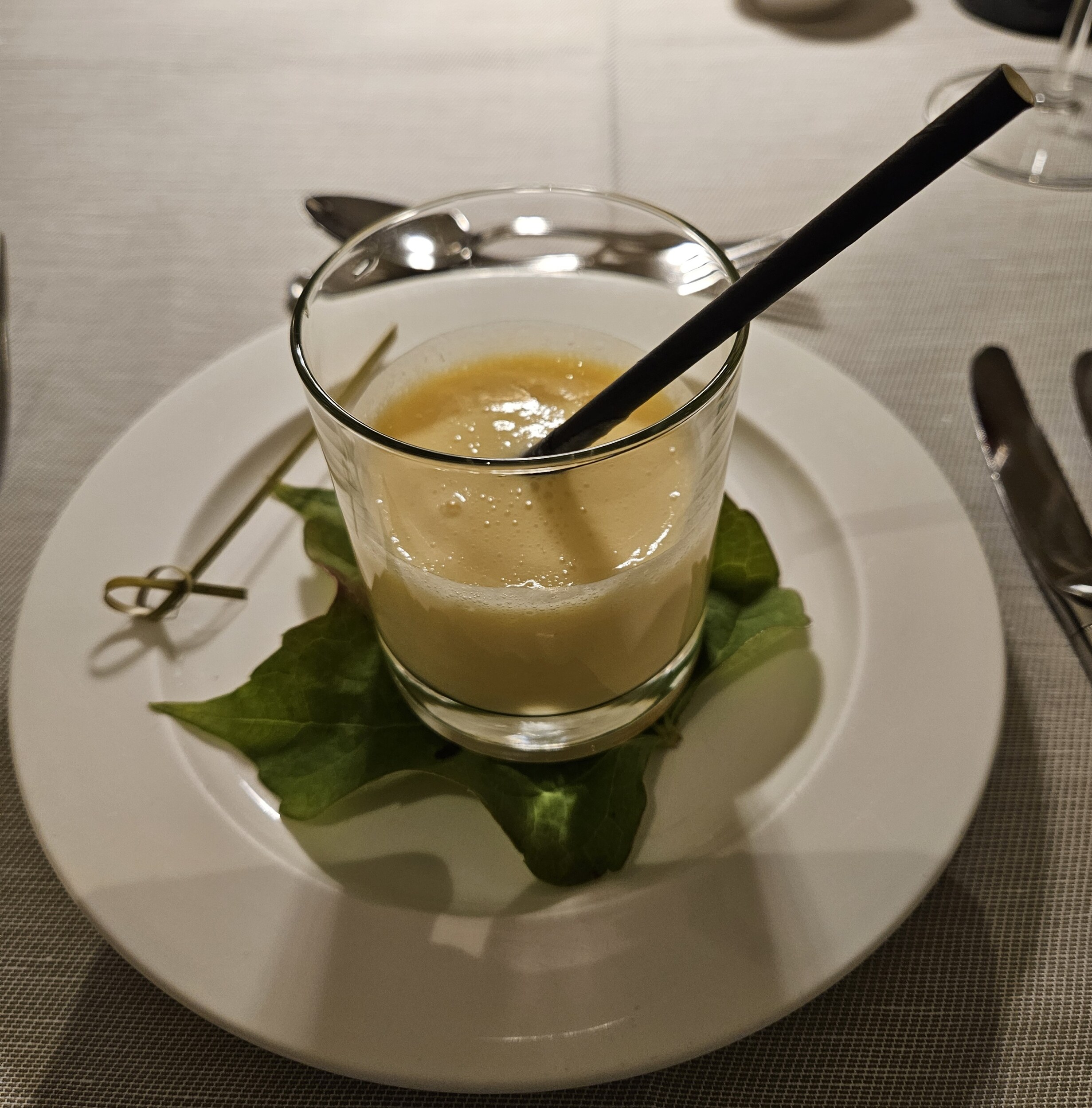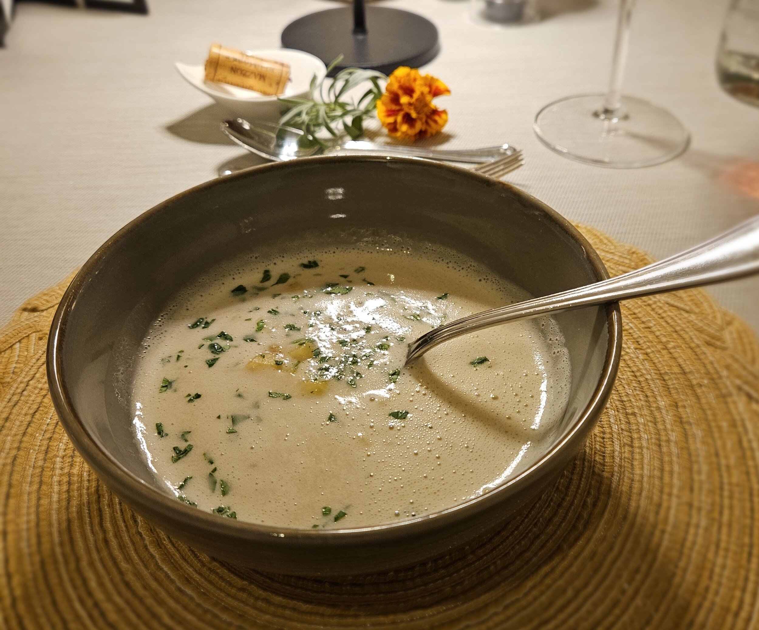 Daher geht es weiter mit der Apfel-Kastanien-Suppe, gefolgt von der Petersilien-Mousseline mit gebratener Jakobsmuschel.