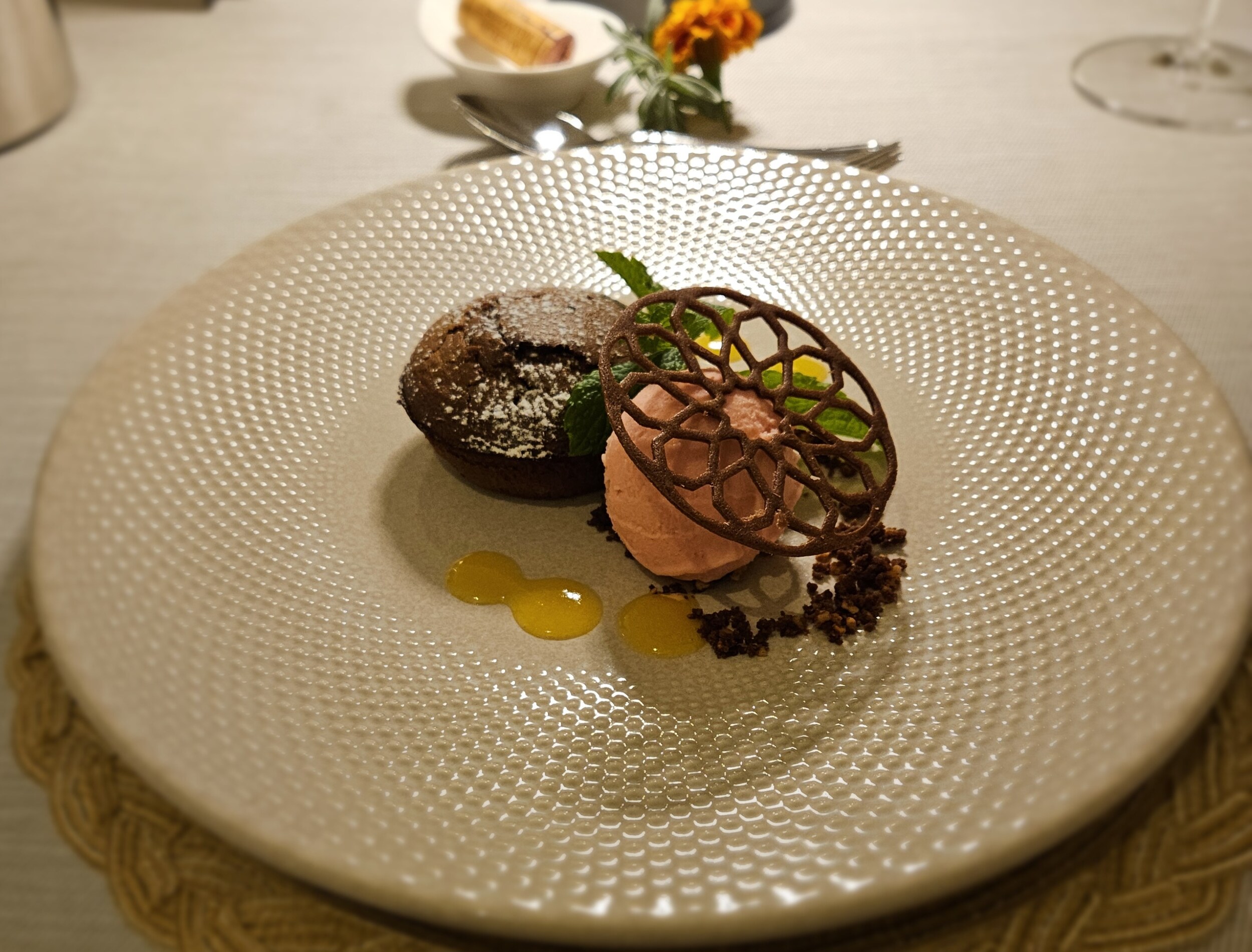 Zum Abschluss lauwarmes Schokotörtchen mit selbstgemachten Erdbeer-Joghurt-Eis und Käse