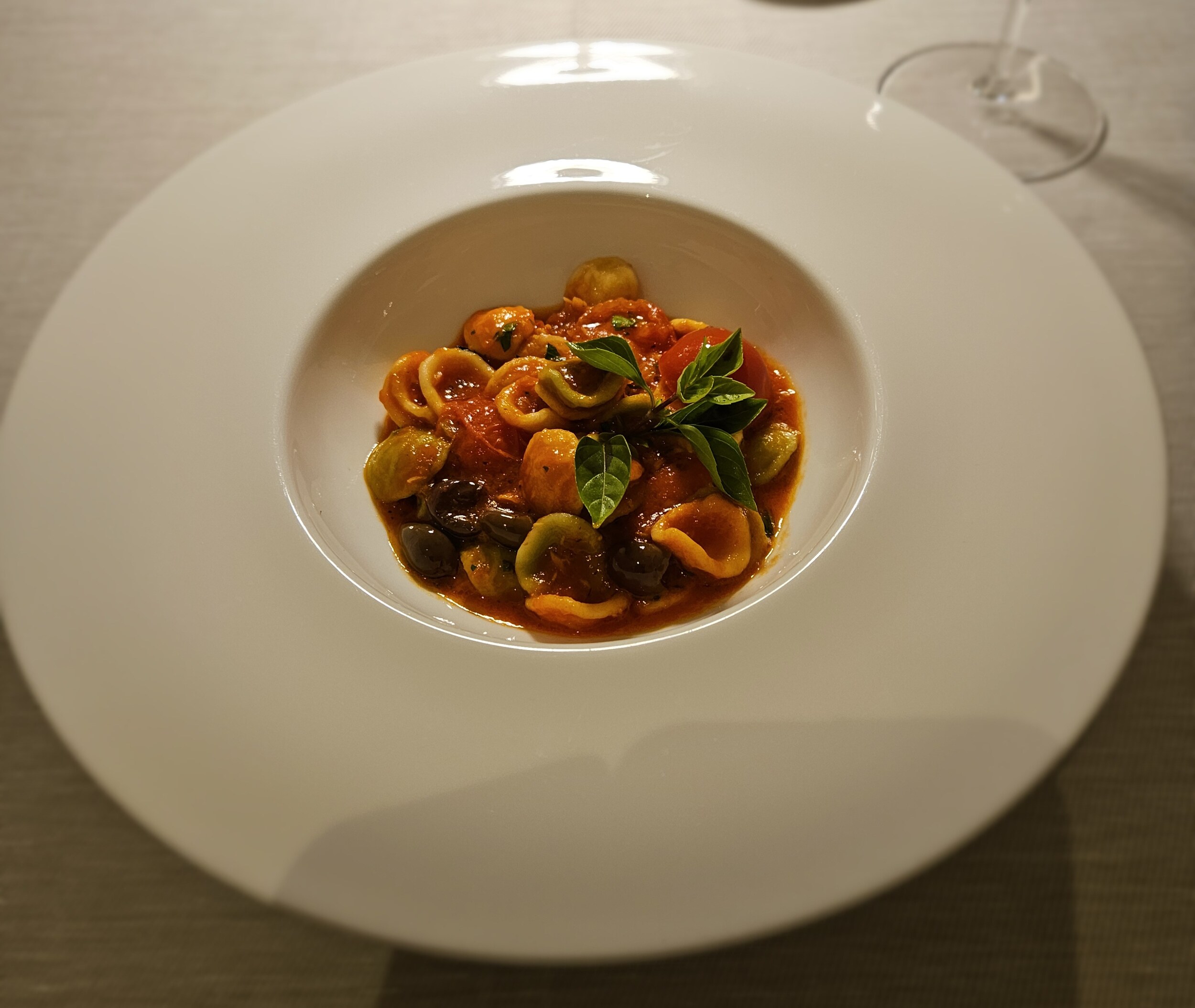 Nach dem nicht fotografierten Salat gab es eine leckere Topinamburcremesuppe und Oricchiette mit Oliven und Thunfisch.